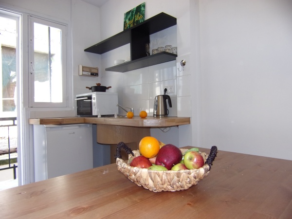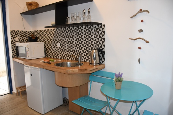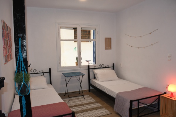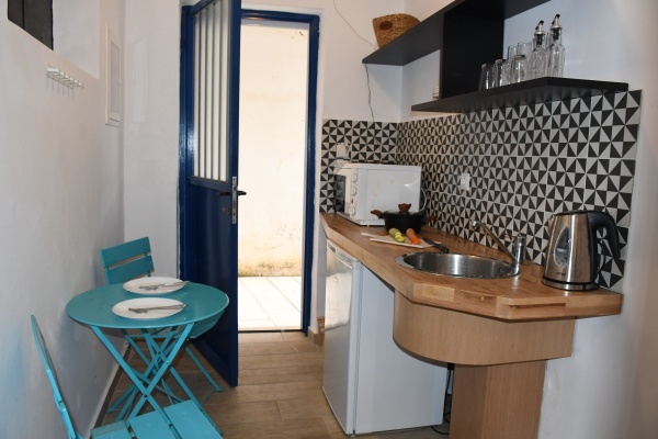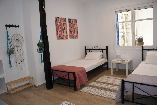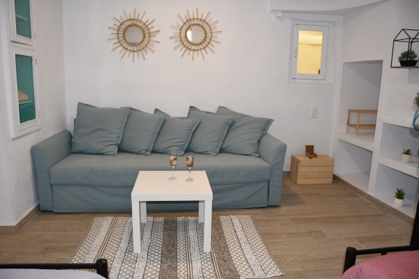 דירת סטודיו עם 2 מיטות יחיד, ספה הנפתחת למיטה זוגית, חדר רחצה עם שירותים, מטבח מאובזר עם תנור, כיריים חשמליות, מקרר, כלי מטבח ופינת אוכל.