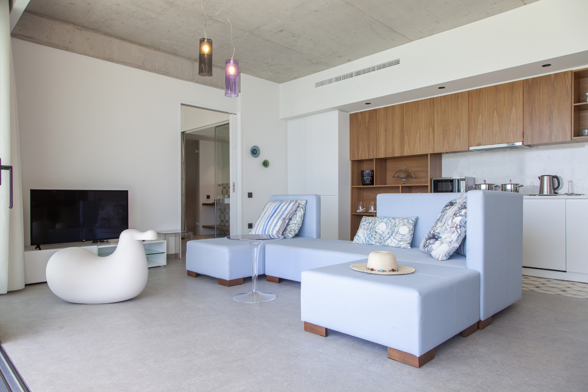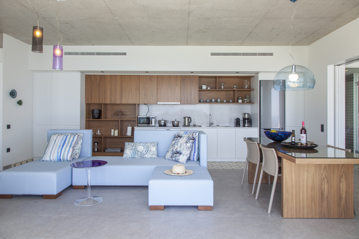 The villa is part of a complex of cave villas on the mountainside above the bay, each villa having its own privacy and open sea views.