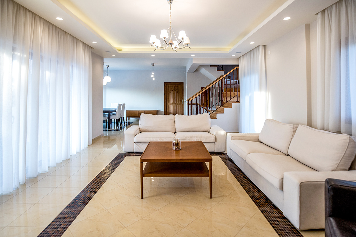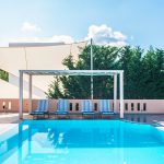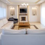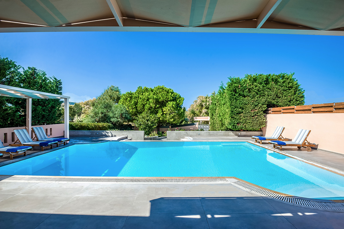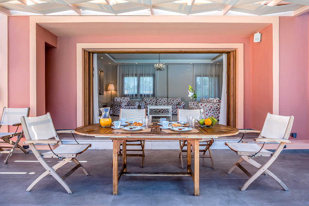 פינת מגורים גדולה עם סוויטת טרקלין יוקרתית ונוחה עם דלתות זכוכית גדולות המובילות לאזור הבריכה ומעניקות אור טבעי , פינת אוכל עם נוף לבריכה ומטבח מאובזר ושירותי אורחים.