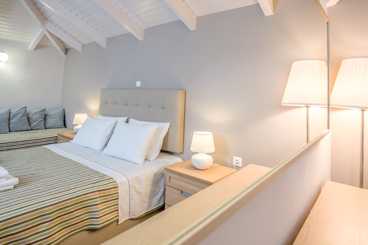 קומה עליונה : חדר שינה הורים בסגנון לופט מרוהט עם מיטה זוגית ,מיטת יחיד מרפסת פרטית עם נוף לים.