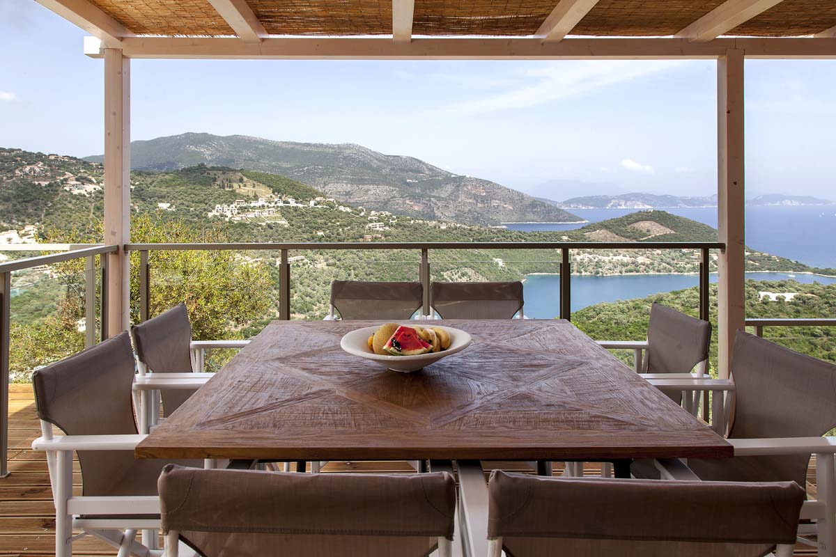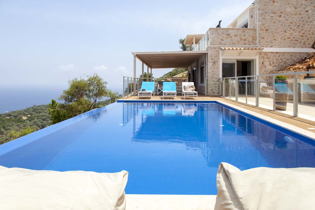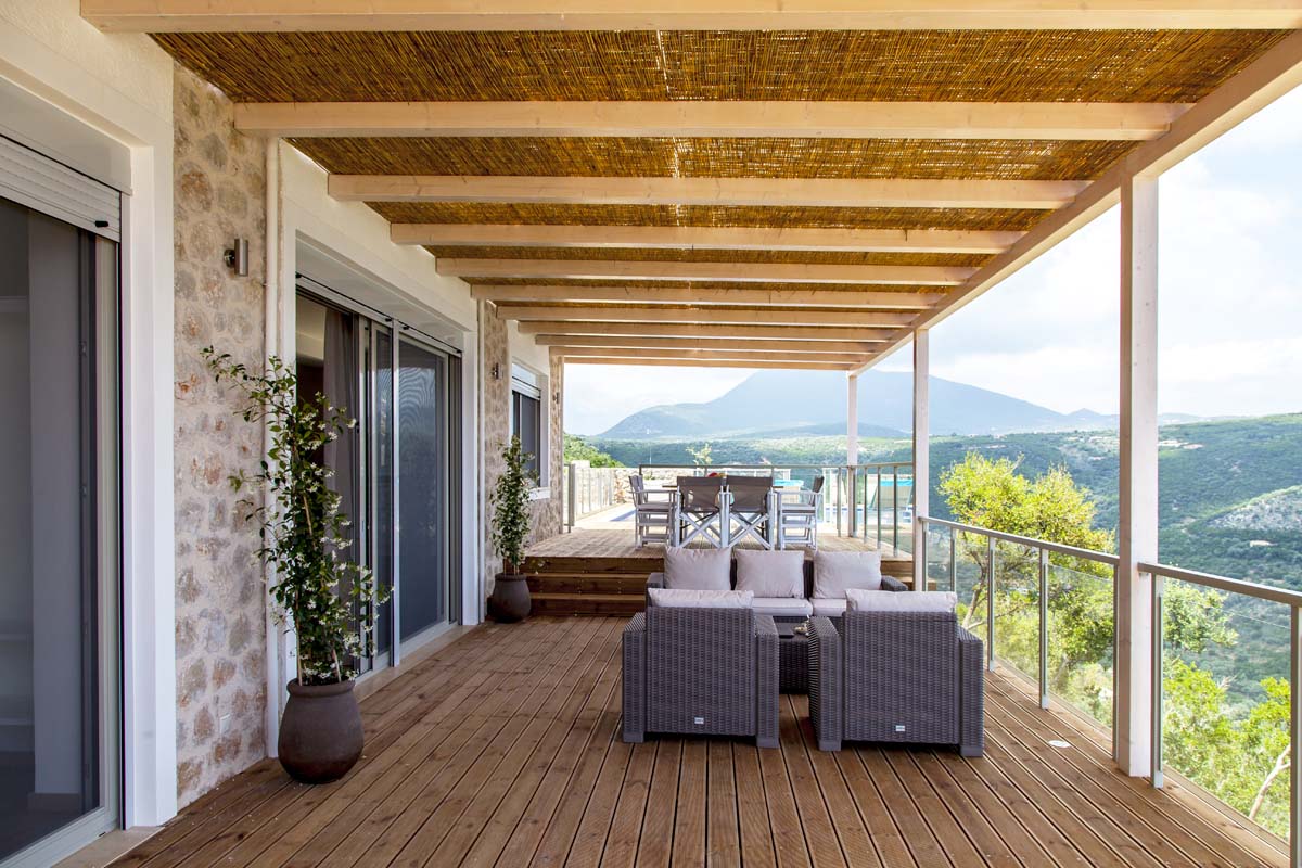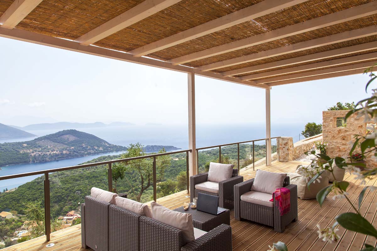 built of local stone with a tree about 120 square meters high on the side of the mountain above one of the magical coves on Lefkada Island.
