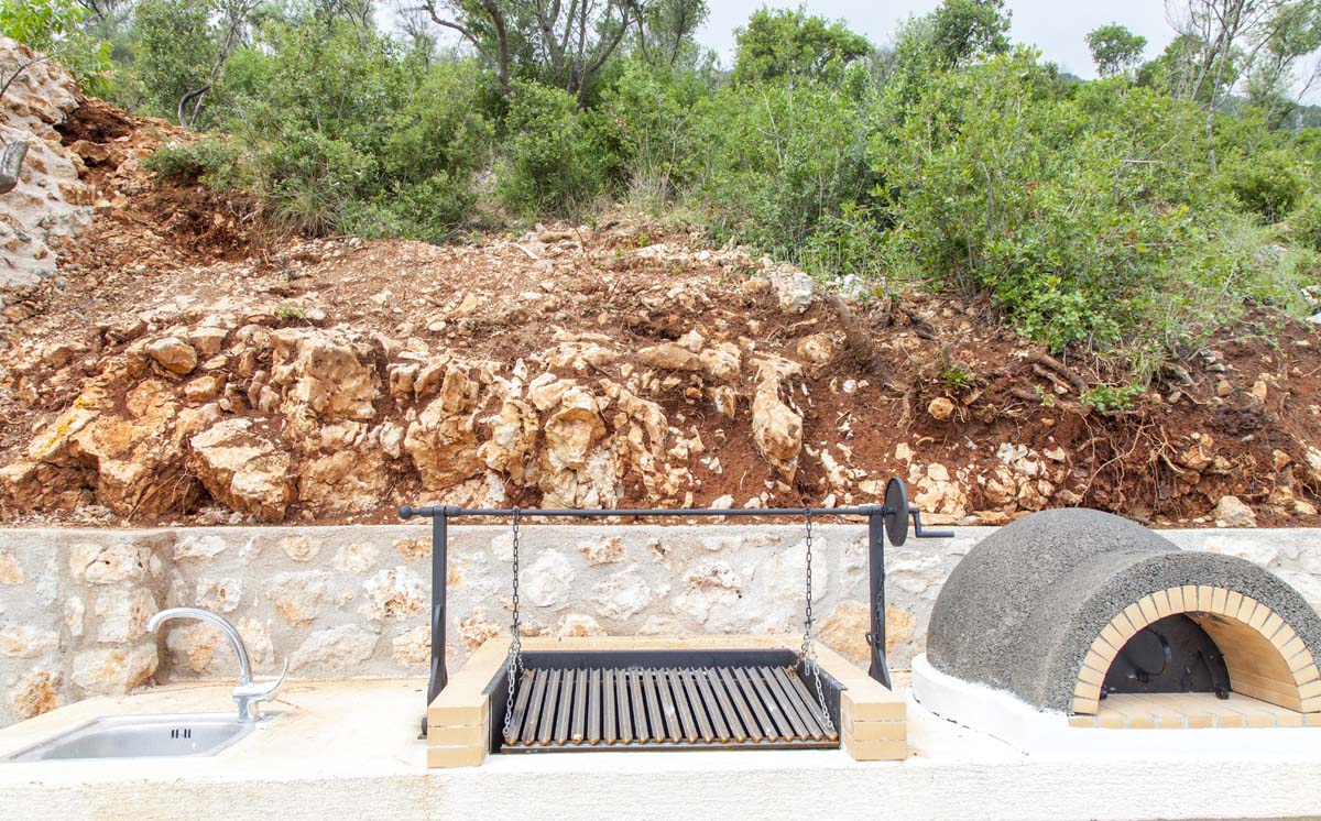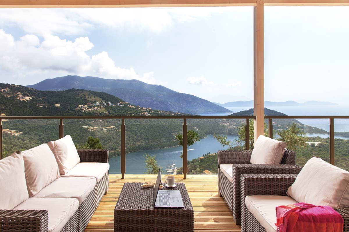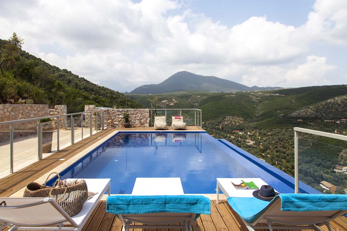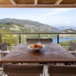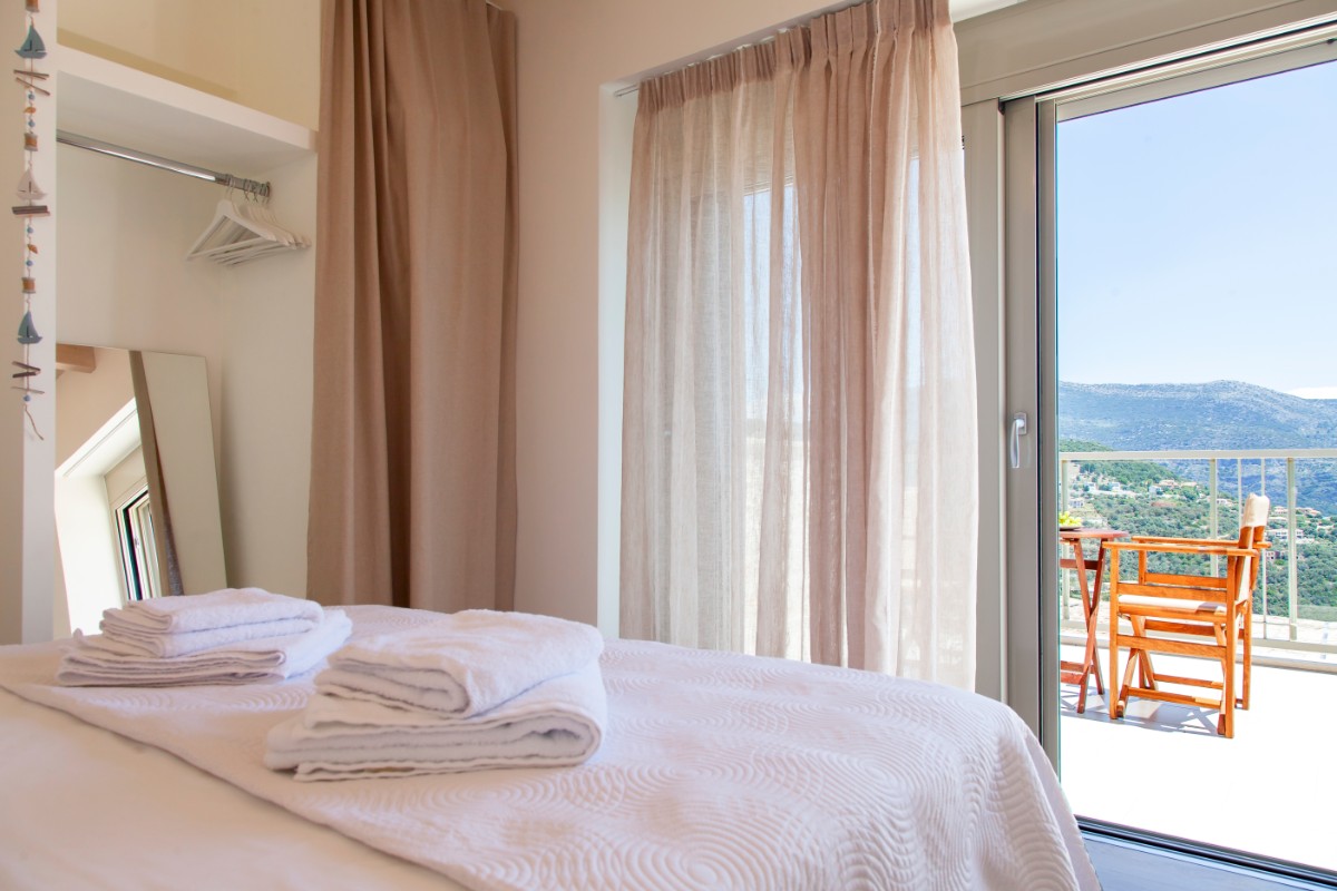 built of local stone with a tree about 120 square meters high on the side of the mountain above one of the magical coves on Lefkada Island.