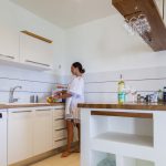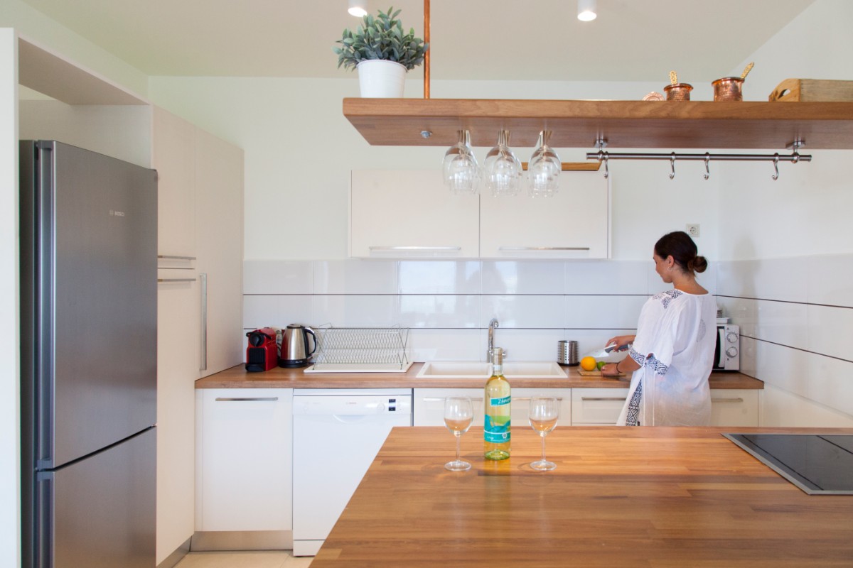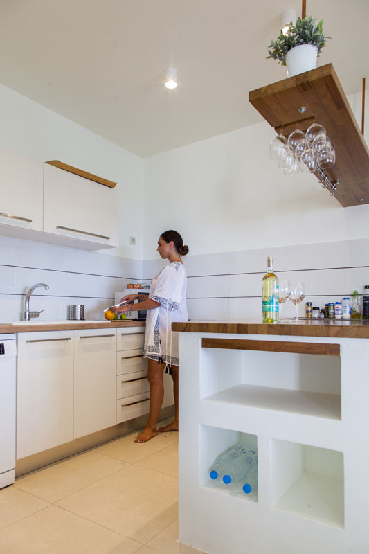 The villa has 2 levels: On the entry level you can indulge in an open kitchen equipped with work and dining island,