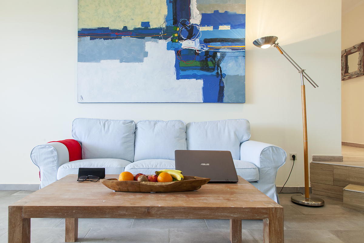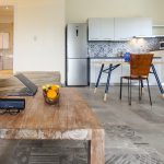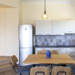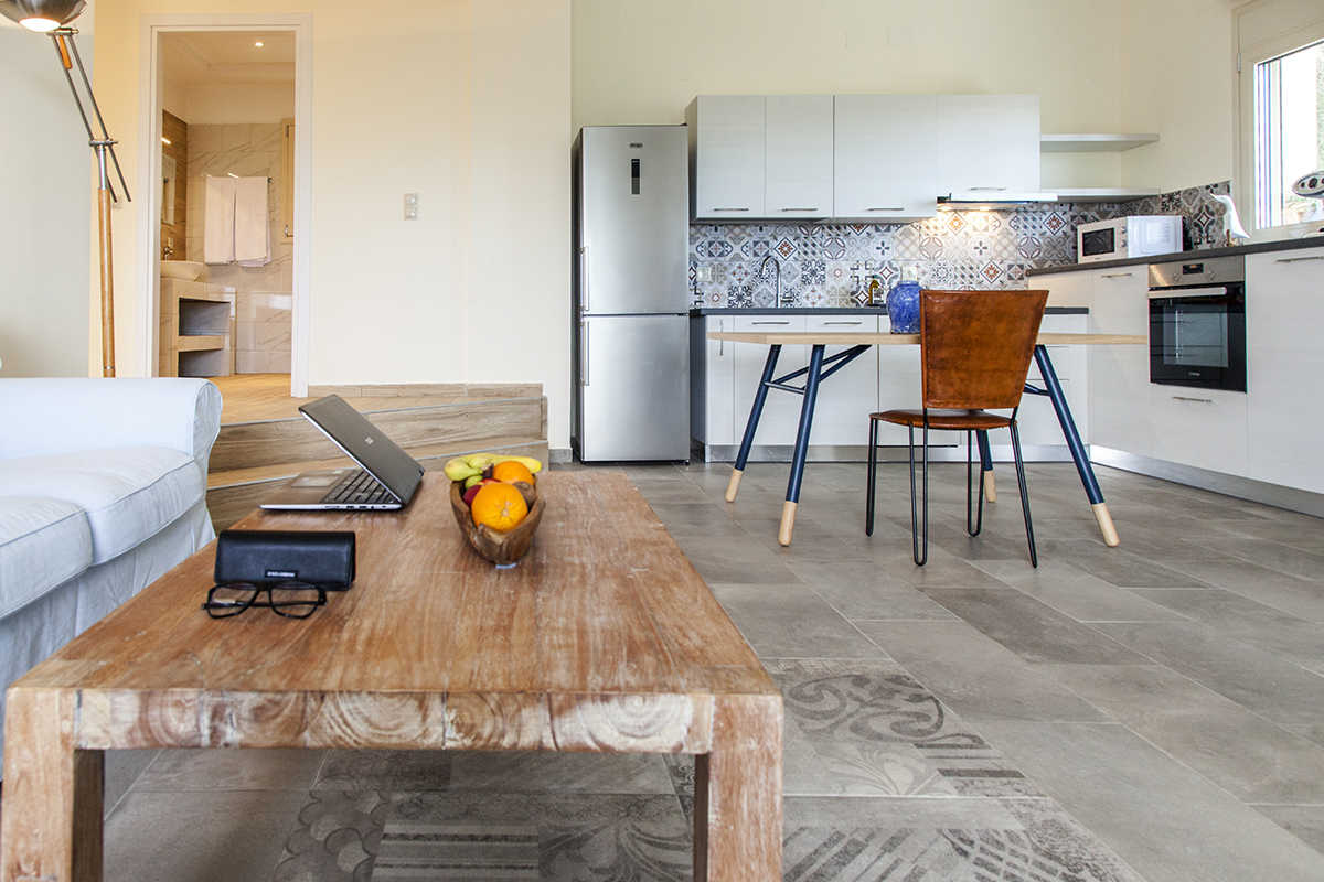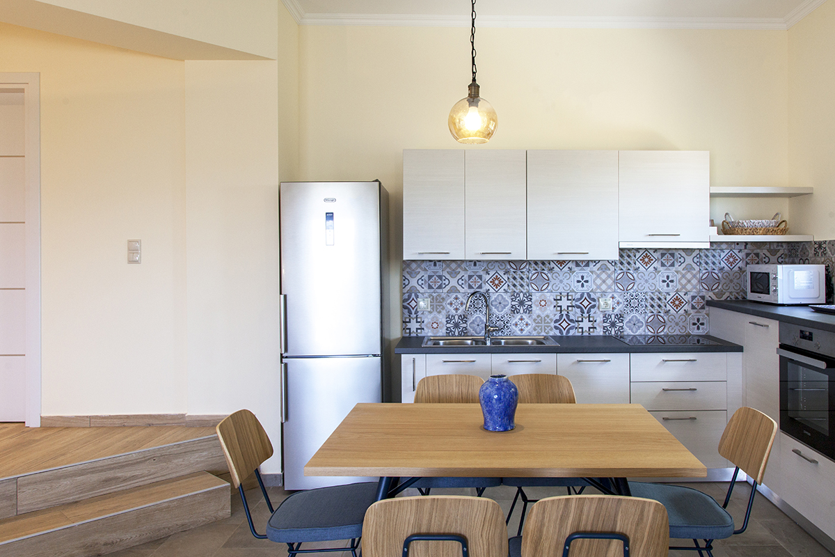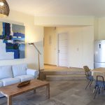 קומת קרקע: חלל אזור מגורים פתוח עם פינת אוכל ,מטבח מאובזר גישה ישירה למרפסת עם שולחן האוכל החיצוני.