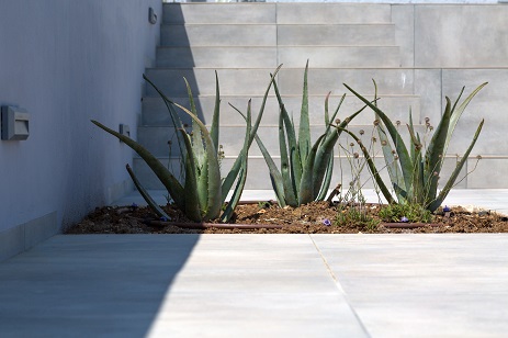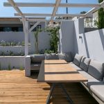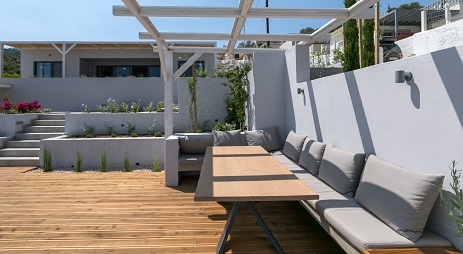At the exit from the living room to the courtyard, part of which is covered with teak Deck,