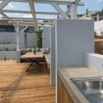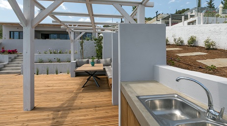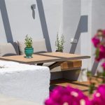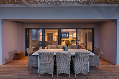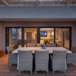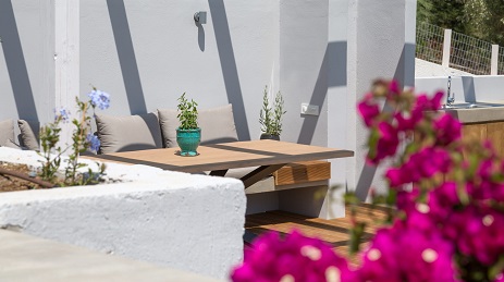 we will be greeted by a dining table that can host up to 8 guests comfortably at a Greek sunset in front of the bay.