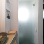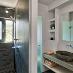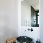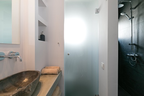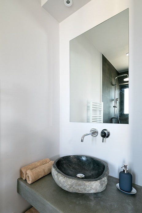Also in this uniquely designed bathroom – a stone sink with separate shower and toilet shelves.