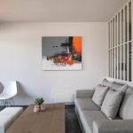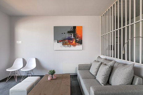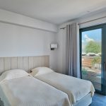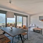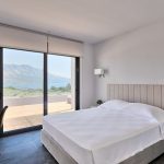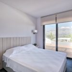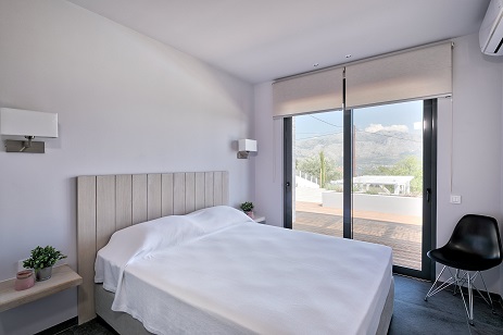 To the left of the entrance floor is a second bedroom with a double bed, and there are large sliding windows that face the sea terrace and the mountain view.
