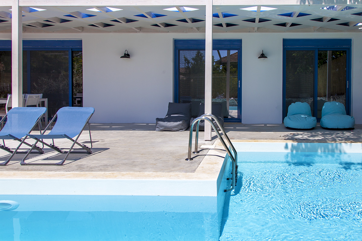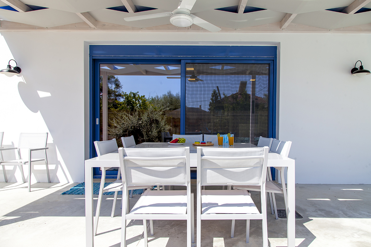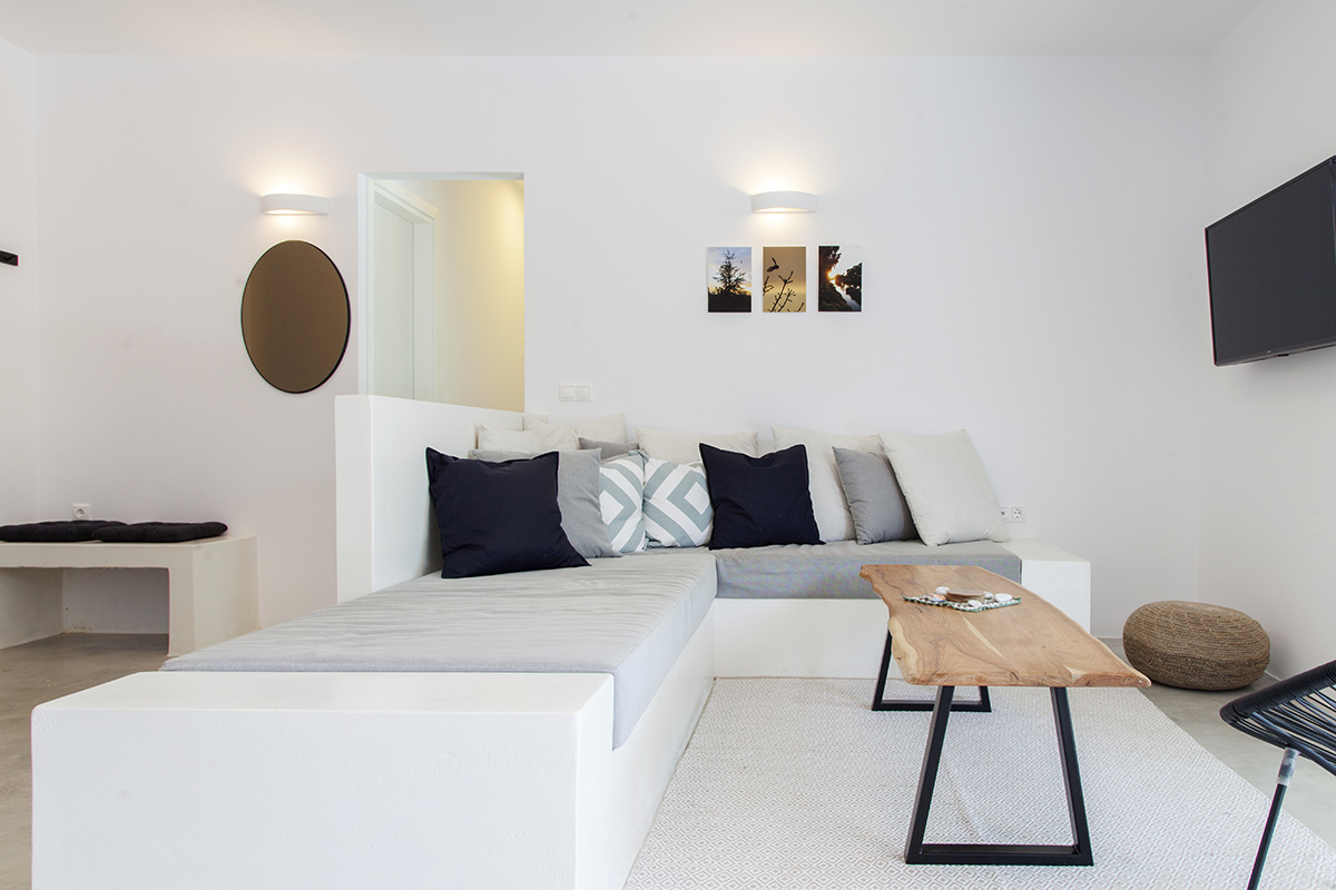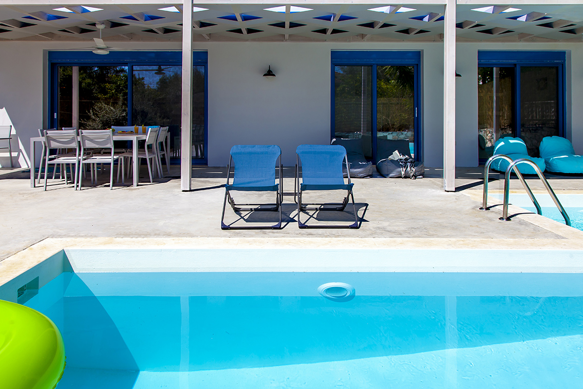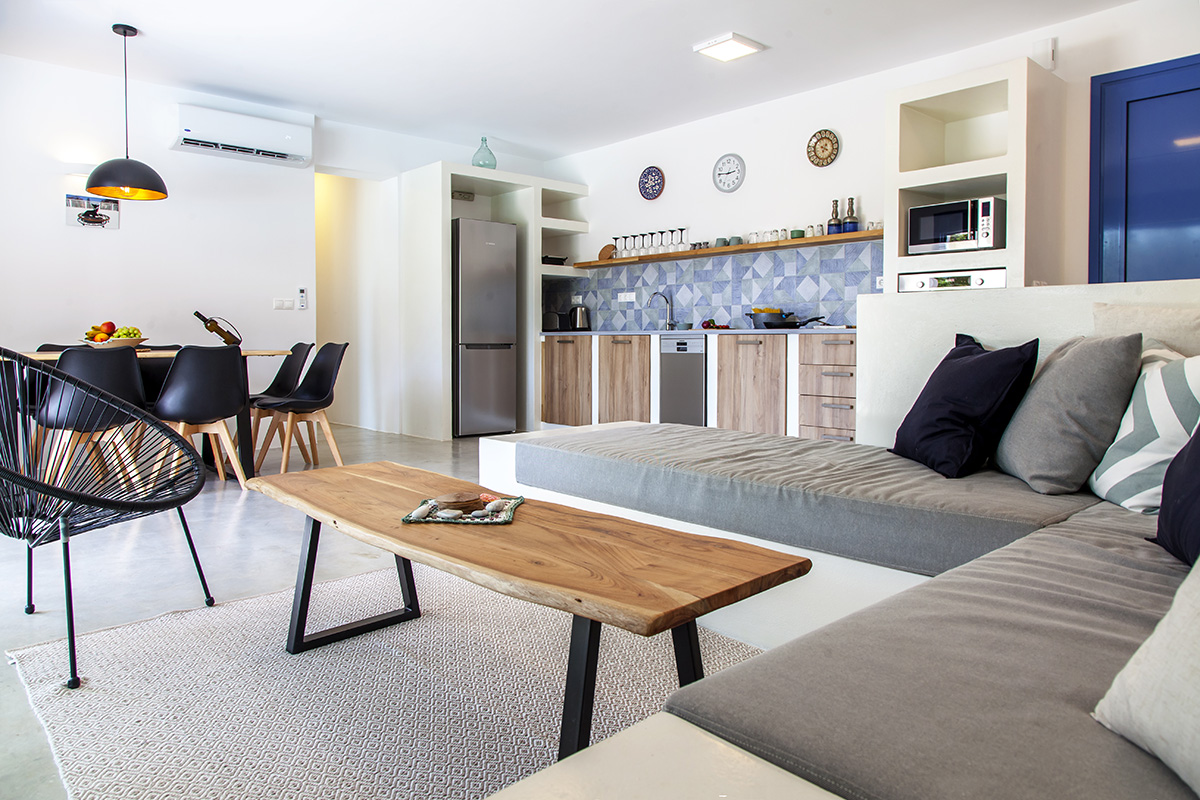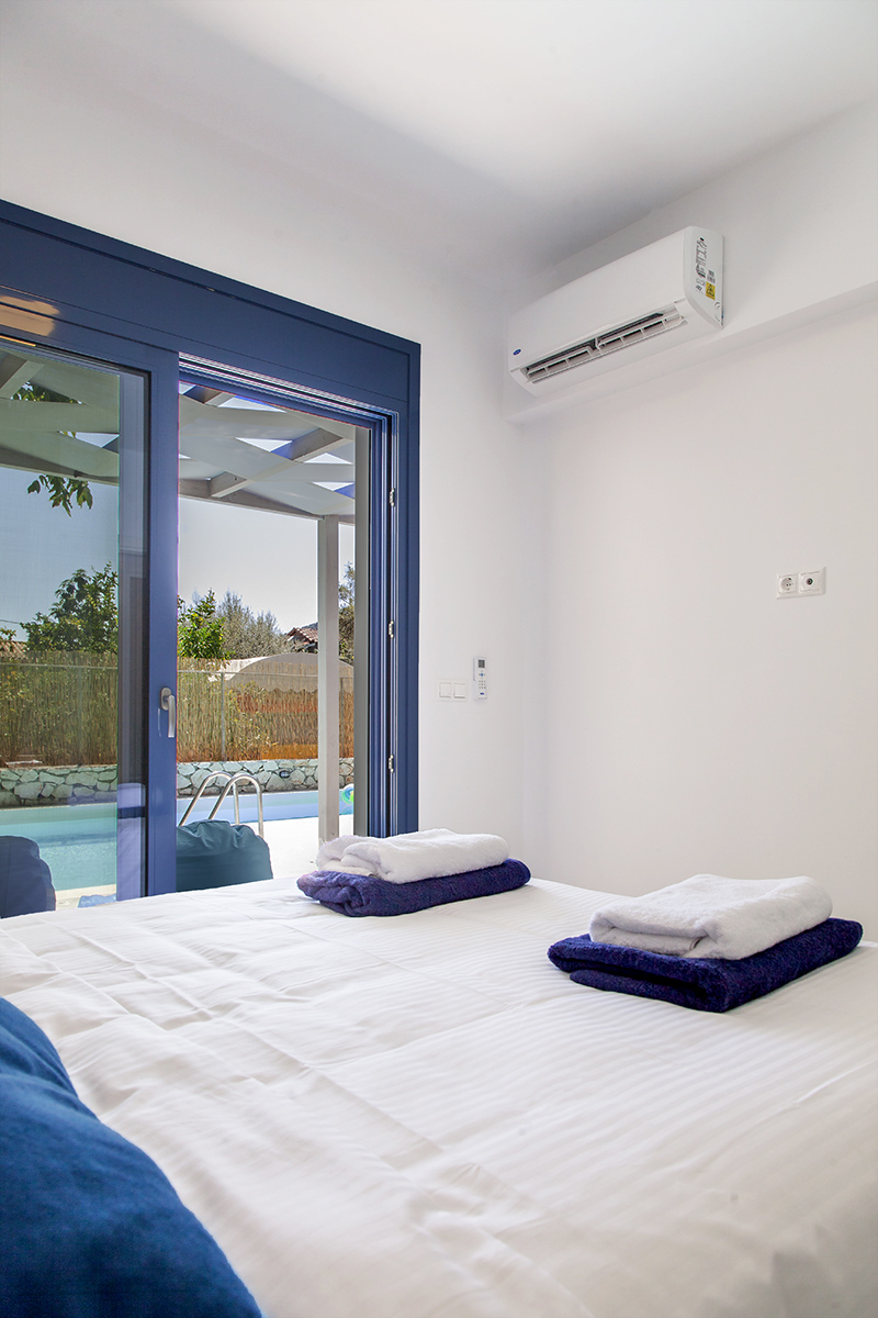 שוכנת בכפר מיקרוס גיאלוס Mikros Gialos היפה, במרחק הליכה קל לטברנות יווניות מסורתיות, חנויות בוטיק, ברים והחוף המדהים . העיצוב המודרני הכחול-לבן של האדריכלות האגאית היוונית היוצר אווירה שלווה למשפחות עם ילדים לחוות באמת חופשת וילה יוונית אמיתית .
