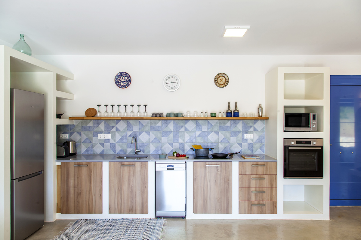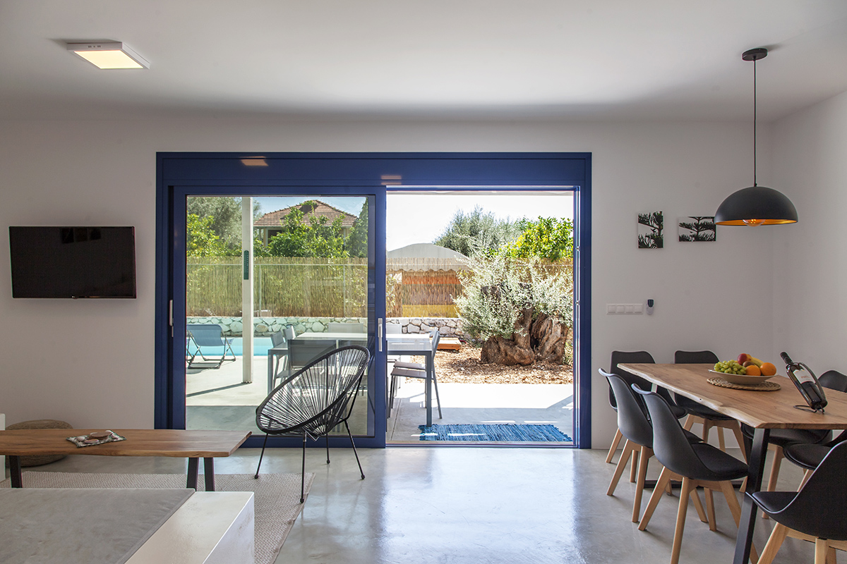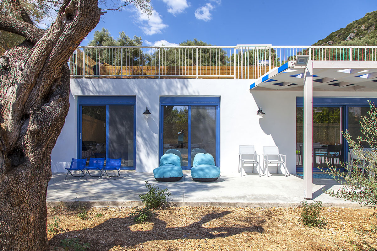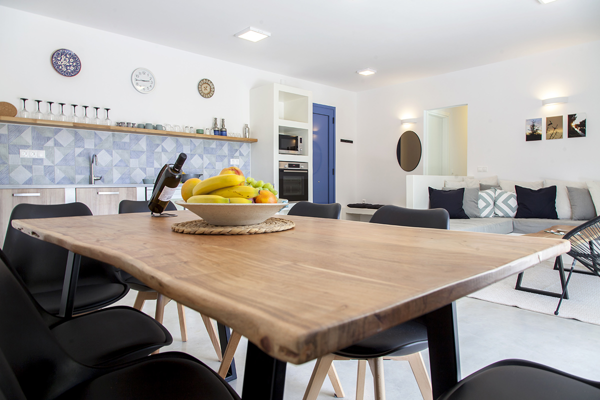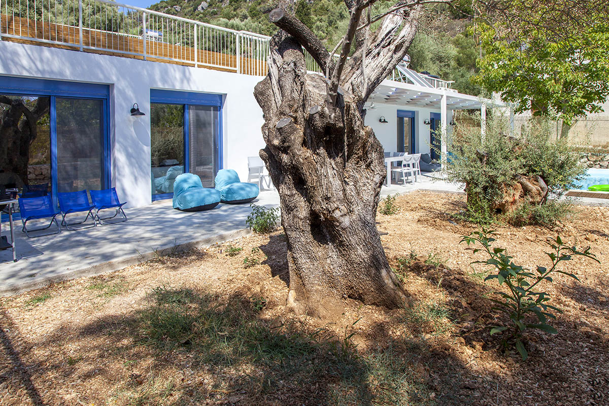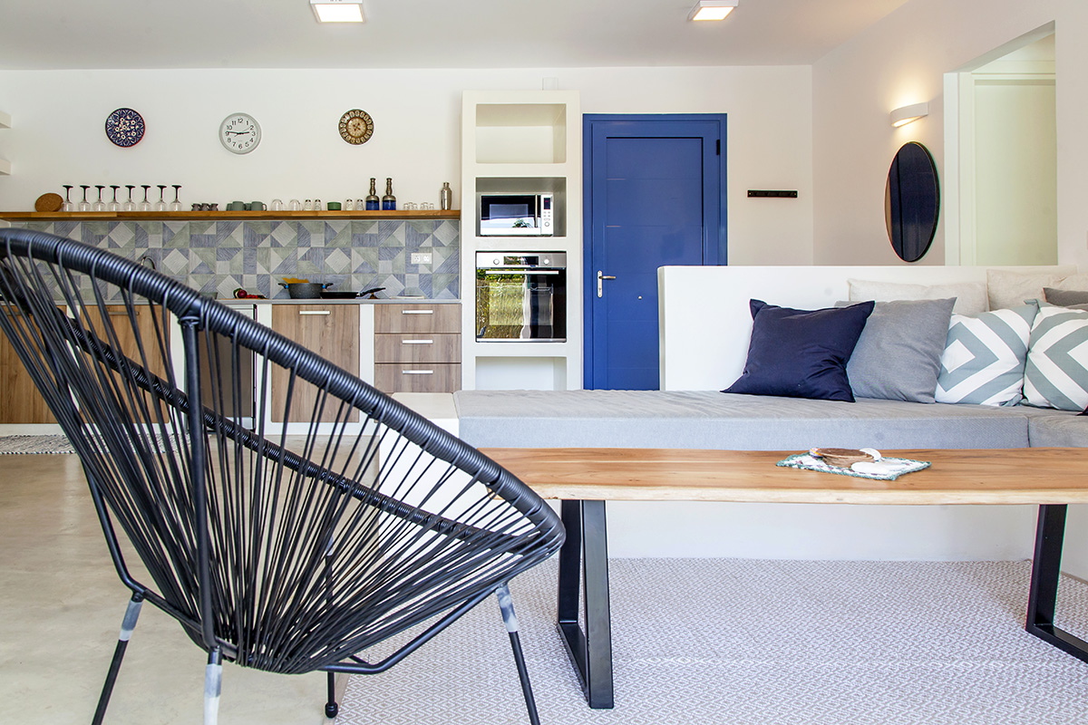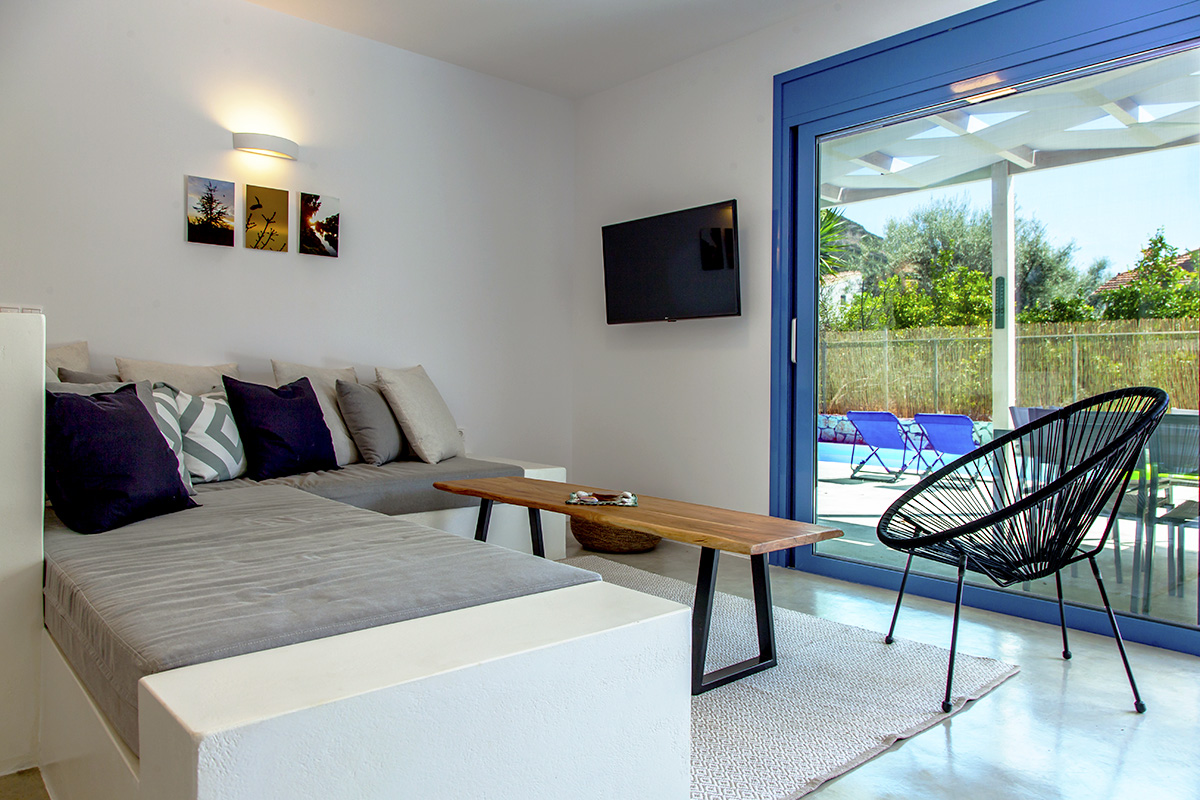 שוכנת בכפר מיקרוס גיאלוס Mikros Gialos היפה, במרחק הליכה קל לטברנות יווניות מסורתיות, חנויות בוטיק, ברים והחוף המדהים . העיצוב המודרני הכחול-לבן של האדריכלות האגאית היוונית היוצר אווירה שלווה למשפחות עם ילדים לחוות באמת חופשת וילה יוונית אמיתית .