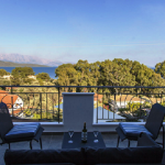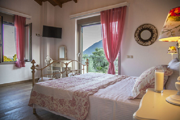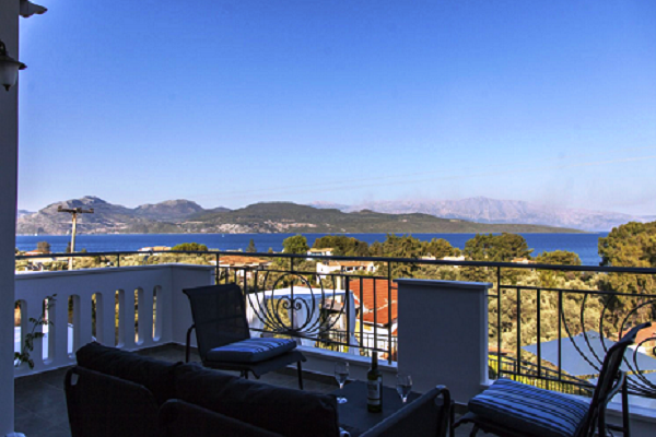 Villa Harris is hiding in a green village on the side of the mountain overlooking the Lefkada Canal and the continental mountains to the east.