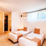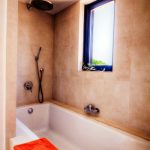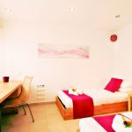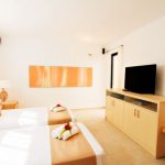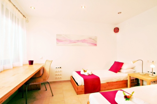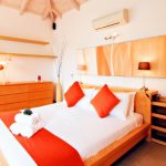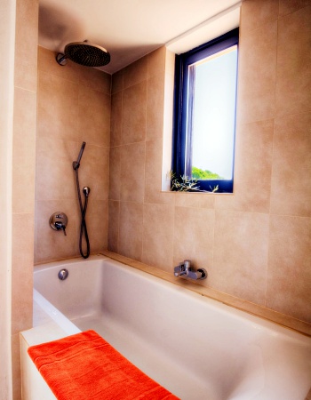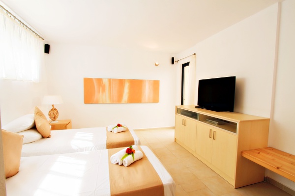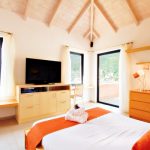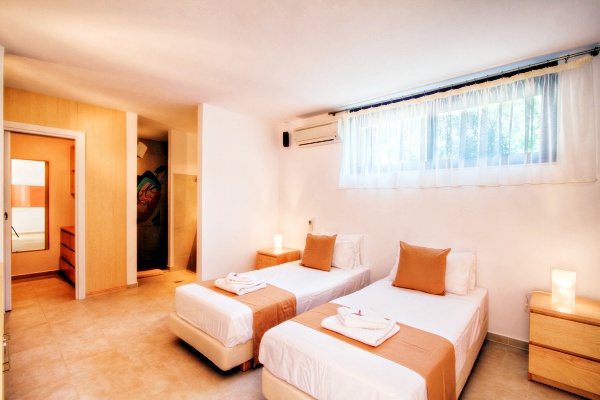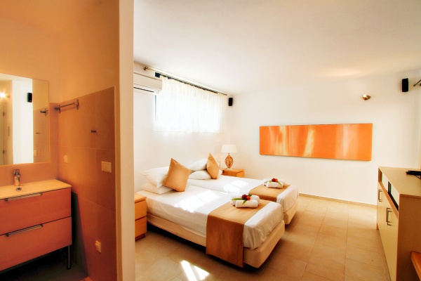One bedroom with twin beds, 40″ LCD TV and bathroom with shower. Bay window opening to a small patio with direct access to the swimming pool.
