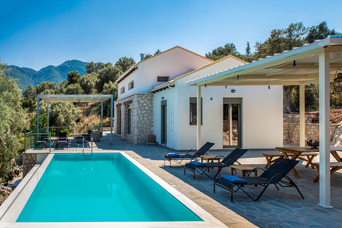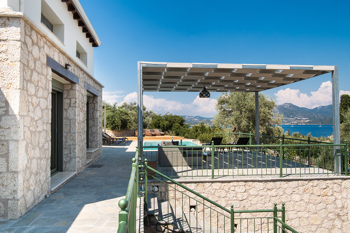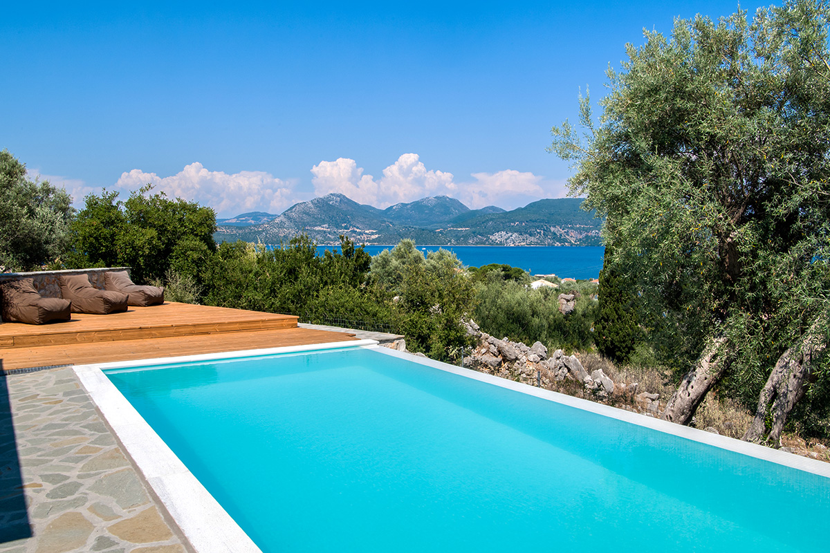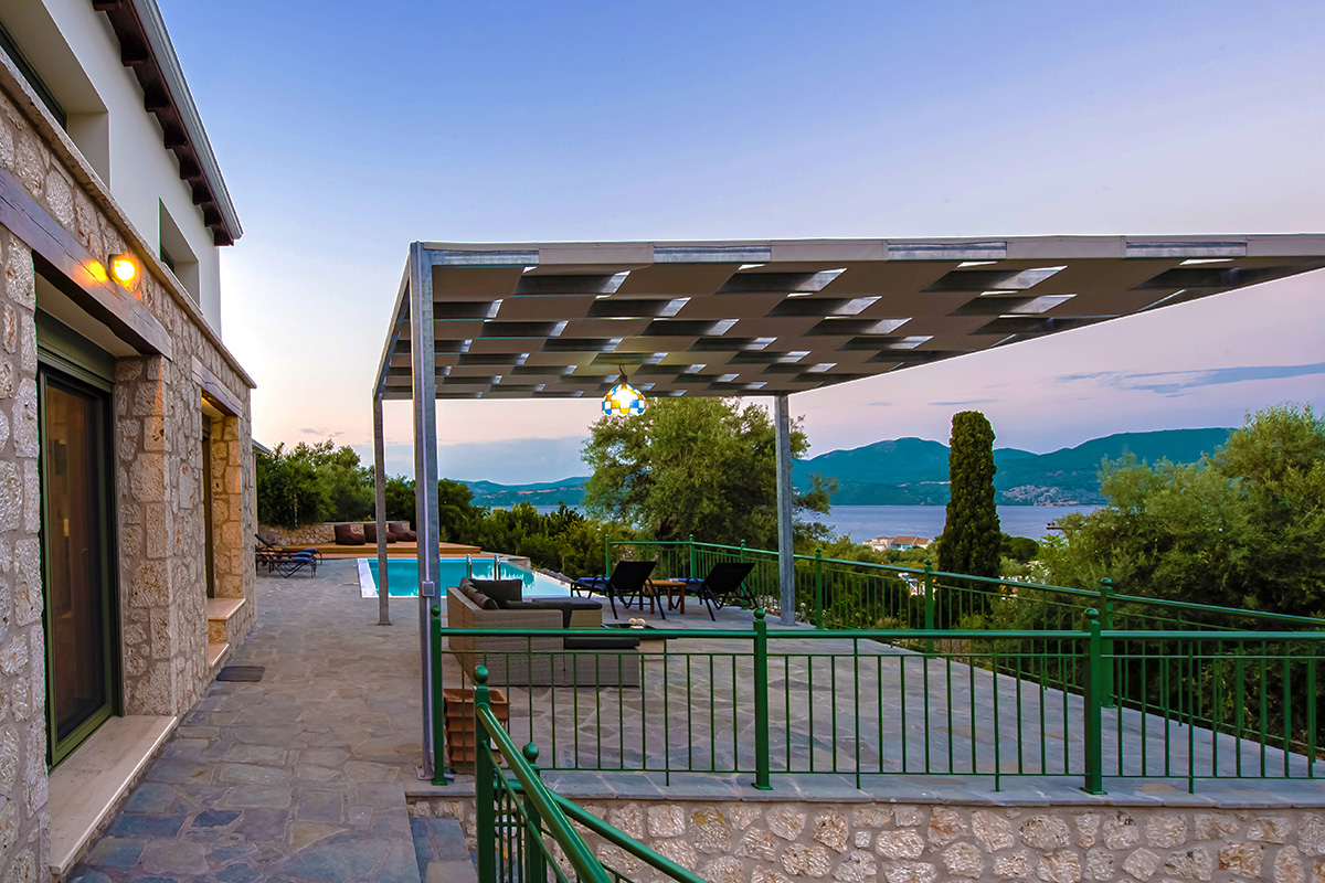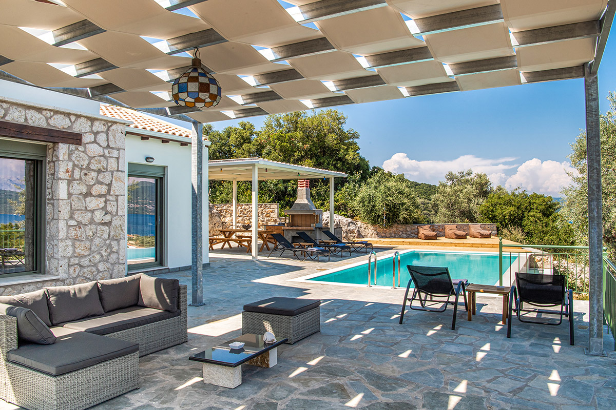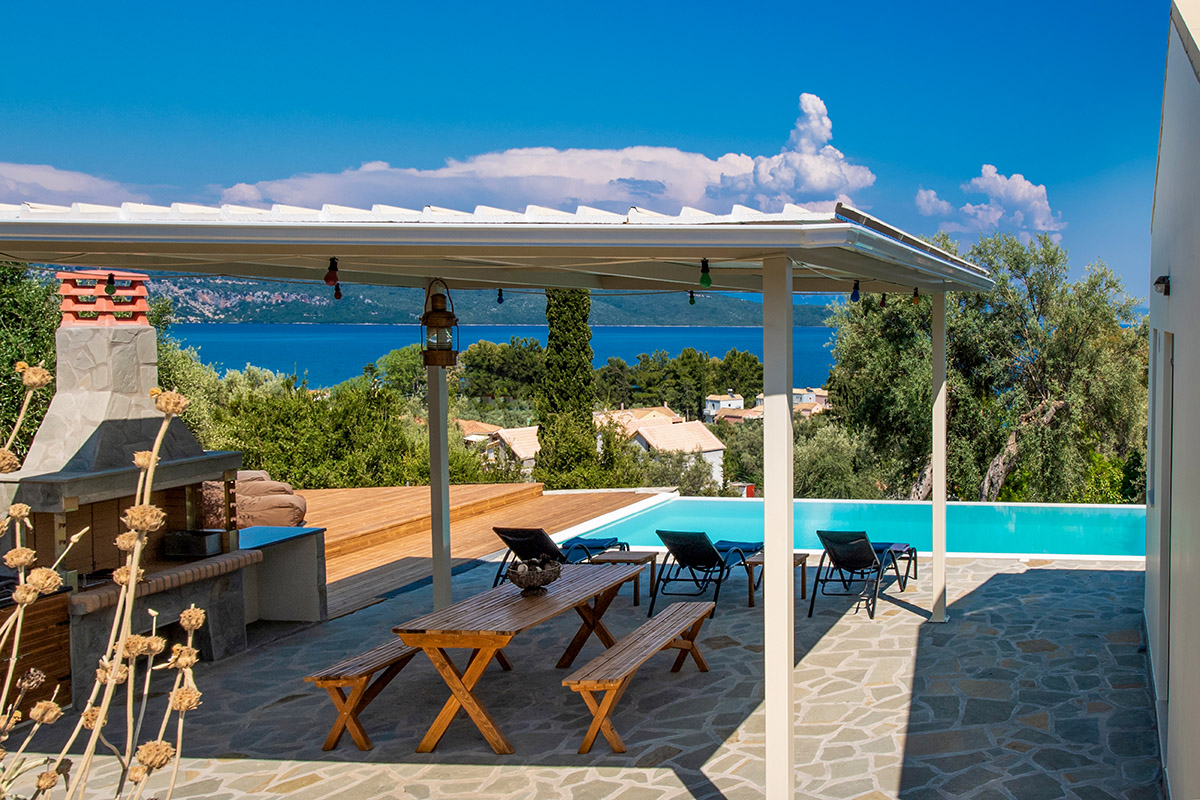 וילה מודרנית חדשה בלפקדה Lefkada שוכנת על הגבעה עם נוף פנורמי עוצר נשימה מעל הים היוני Ionian Sea והאיים שמסביב.