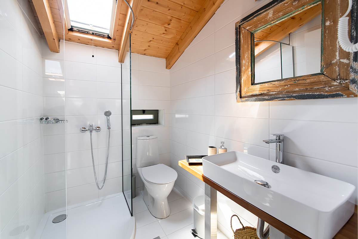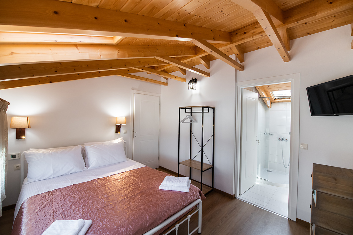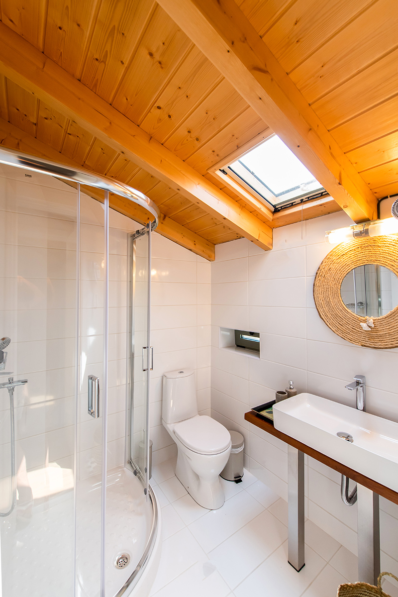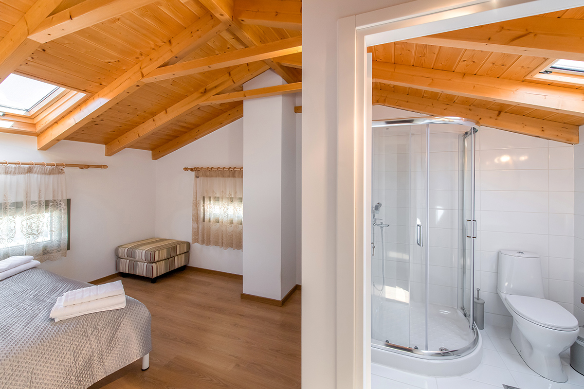 קומה עליונה : בנויה להפליא בסגנון עליית גג עם קורות חשופות ועבודות עץ מדהימות ,2 חדרי שינה זוגיים ו 2 חדרי רחצה משפחתיים עם מקלחת.