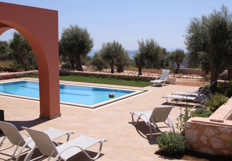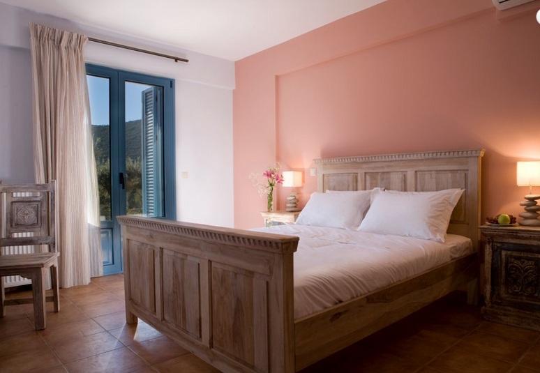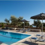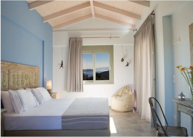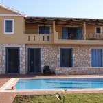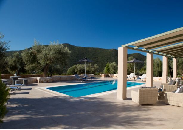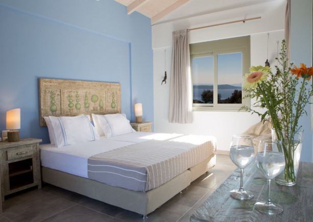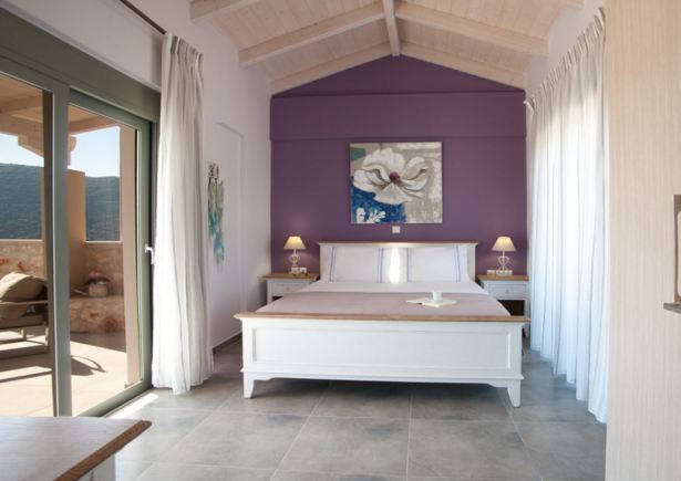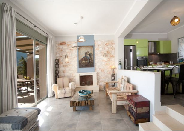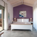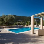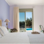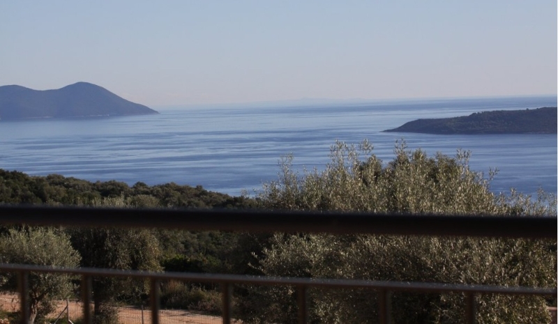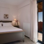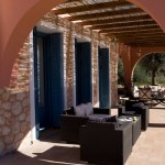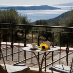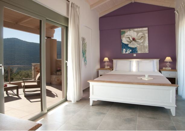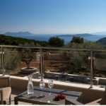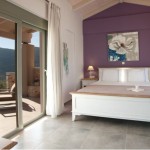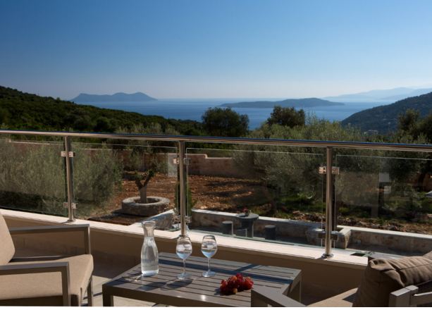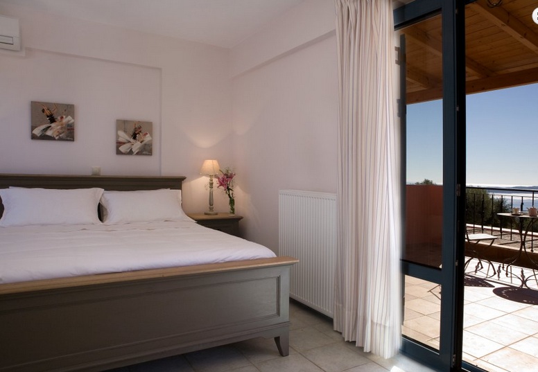 Master bedroom with queen-size bed, en suite bathroom / shower and walk-in wardrobe (twin beds). Third bedroom with queen size bed, Bathroom / shower (with washing machine). All bedrooms have wooden ceiling and are equipped with air conditioning and TV 26 “LED. The bedrooms lead to a 40 m² terrace with a wooden pergola and it faces stunning views of the sea and the Ionian Islands. The third bedroom has its own balcony, which overlooks the lush landscape of Lefkada Island.