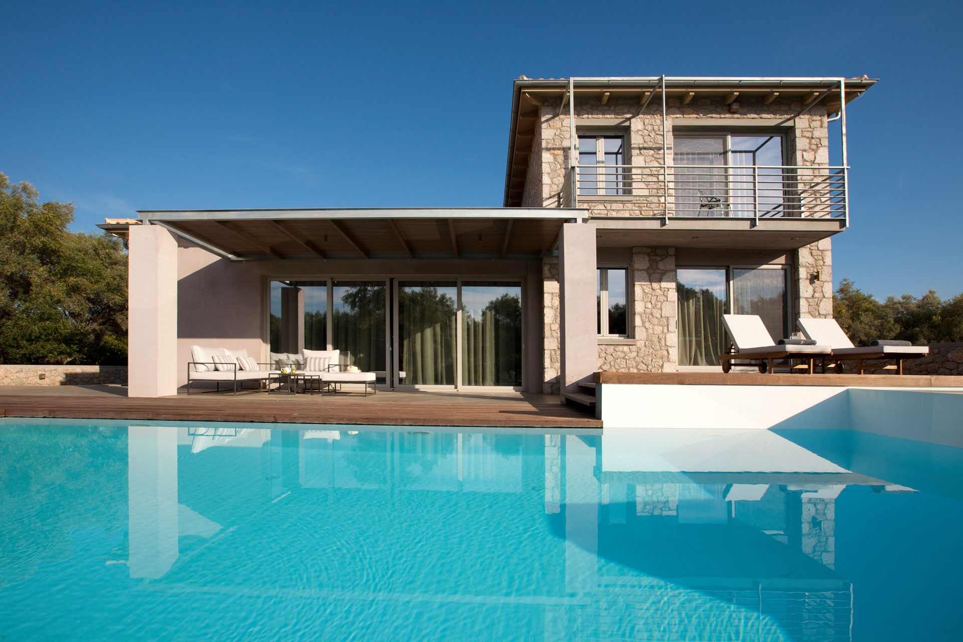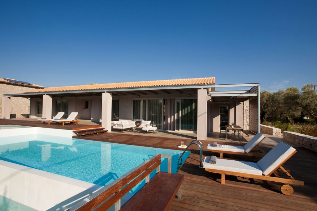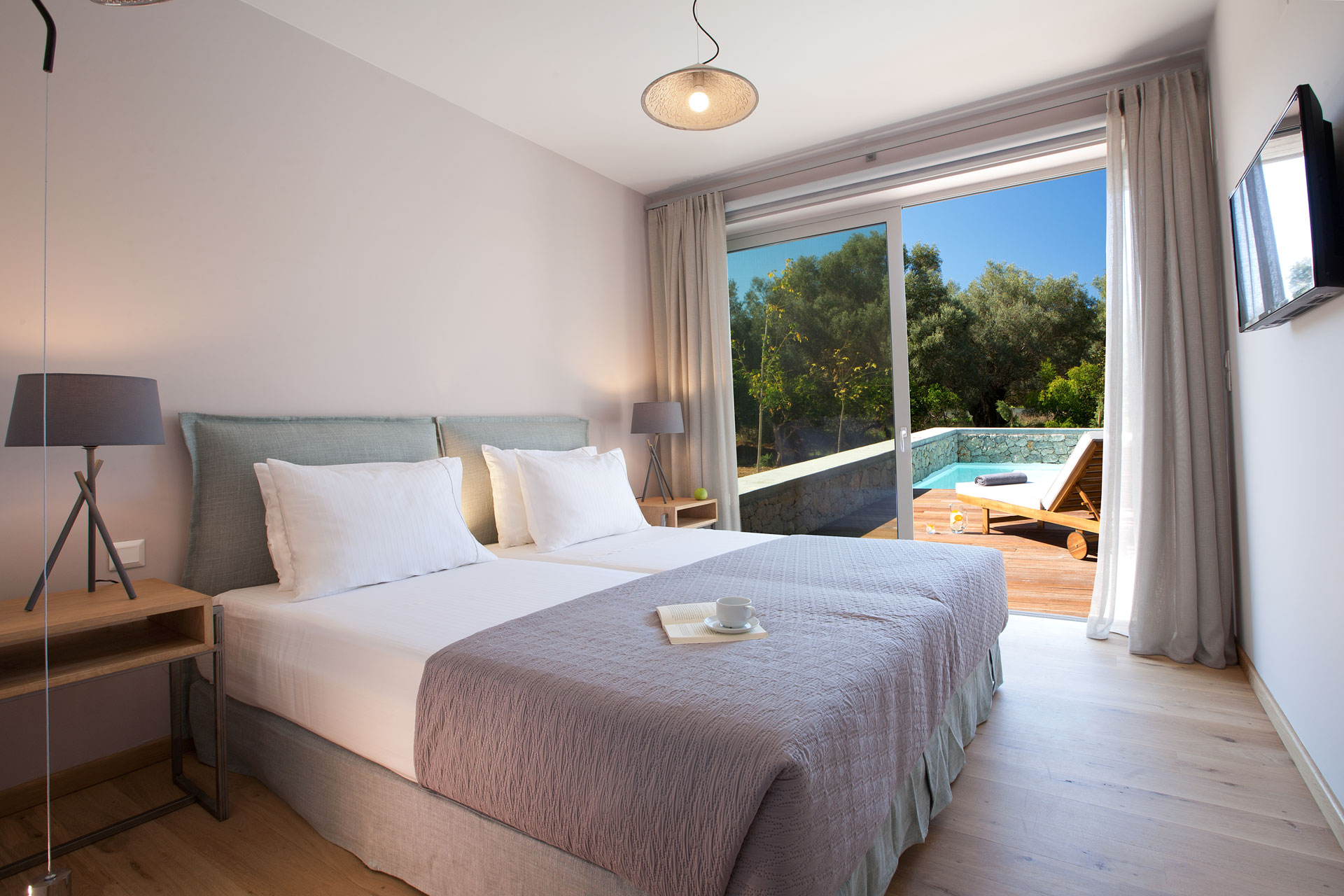 שתי וילות מקסימות הבנויות באבן בלב מטע זיתים, קרוב לחוף החולי של אגיוס יואניס Agios Ioannis.