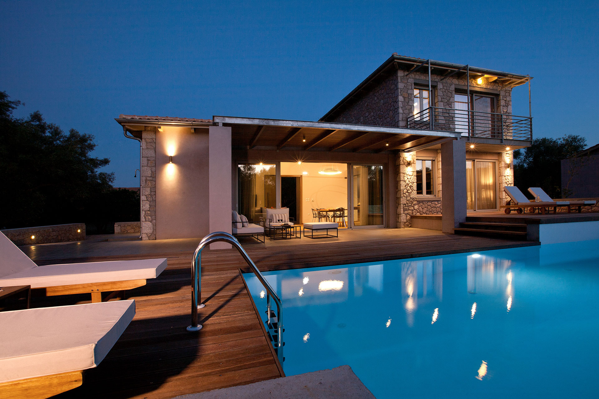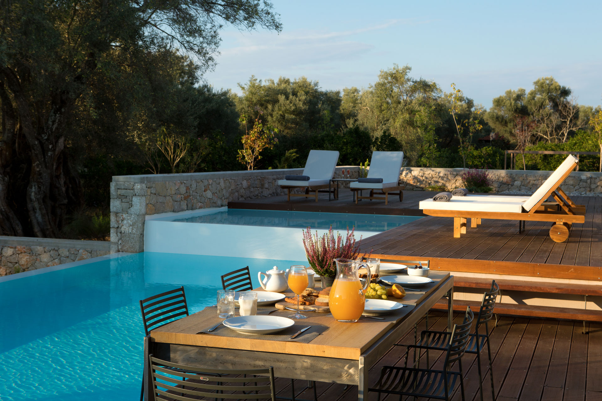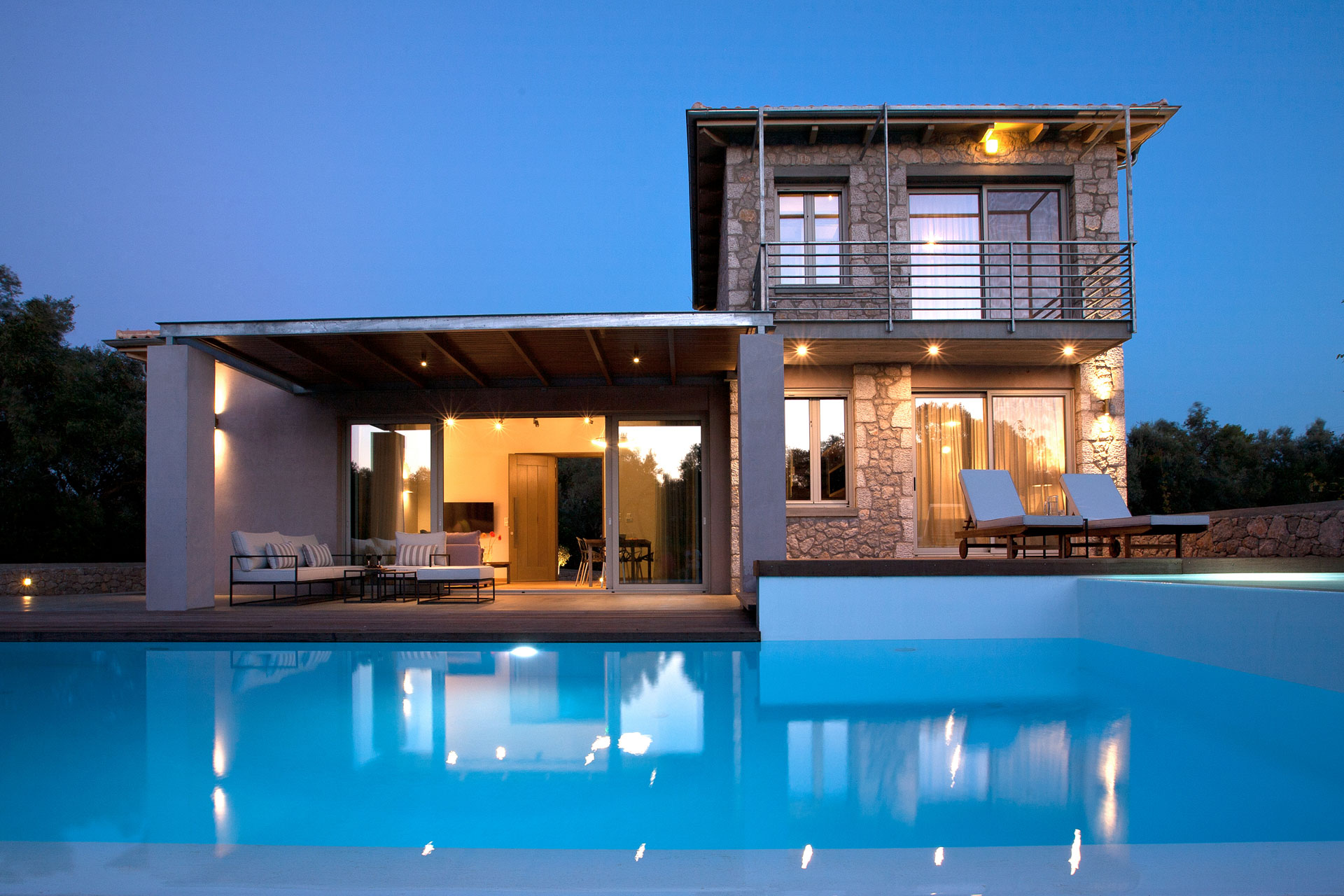שתי וילות מקסימות הבנויות באבן בלב מטע זיתים, קרוב לחוף החולי של אגיוס יואניס Agios Ioannis.