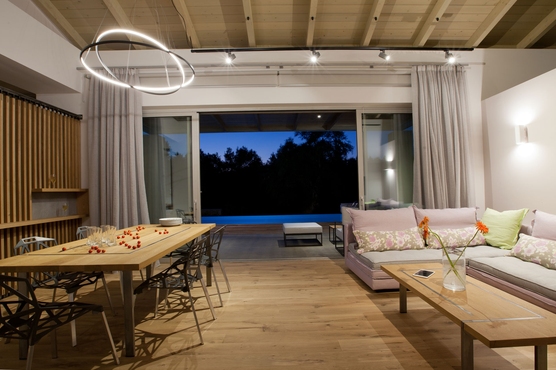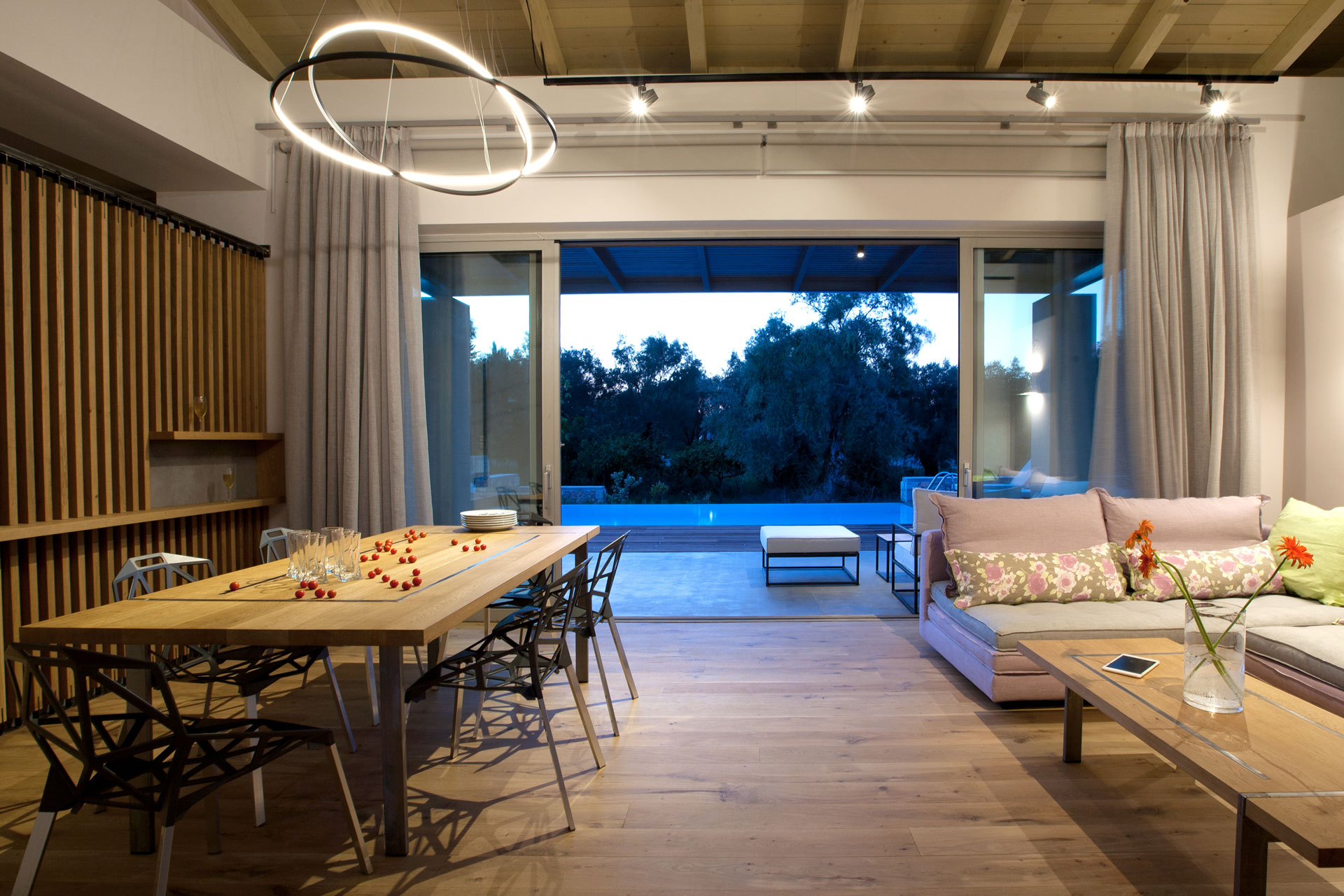 איזור חיצוני: פינת אוכל גדולה, טרקלין ופינות ישיבה, מנגל מובנה, בריכת אינסוף 45 מ"ר ומוקפת במרפסת שמש מעץ.