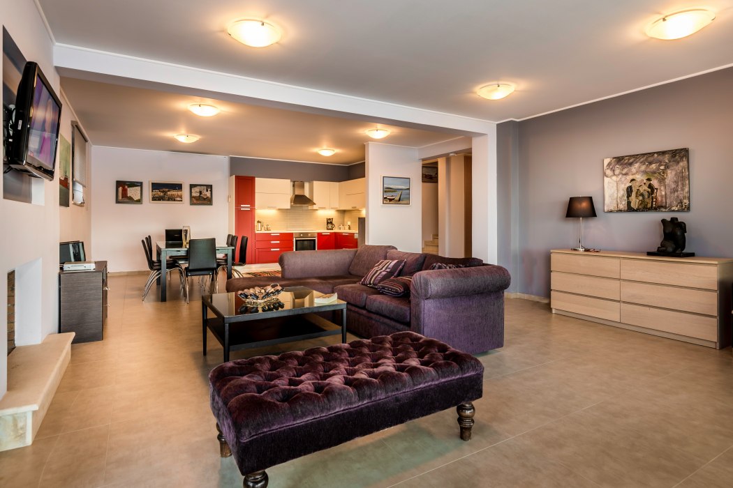 חלל מגורים בגודל 80 מ"ר הכולל פינת ישיבה, מטבח מאובזר עם אי באמצע, פינת אוכל ל-10 סועדים, שירותים וחדר כביסה,