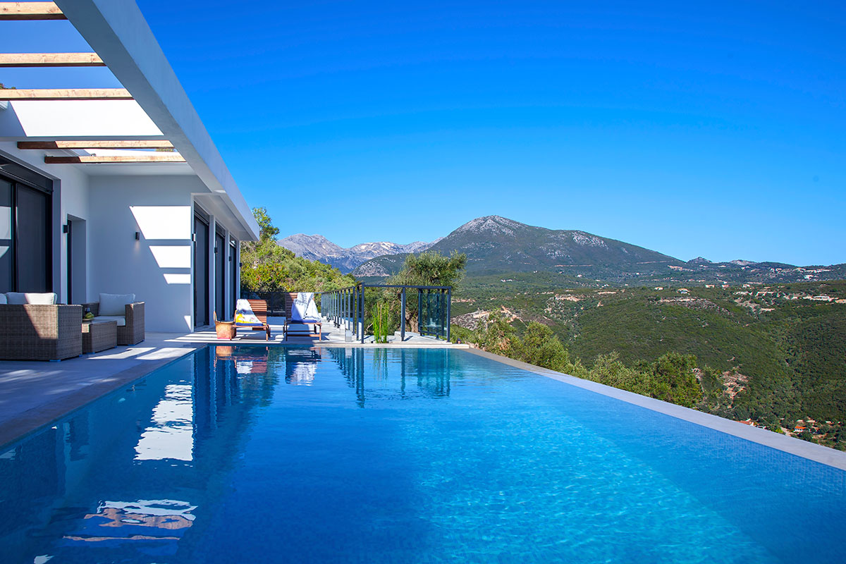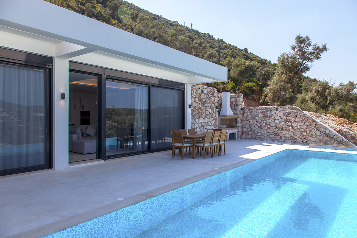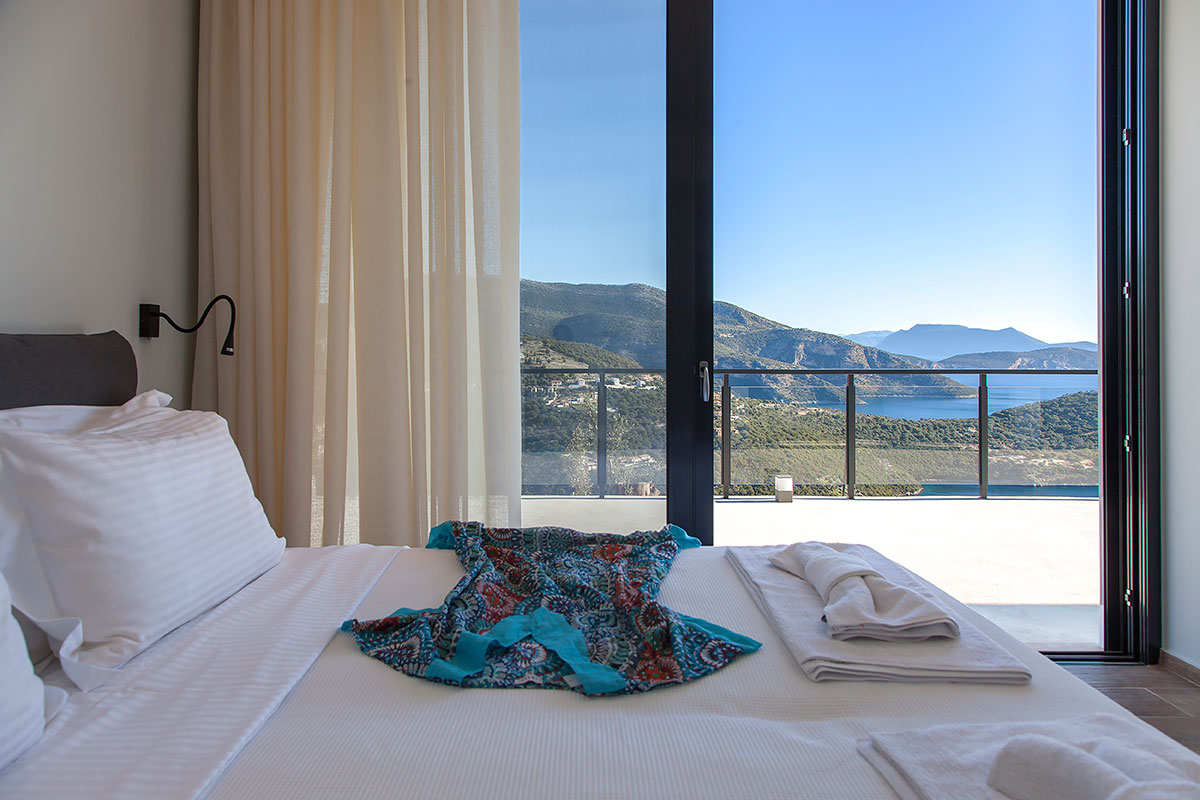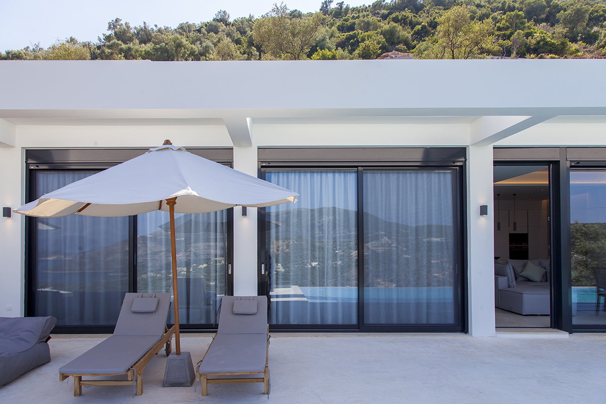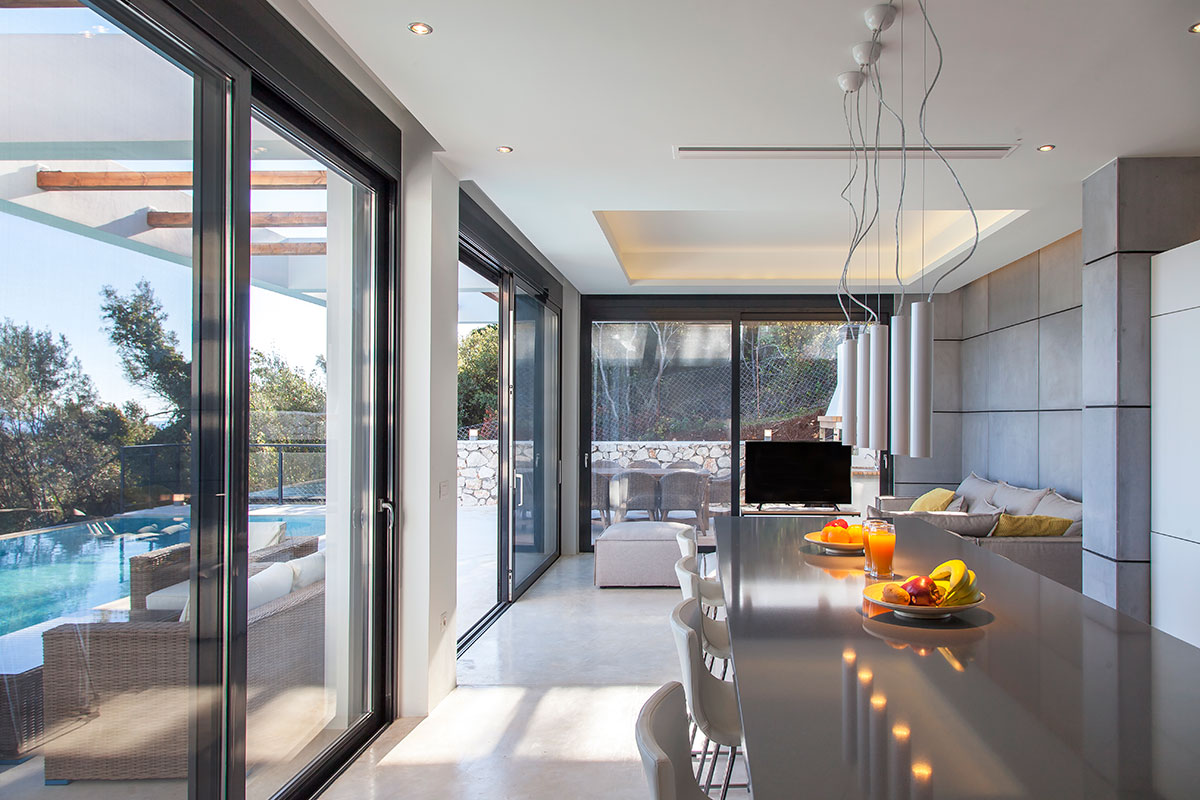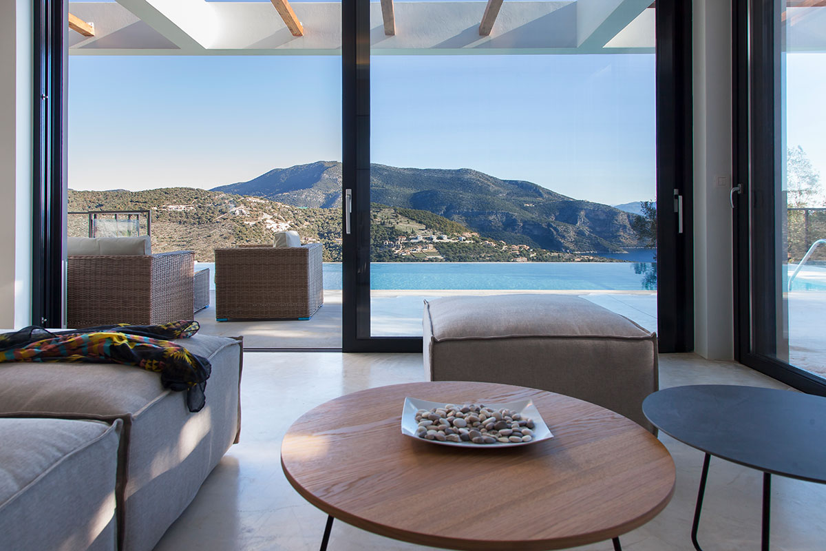 The front of the villa is made of high sliding glass doors that allow you to enjoy the wonderful panoramic sea view over the bay, the surrounding mountains and the Ionian Sea.