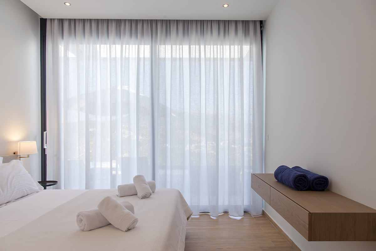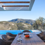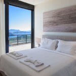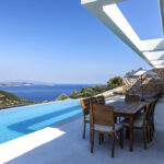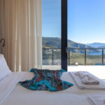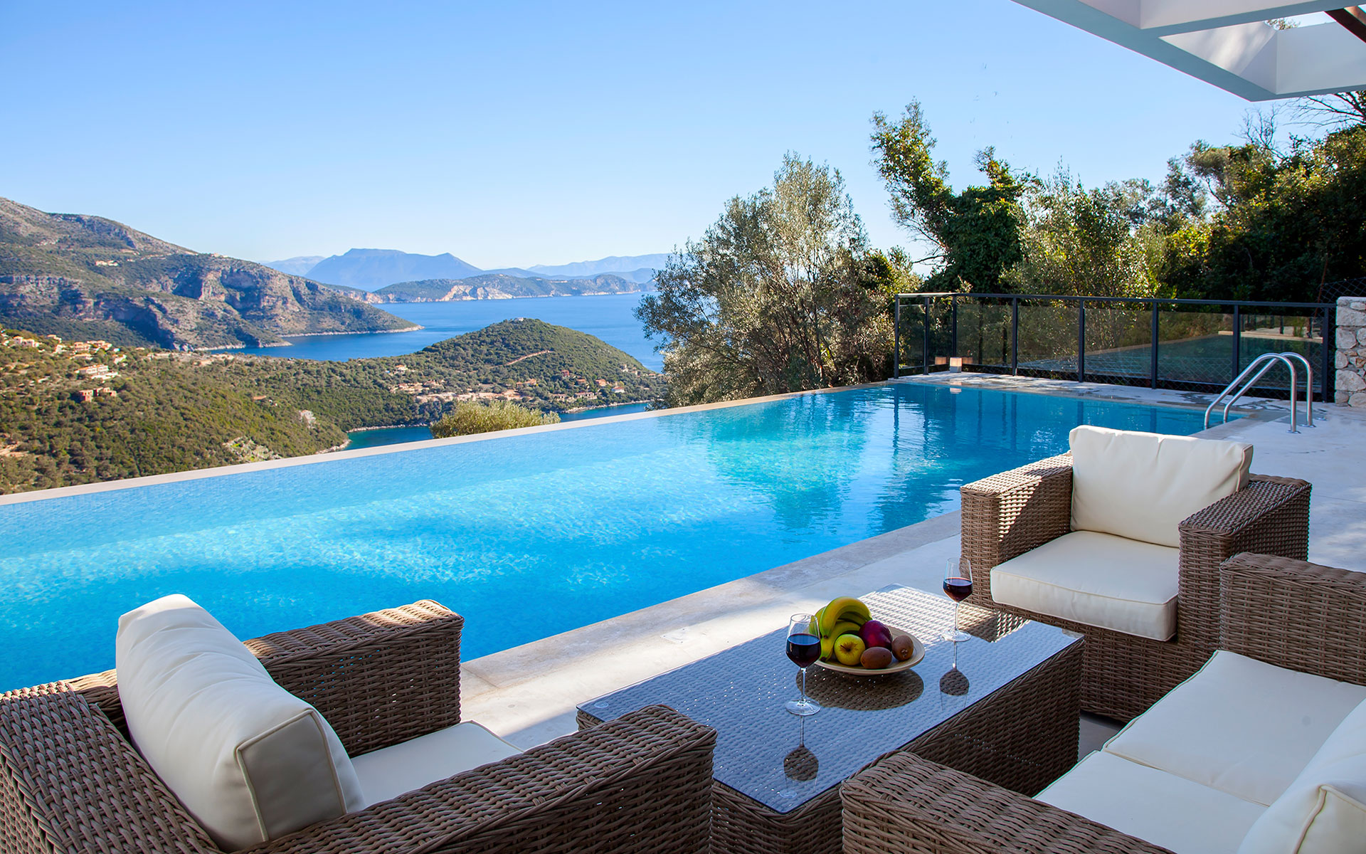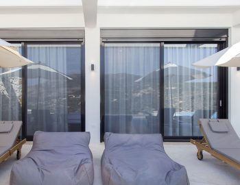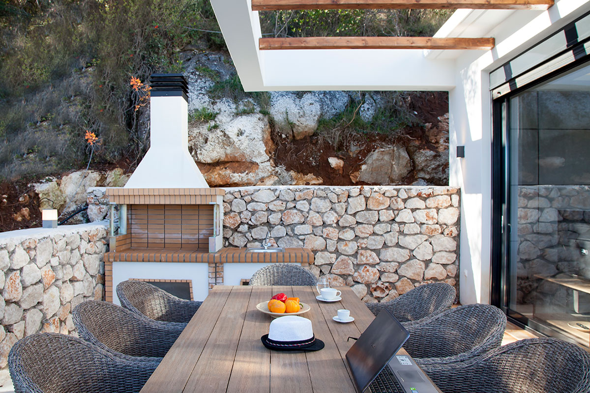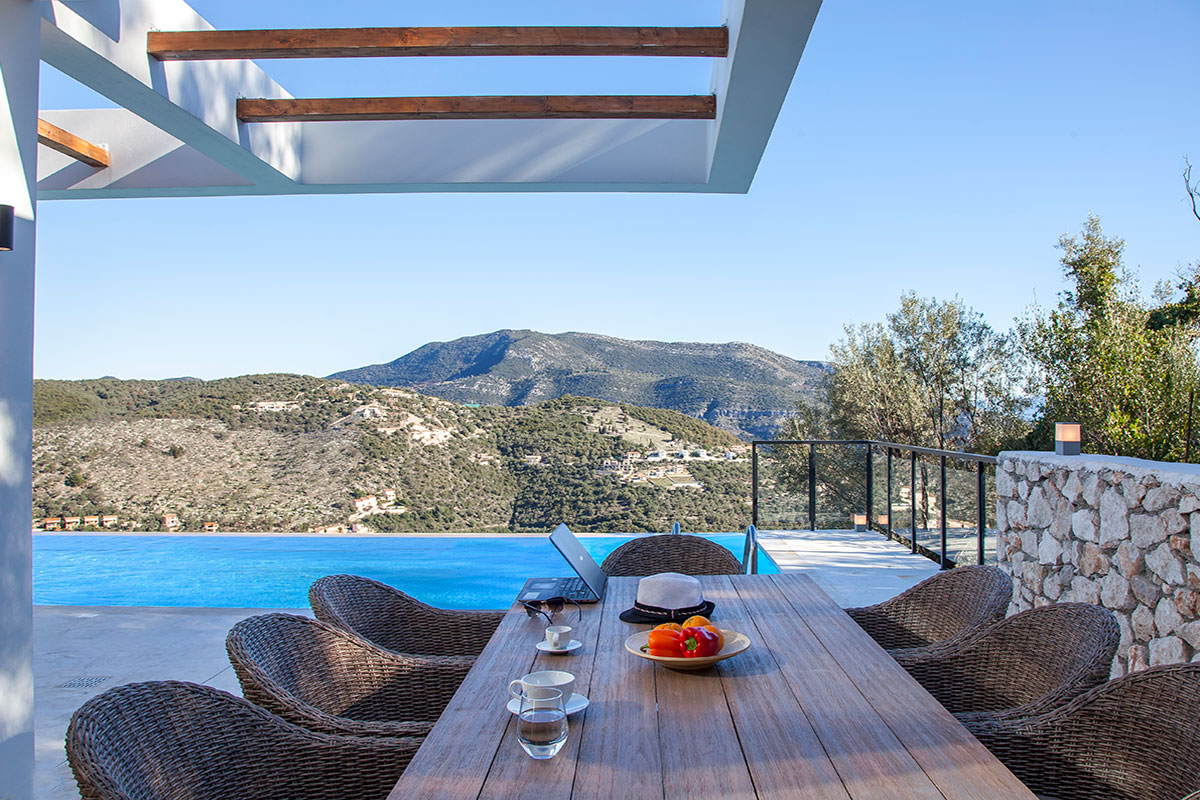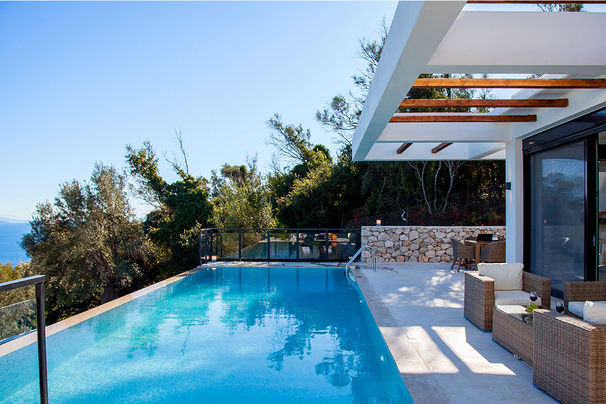 The front of the villa is made of high sliding glass doors that allow you to enjoy the wonderful panoramic sea view over the bay, the surrounding mountains and the Ionian Sea.
