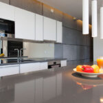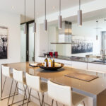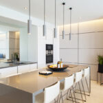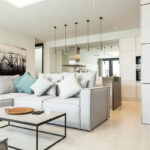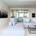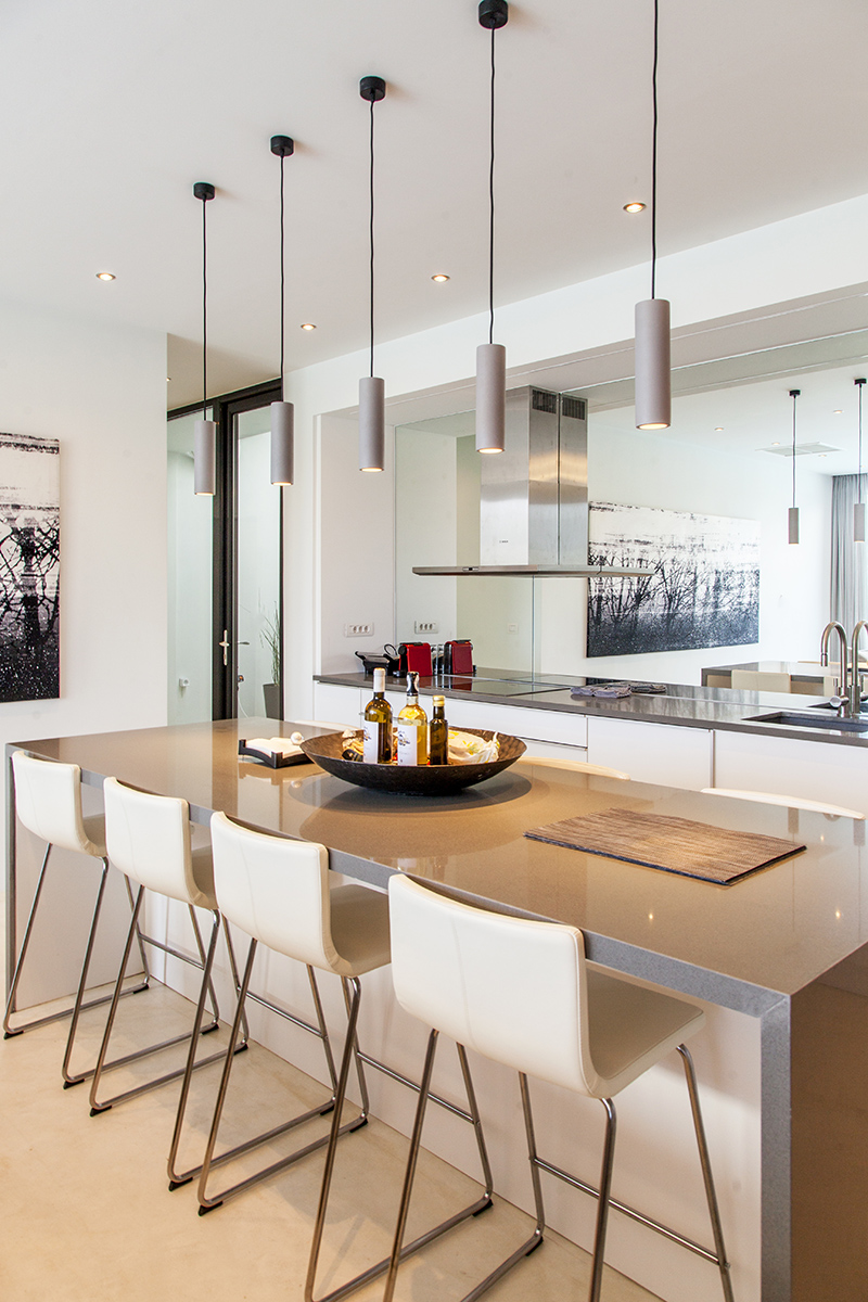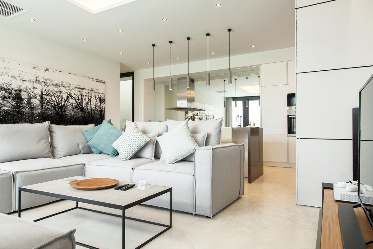 The open kitchen is in the center of the spacious living area with a large kitchen island and bar stools. Comfortable living area with a large sofa that serves as a sofa bed and the entertainment system equipped with an Xbox for children and a sound system.