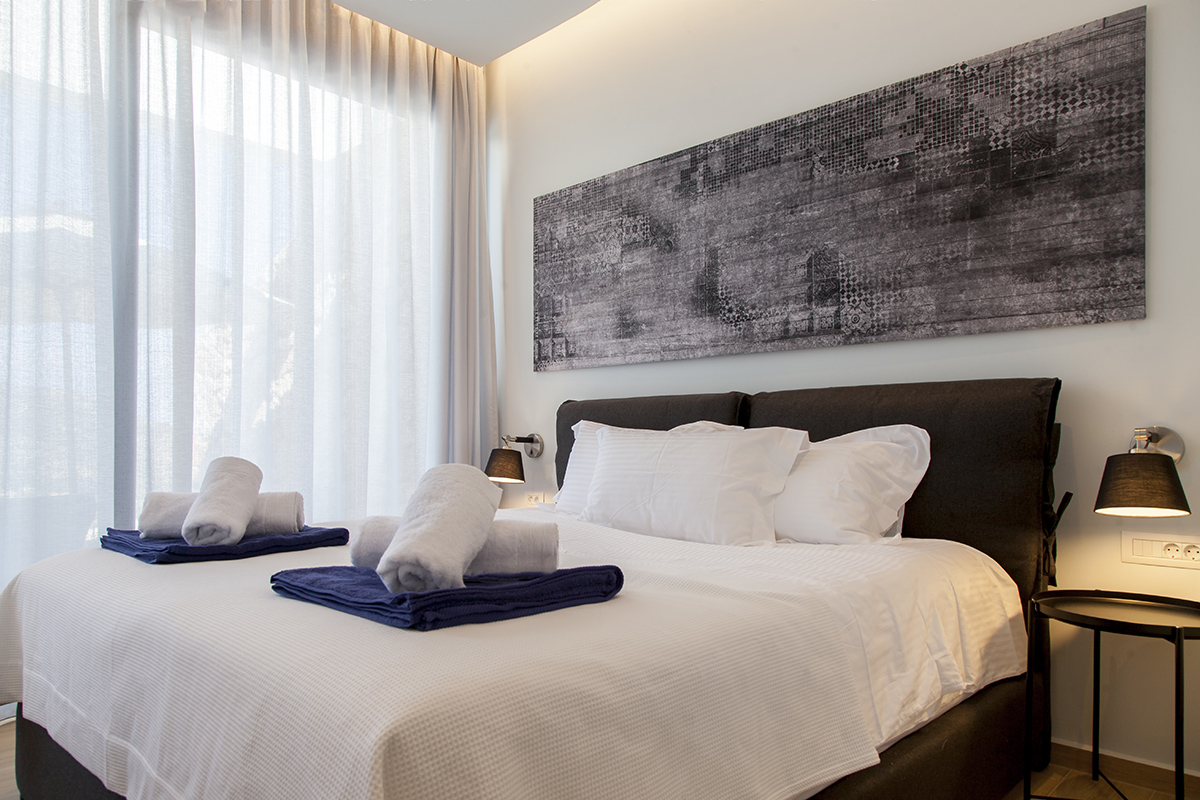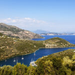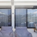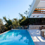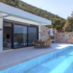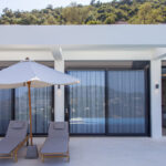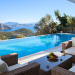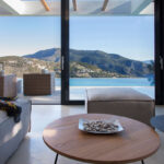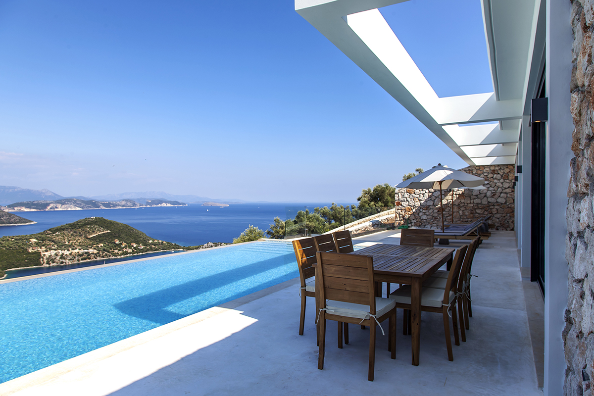 Lucas Villas with impressive interior design in concrete elements and luxurious furnishings are located on the mountainside of Sivota Bay on the island of Lefkada, with panoramic views over the Ionian Sea.