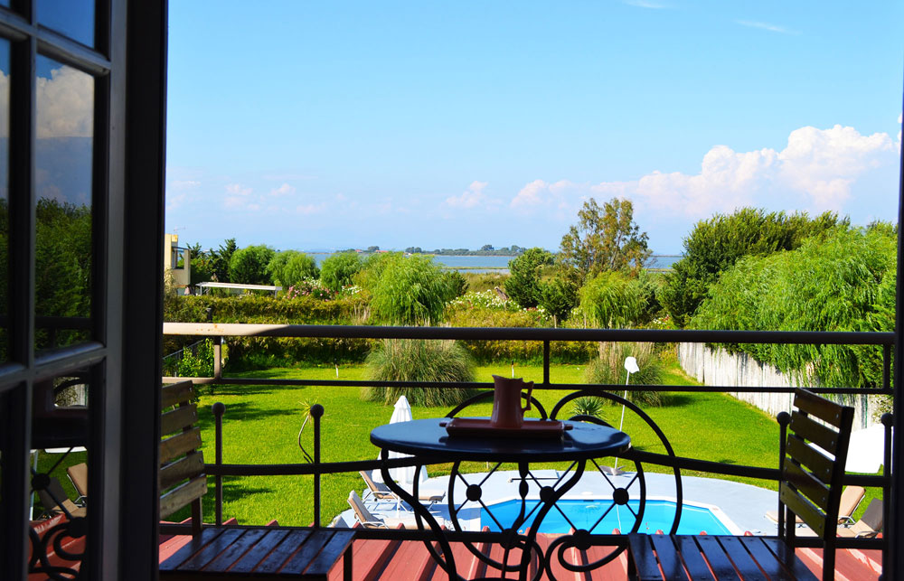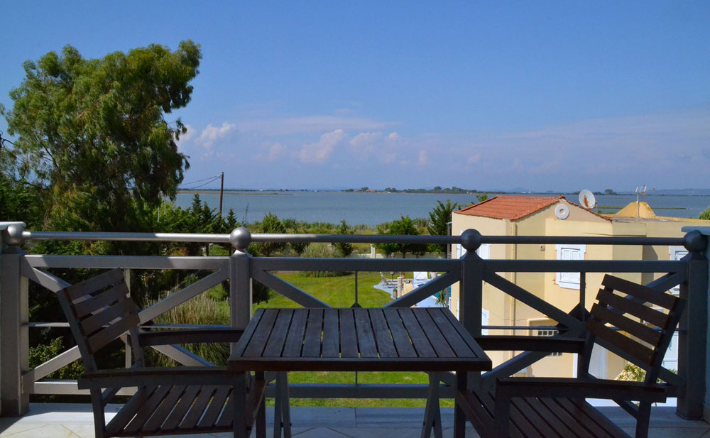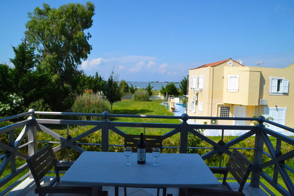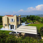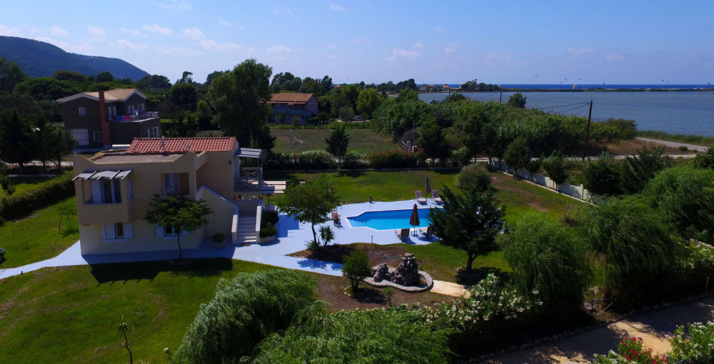 מתחם וילות המשקיף לגונת לפקדה (Lefkada Lagoon) ולטחנות הרוח של אגיוס יואניס (Agios Ioannis), עם נוף עוצר נשימה של הים היוני Ionian sea.