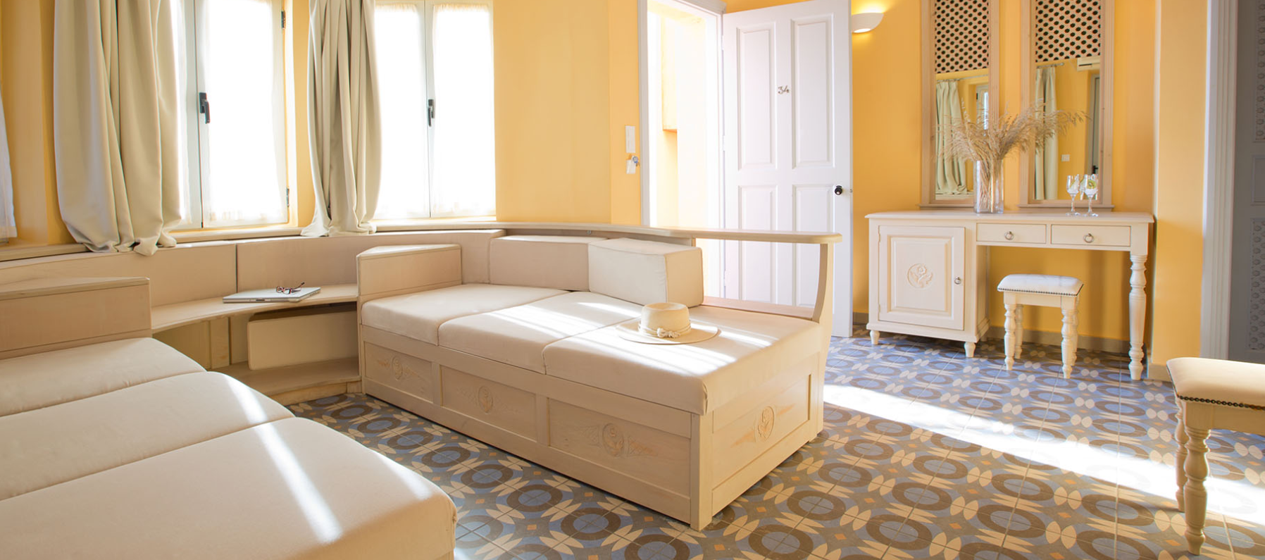 סוויטת משפחה עם נוף לים – עבור 2 מבוגרים, 2 ילדים : מיטת יחיד , מיטת ספה , מיטה זוגית גדולה,מרפסת, פינת ישיבה ומיזוג אוויר.