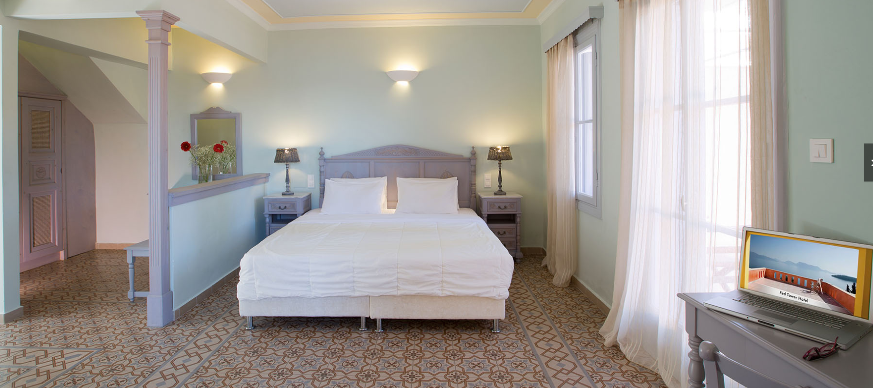 סוויטת Red עם נוף לים – חדר שינה 1: 2 מיטות ספה ו- מיטה זוגית גדולה , חדר מגורים: 2 מיטות ספה, מרפסת, פינת אוכל ומיזוג אוויר.