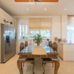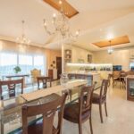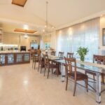 בחלל זה מטבח מאובזר עם אי, פינת אוכל ואזור סלון.