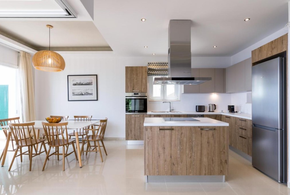 כניסה ראשית עם סלון מרווח ומטבח פתוח מאובזר. חדר אוכל עם מקומות ישיבה ל-8 אורחים הנפתח למרפסת גדולה עם מקומות ישיבה נוחים.