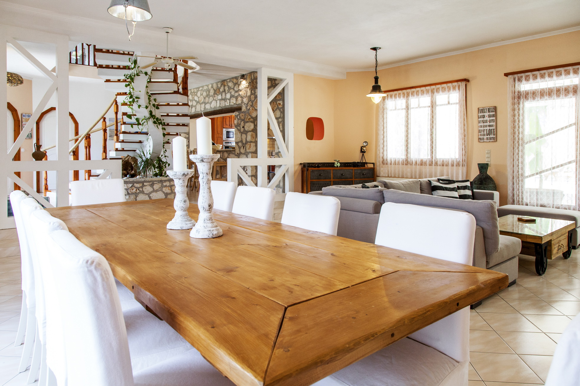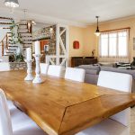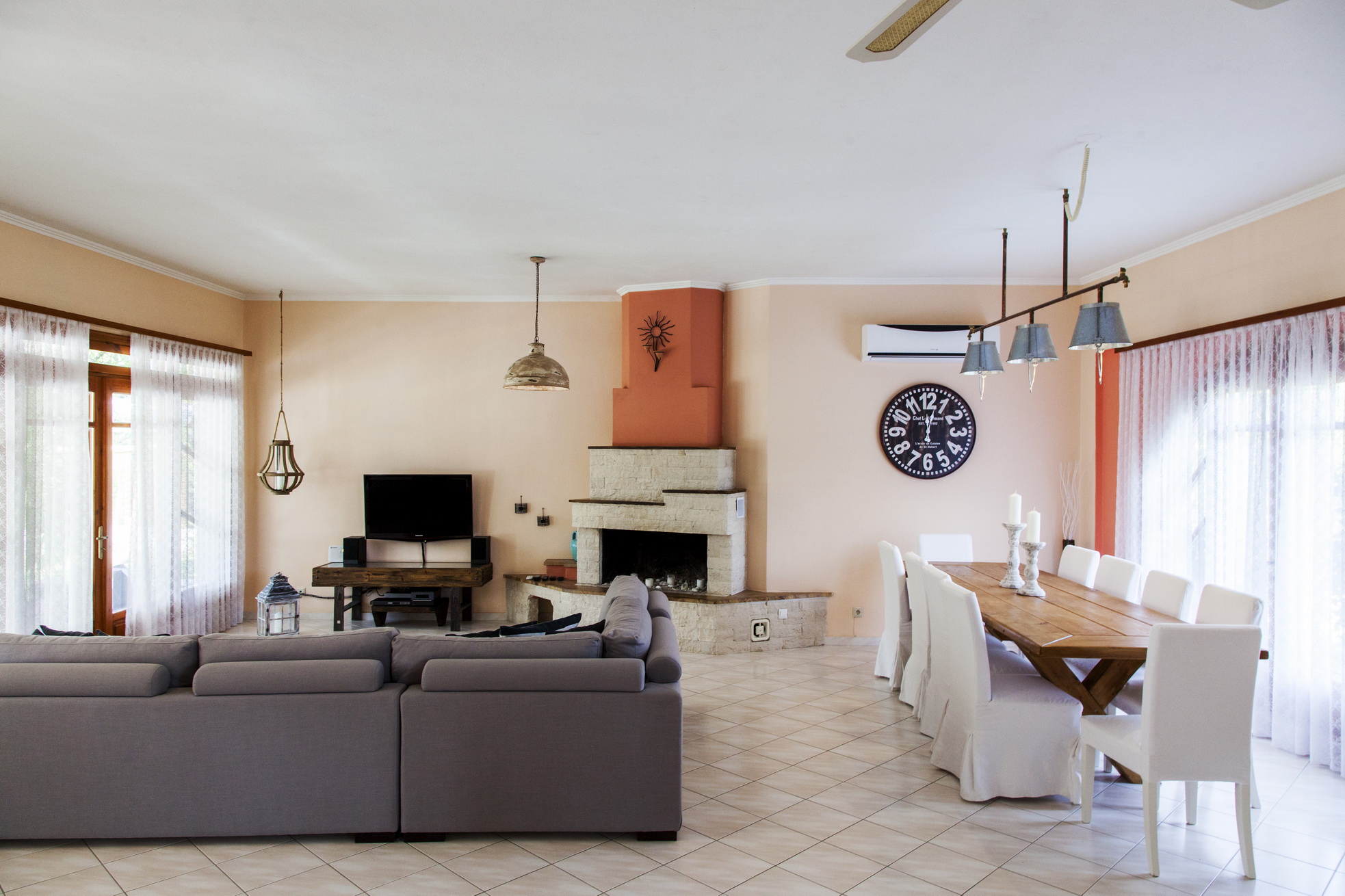 אח, טלוויזיה עם מסך שטוח, שולחן אוכל מעץ שמתאים לעשרה אנשים.