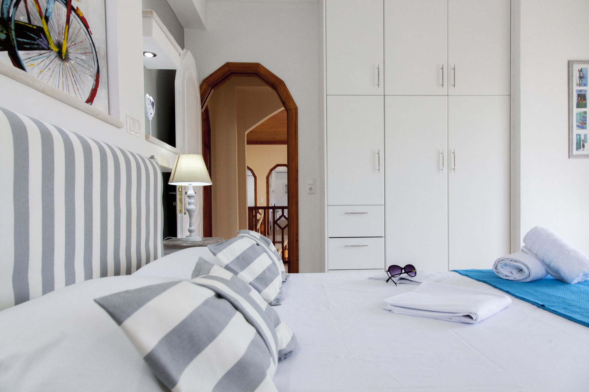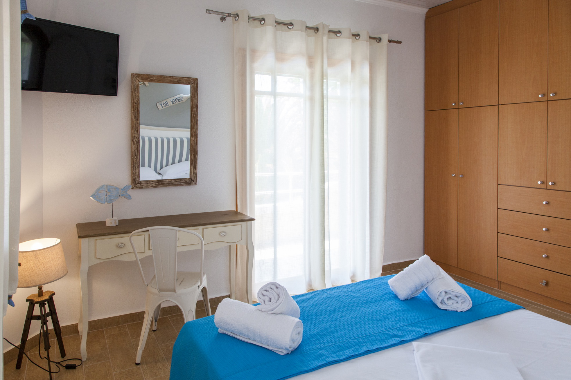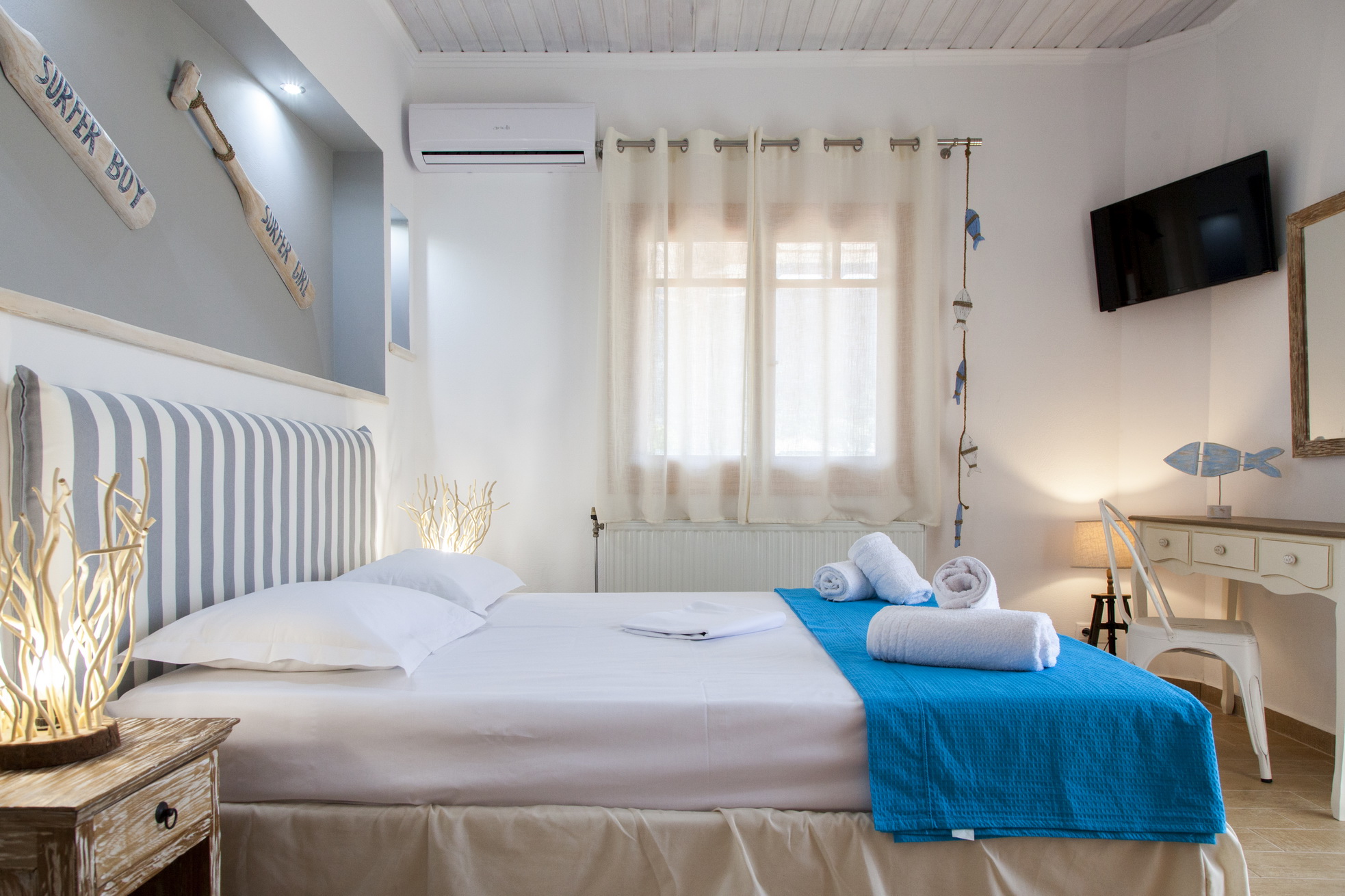 3 חדרי השינה עם מיטה זוגית, טלוויזיה, מיזוג אוויר ומאוורר תקרה.