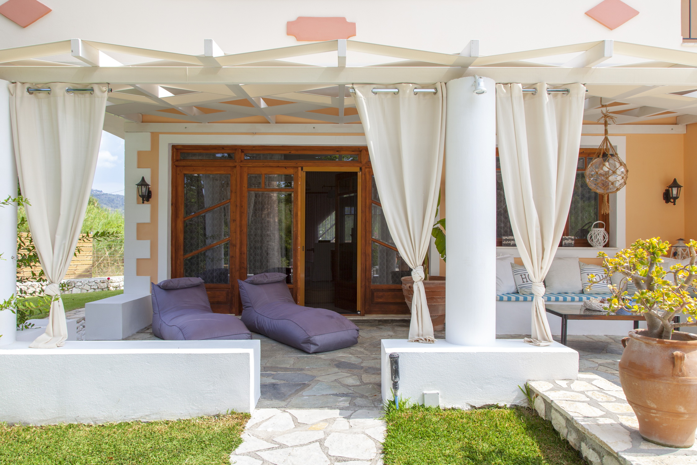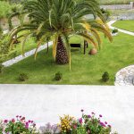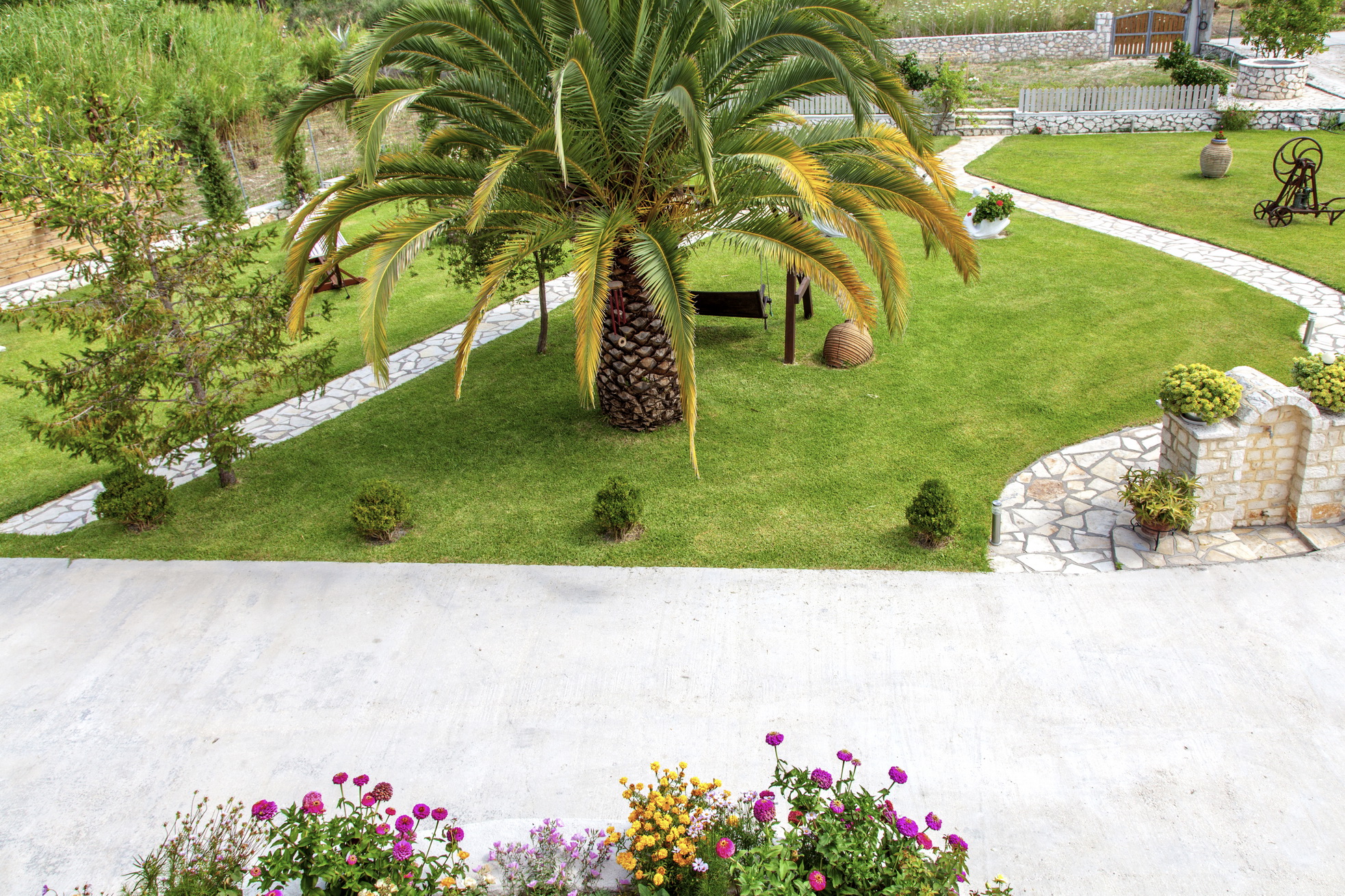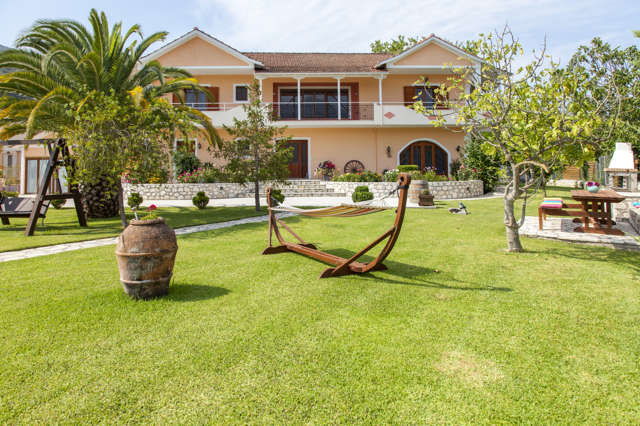 המאפיין העיקרי של הצד החיצוני של הווילה הוא הדשא ושבילי האבן.