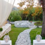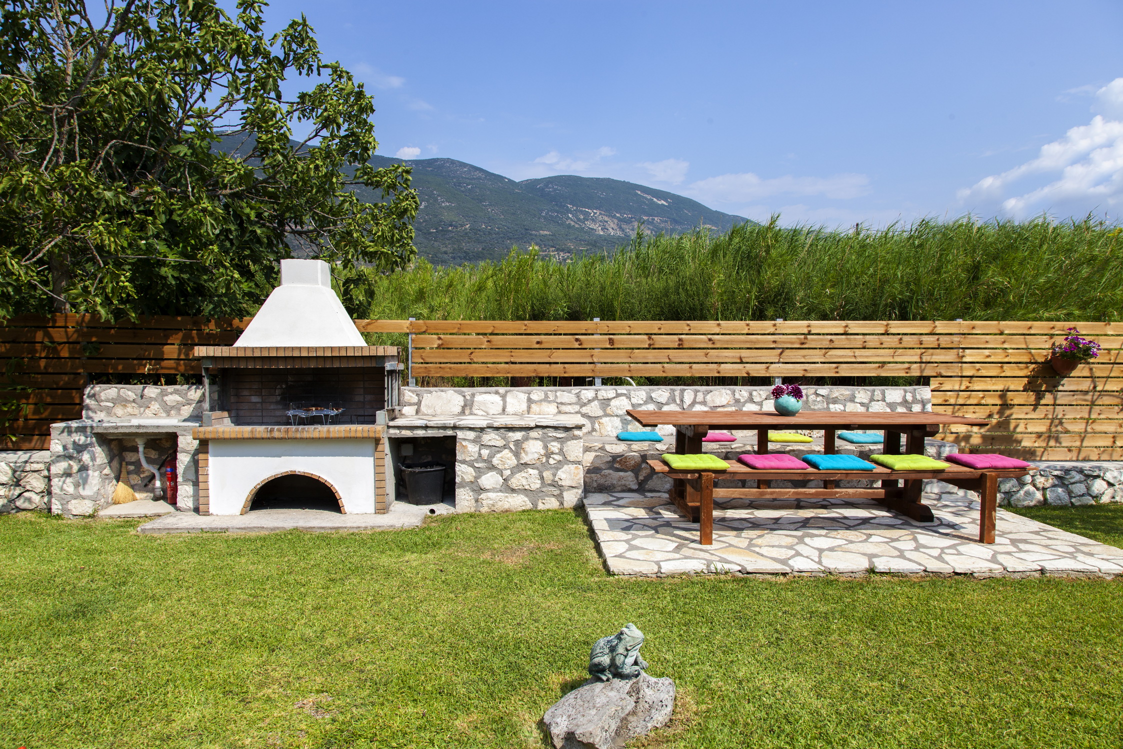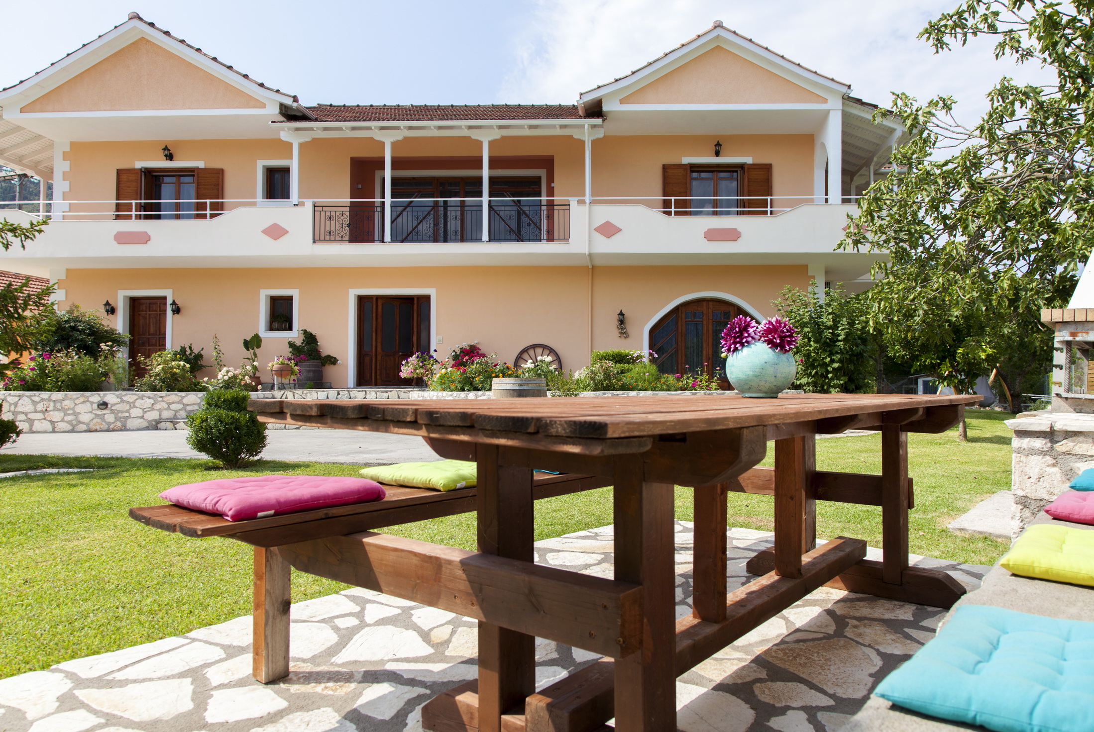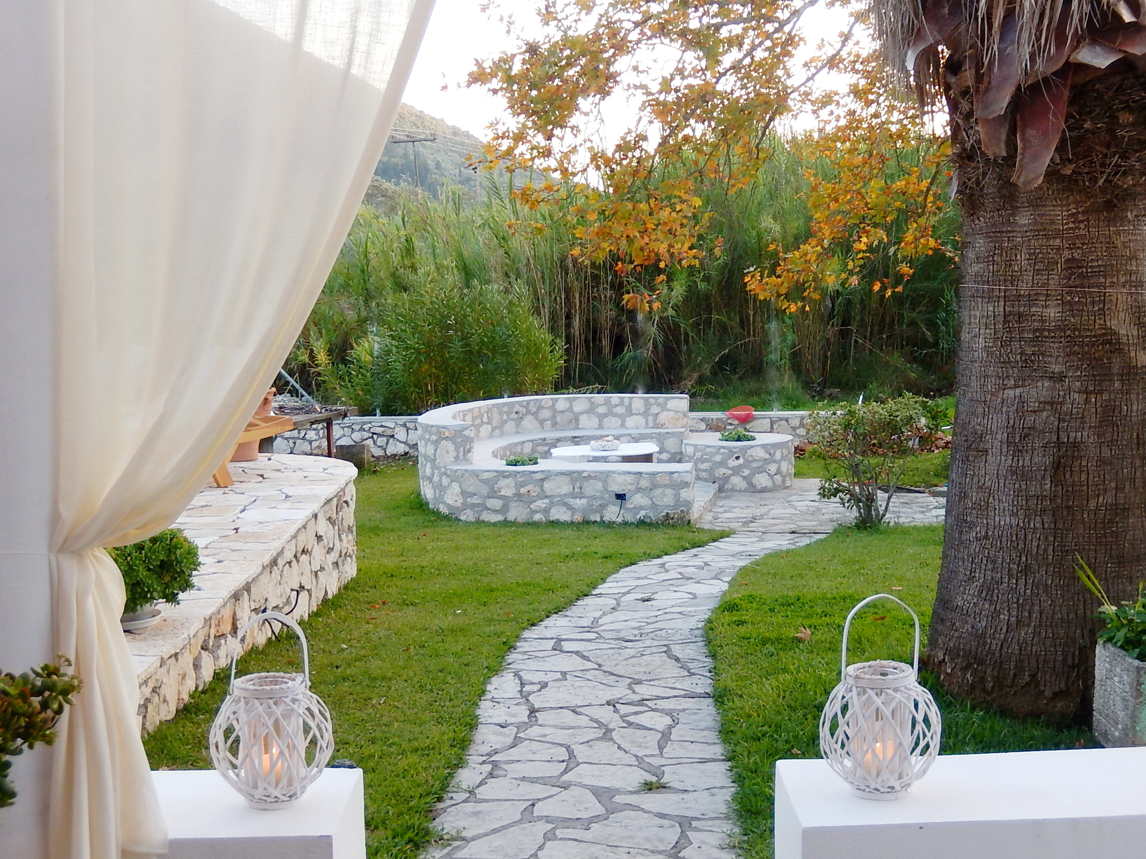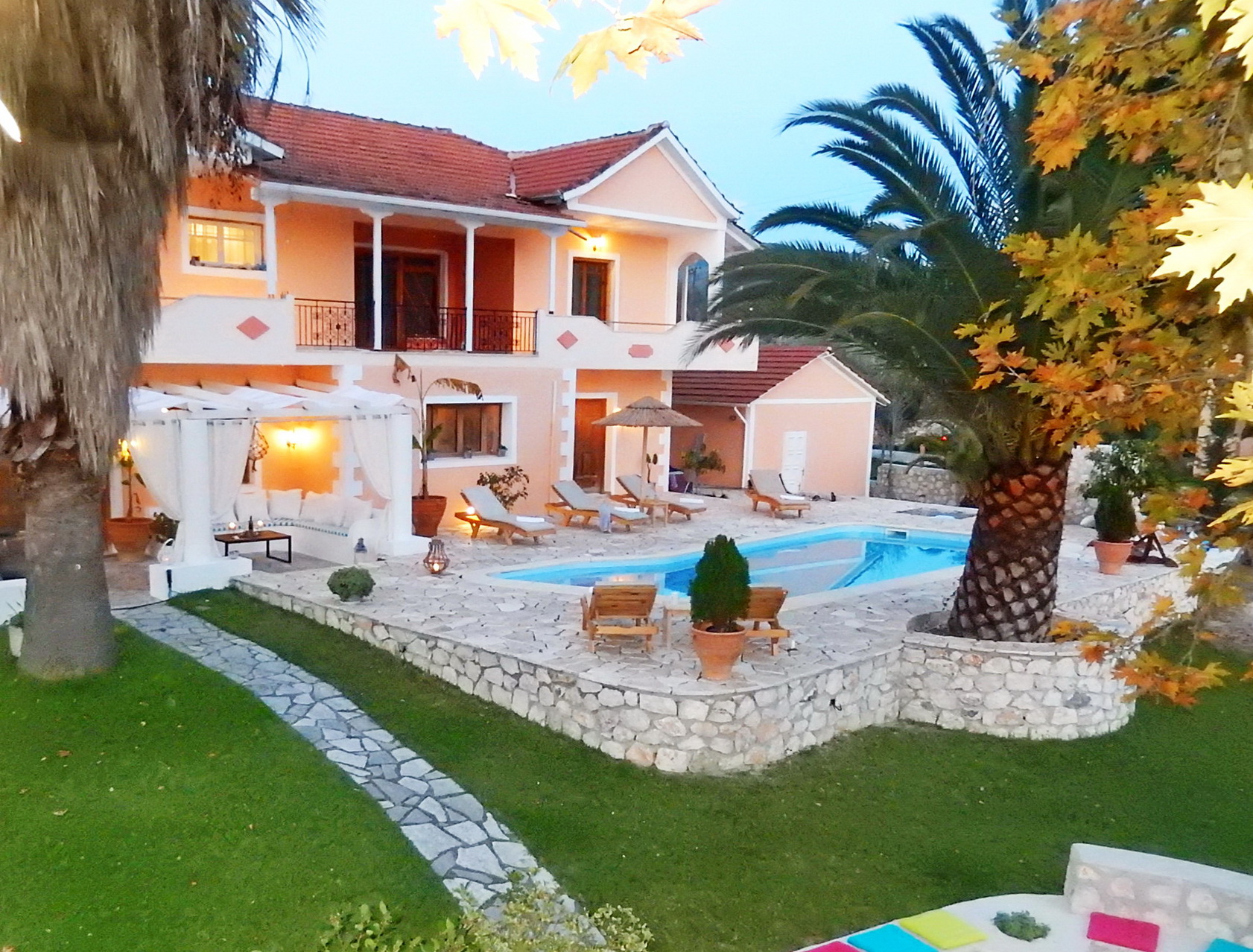 המאפיין העיקרי של הצד החיצוני של הווילה הוא הדשא ושבילי האבן.