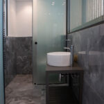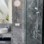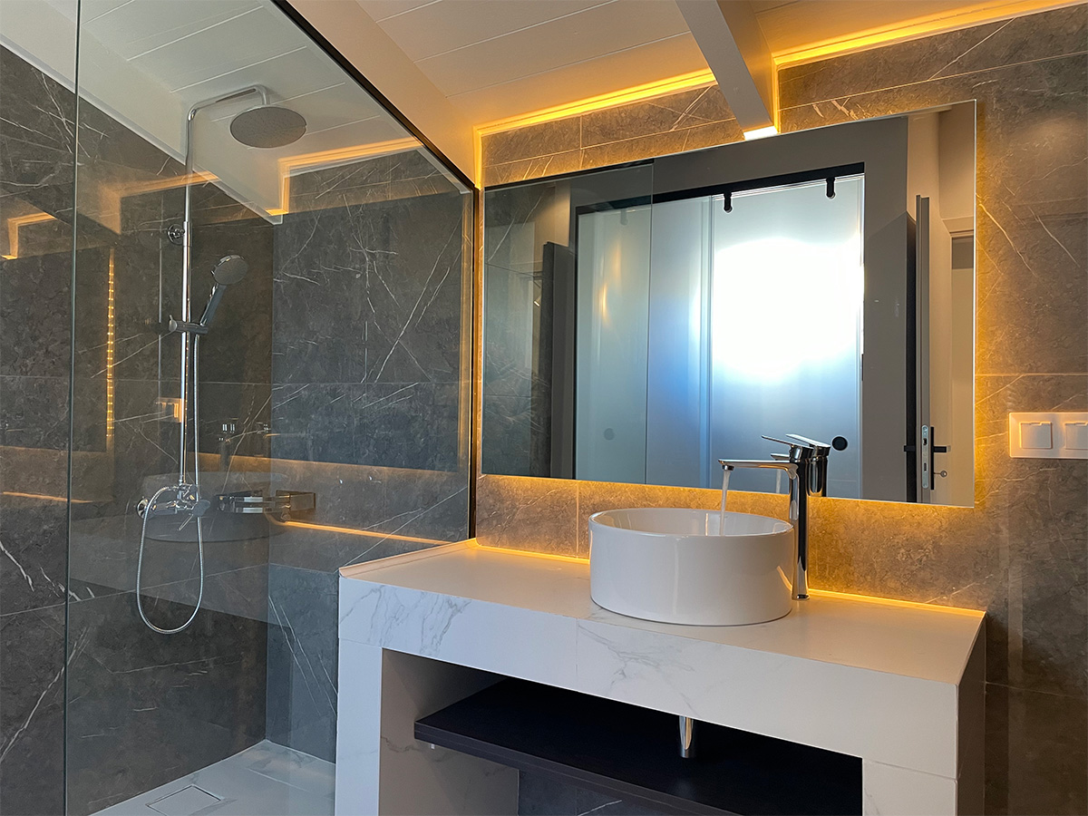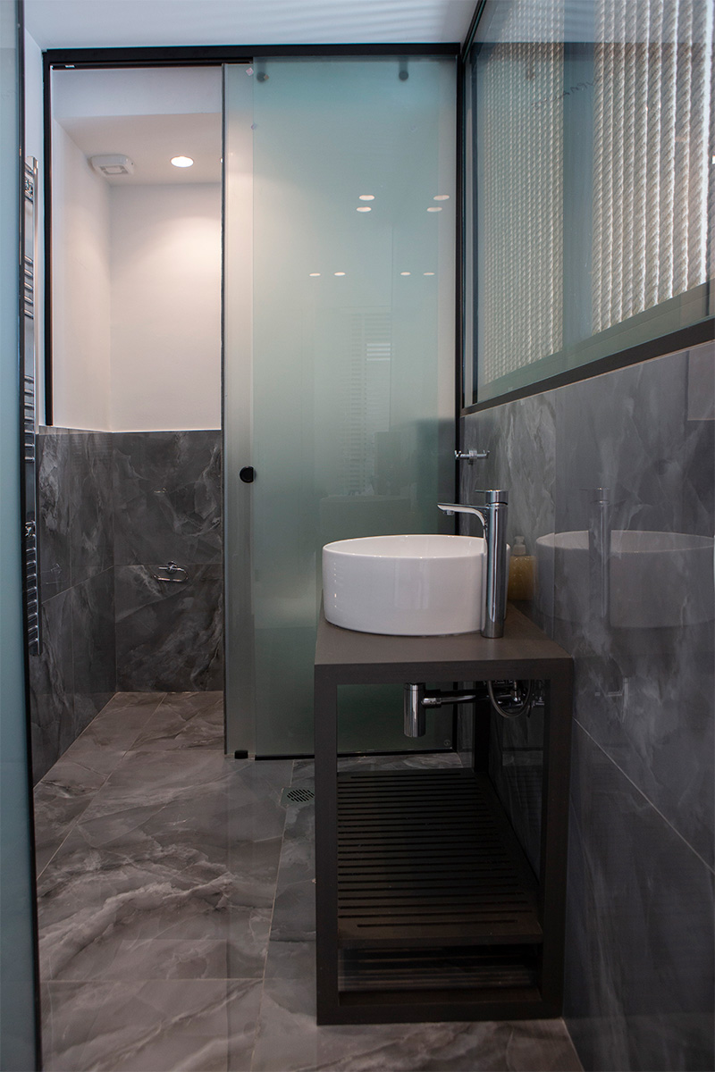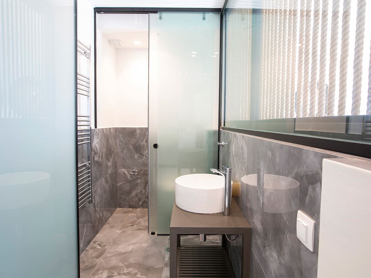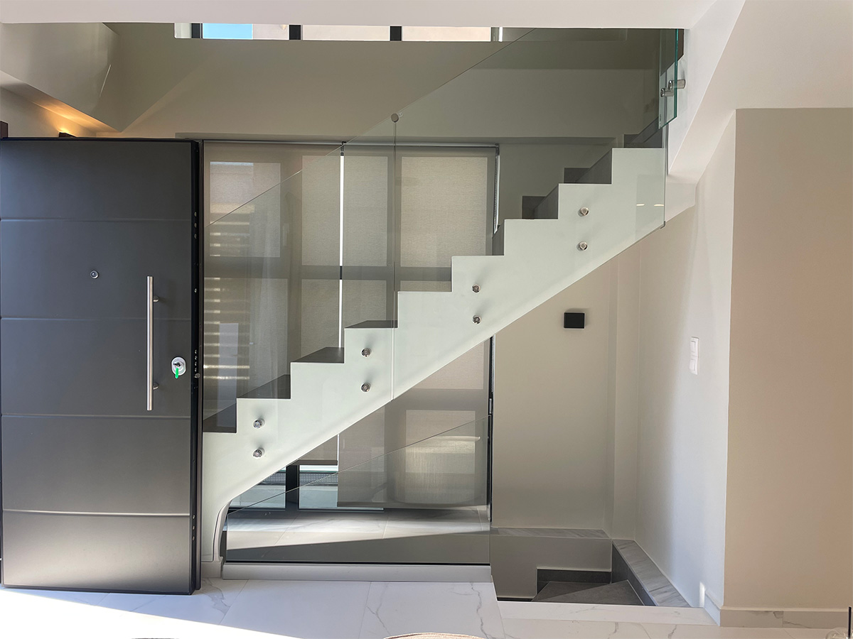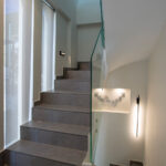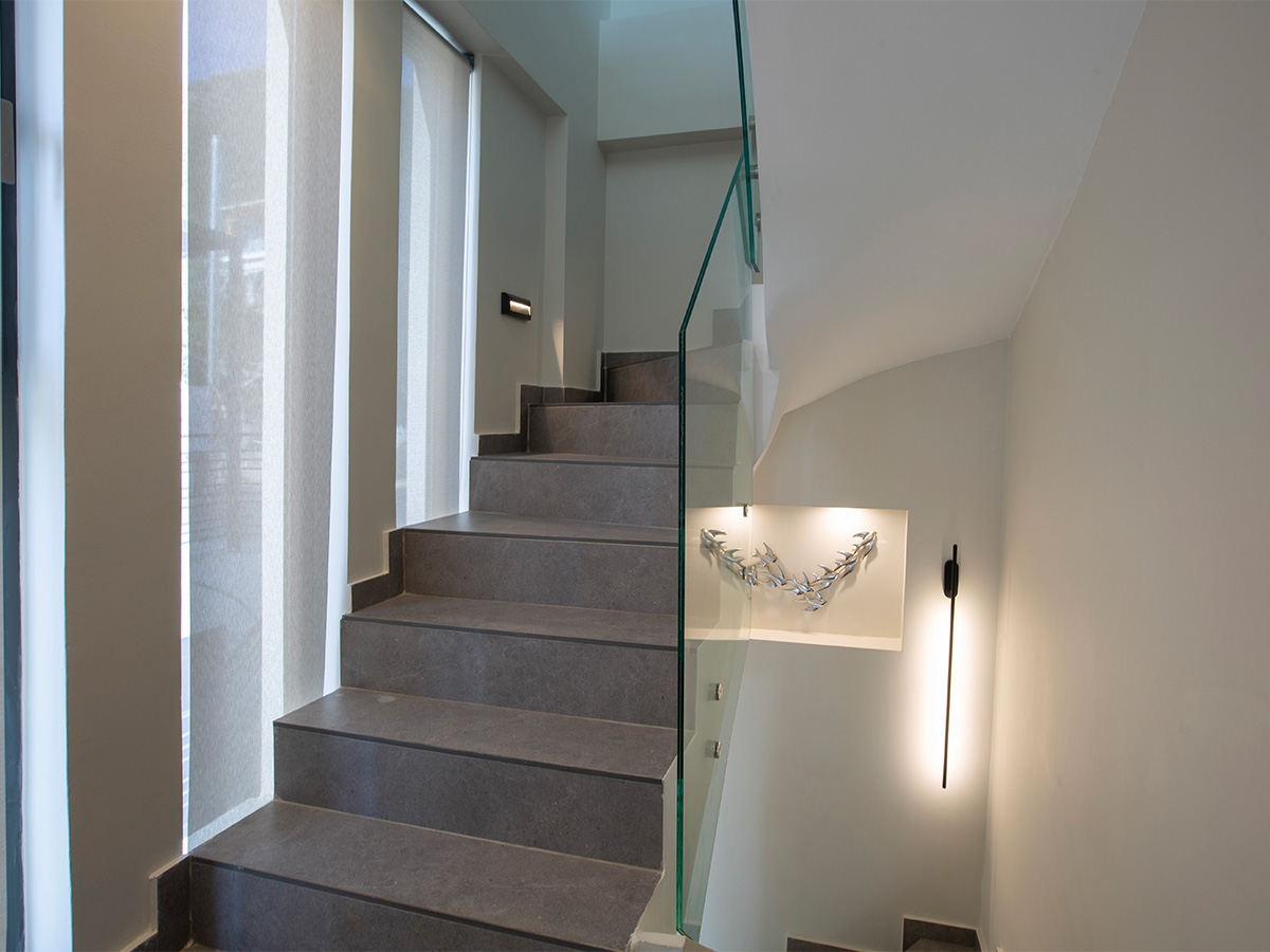 גרם מדרגות עם לוחות זכוכית מובילים לעד 2 חדרי שינה זוגיים כל אחד עם חדרי הרחצה הצמודים שלו. לאחד מהם מרפסת הפונה מזרחה עם נוף מרהיב לים ולנוף הטבעי המרשים שמסביב. מהטרקלין גרם מדרגות מוביל גם לאזור מגורים פתוח שני עם טרקלין, מטבח וחדר רחצה מלא וחדר שינה זוגי נוסף.