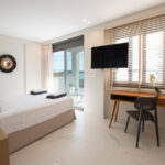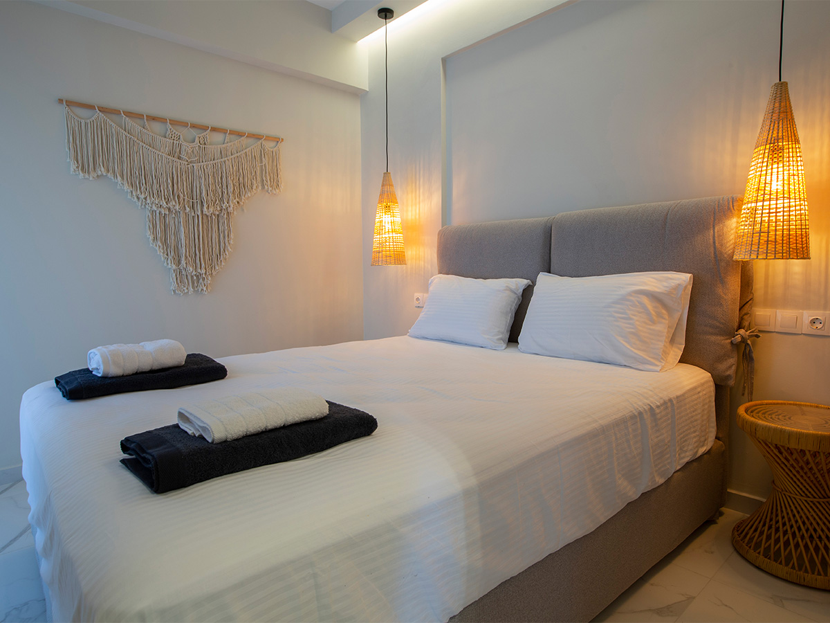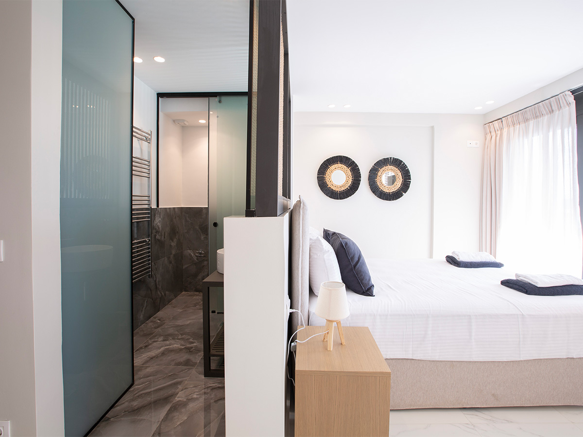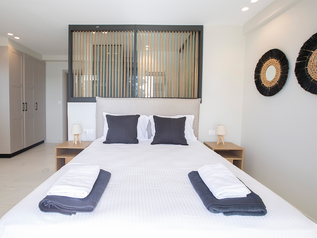- חדר שינה 1: מיטת קינג סייז, חדר רחצה צמוד עם תא מקלחת, טלוויזיה, גישה למרפסת, נוף לים