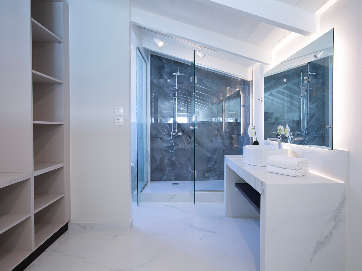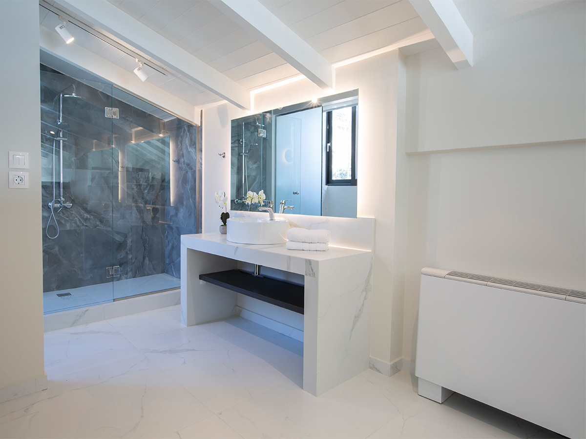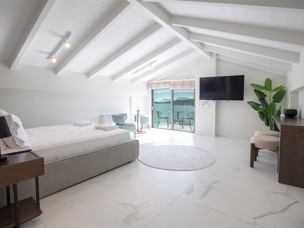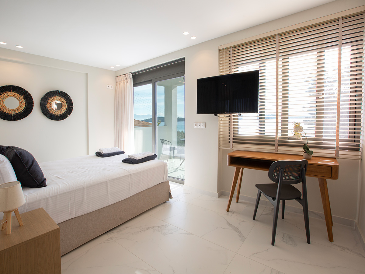 - חדר שינה 3: מיטת קינג סייז, חדר רחצה צמוד עם תא מקלחת, מקלחת חיצונית פרטית, טלוויזיה, חלל עבודה ייעודי, גישה למרפסת, נוף לים.