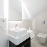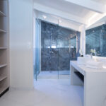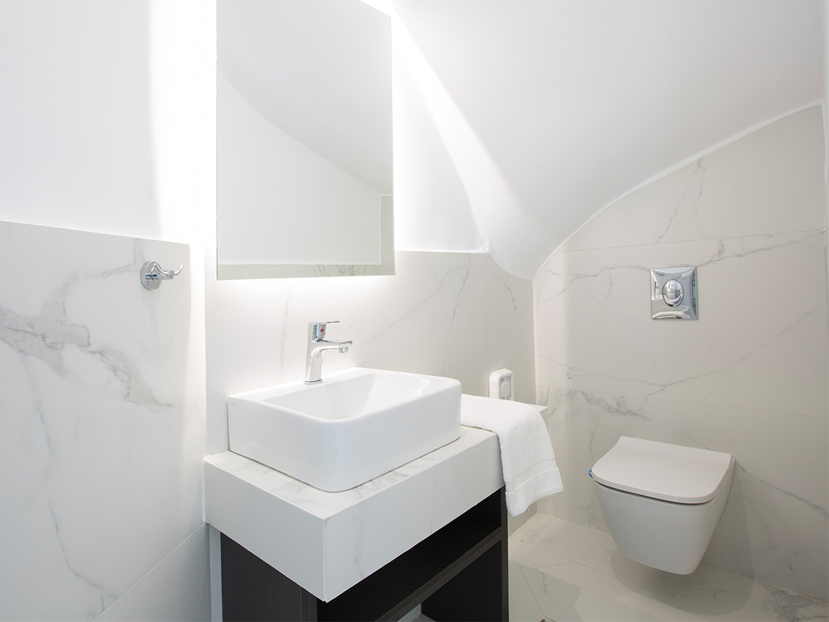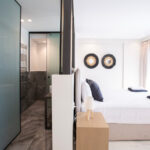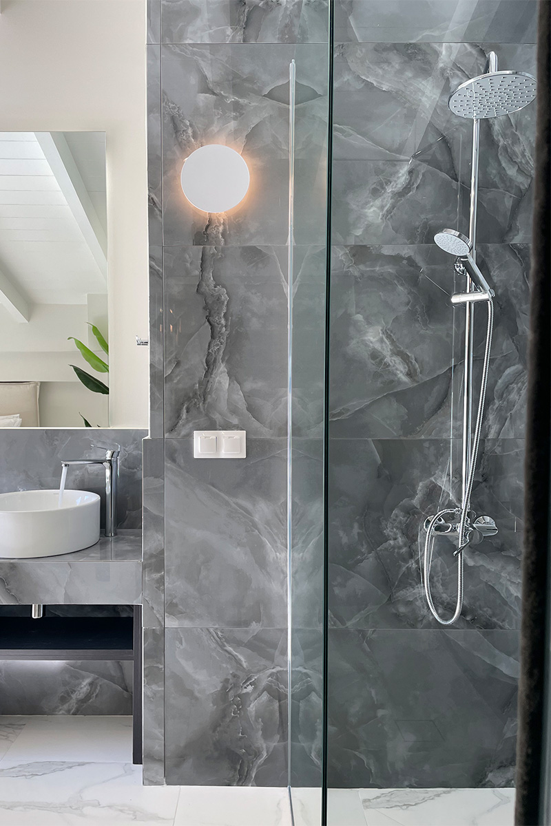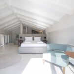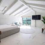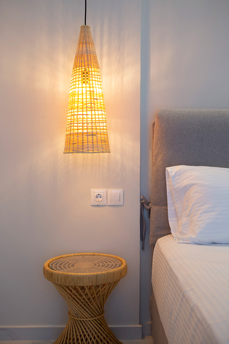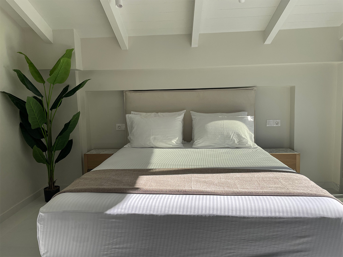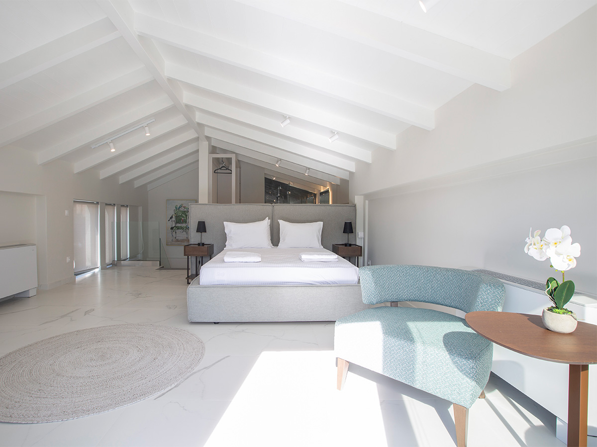 גרם מדרגות מוביל באופן דיסקרטי ל-3 חדרי השינה של הקומה הראשונה והשנייה. המפלס הראשון מציע 2 חדרי שינה זוגיים כל אחד עם חדרי הרחצה הצמודים שלהם, בעוד שבהמשך למפלס השני שוכן חדר שינה זוגי פתוח ומרווח מעוצב להפליא, עם תקרות עם קורות עץ פתוחות, חדר רחצה צמוד, מרפסת פרטית ונוף פנורמי לים.