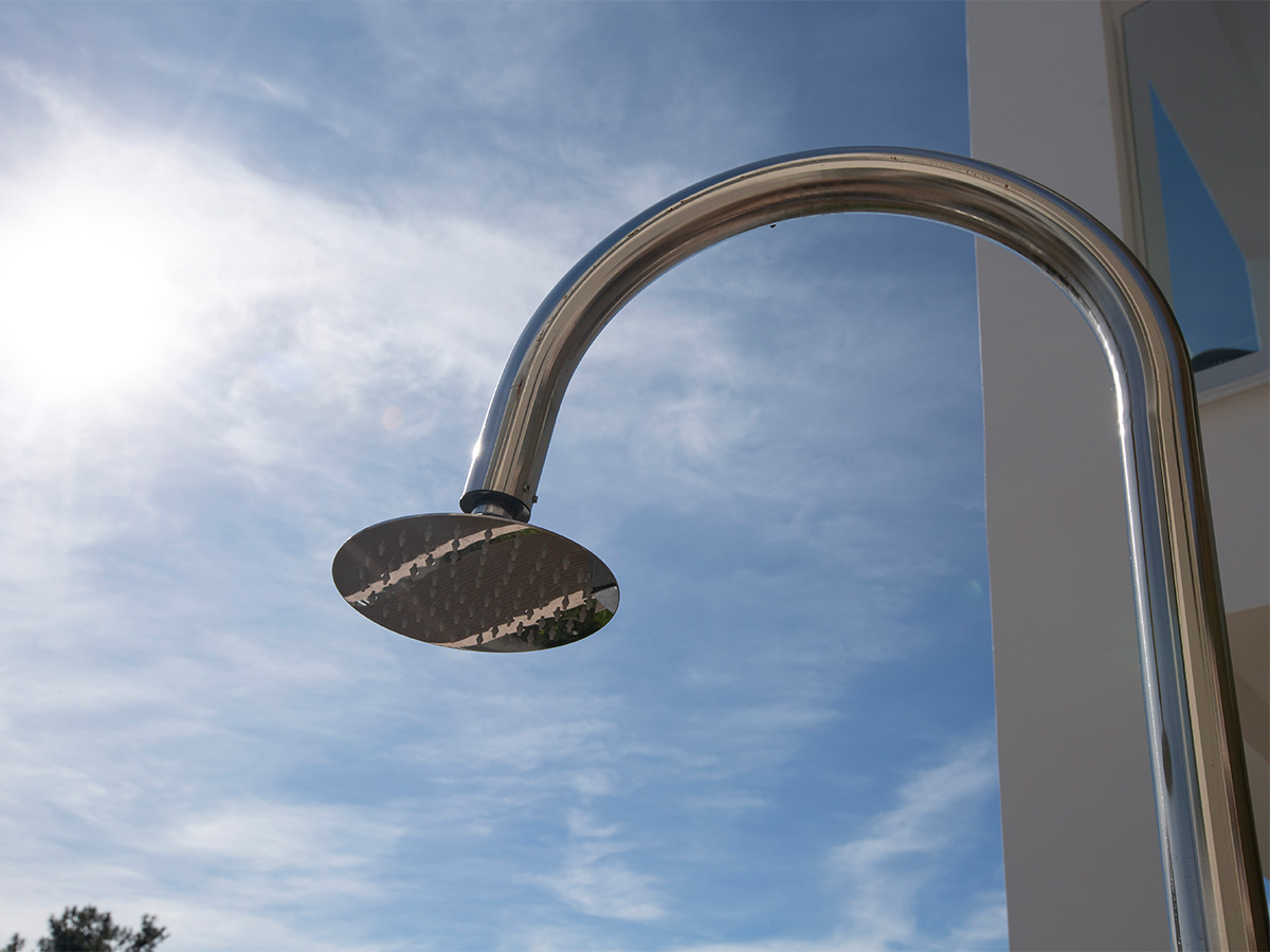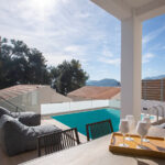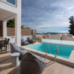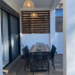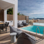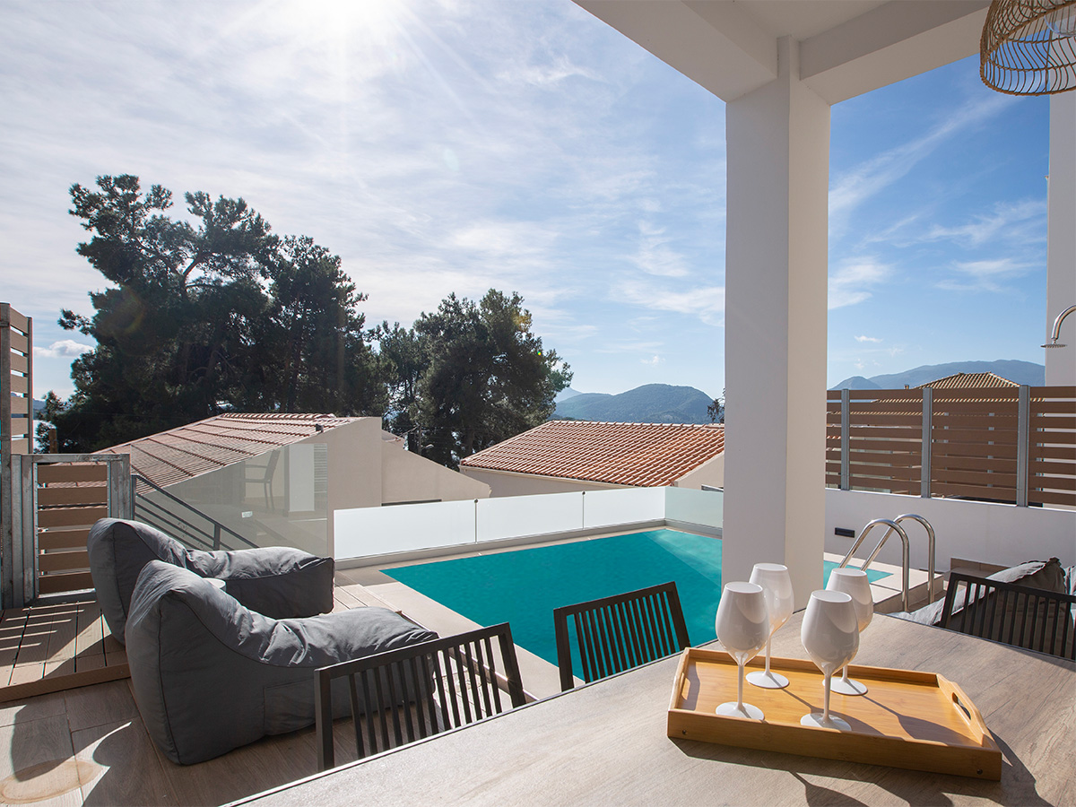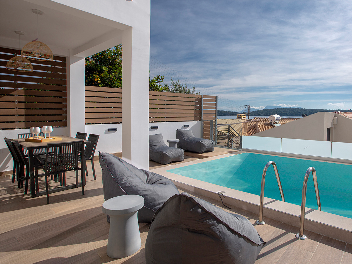 בחוץ, מרפסת שמש מוצלת עם בריכה פרטית משתרעת מאזור המגורים, מרוהטת עם כסאות נוח נוחים ברביקיו ופינת אוכל חיצונית לארוחות ערב באוויר הפתוח.