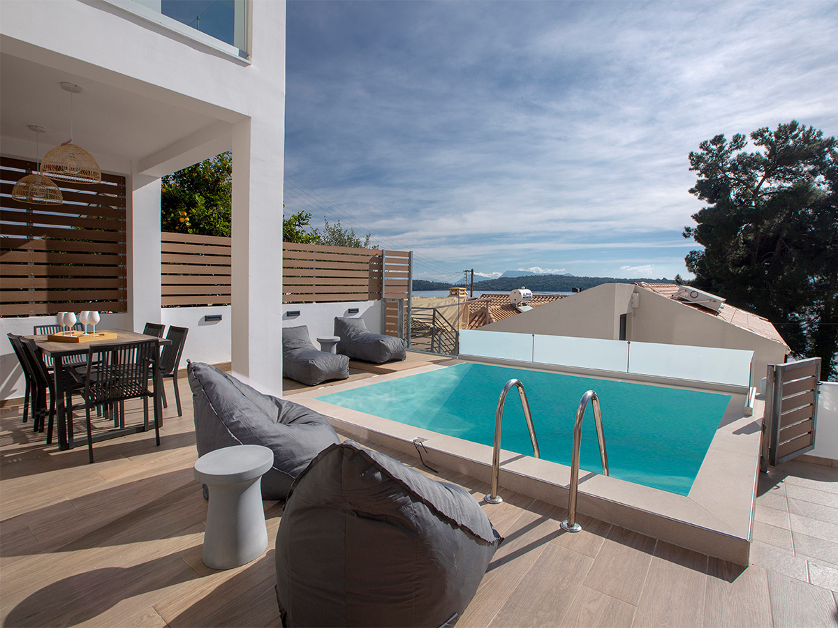 אזור הווילות החיצוני מרוהט היטב, דלתות פטיו גדולות יוצאות מאזור המגורים אל מרפסת השמש המציעה פינת אוכל מוצלת ובריכת מים עמוקים במרכז הבמה מרוהטת עם כיסאות נוח נוחים וברביקיו על גז בפטיו ליד המטבח.