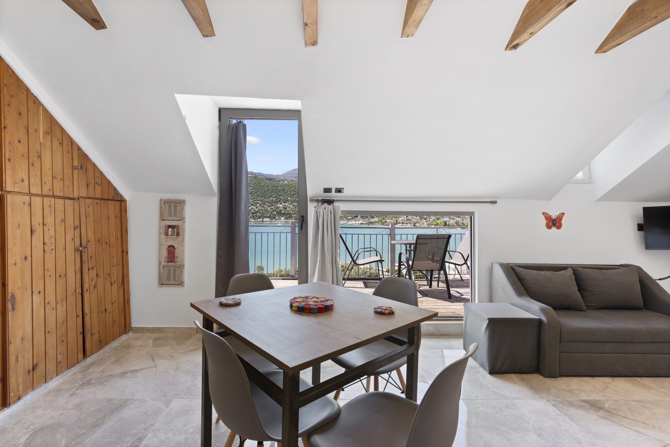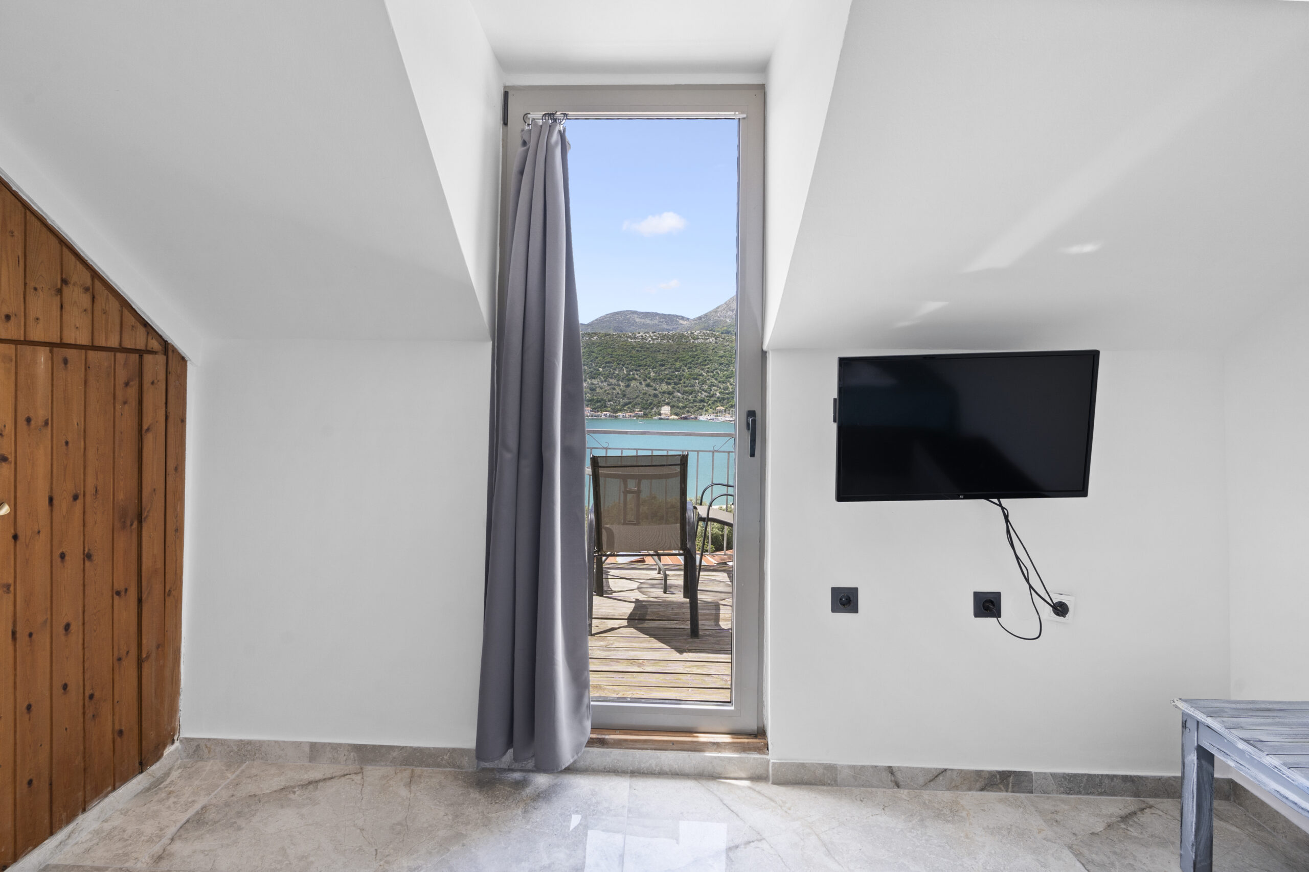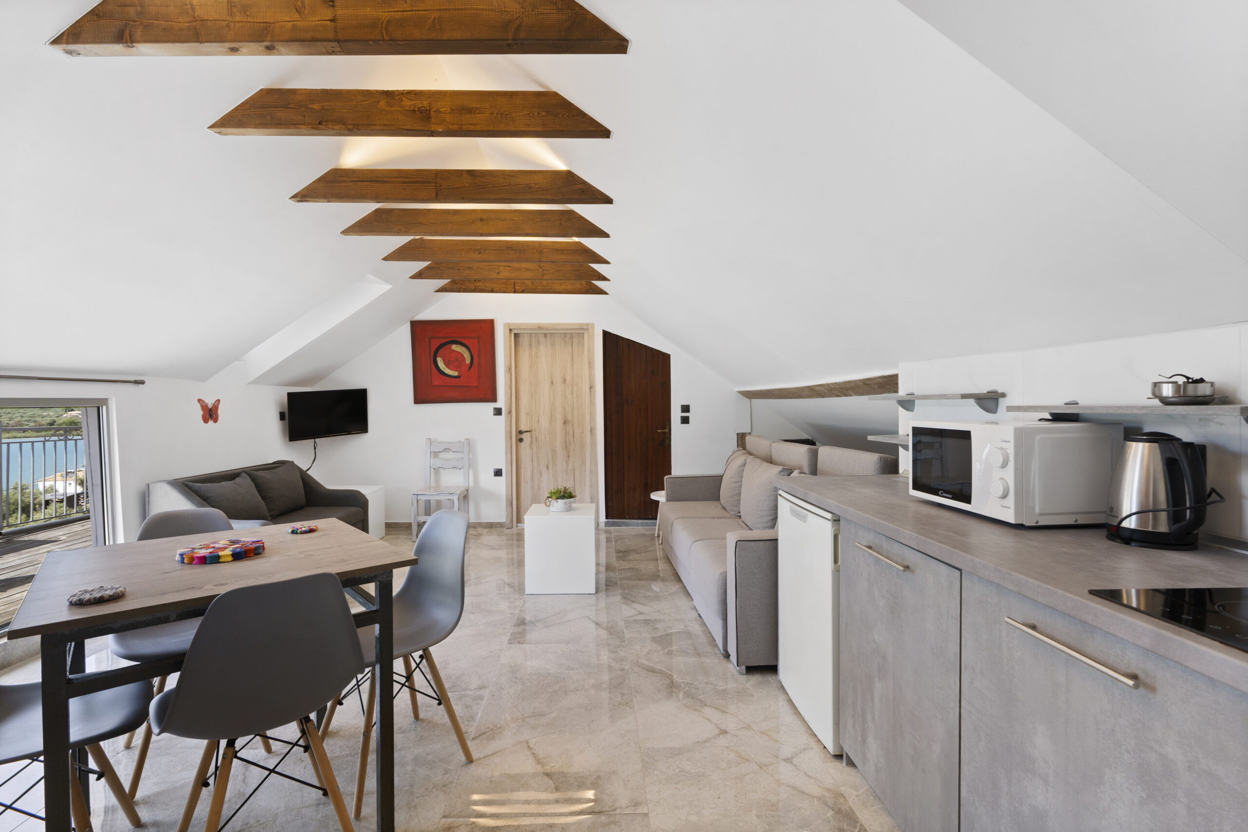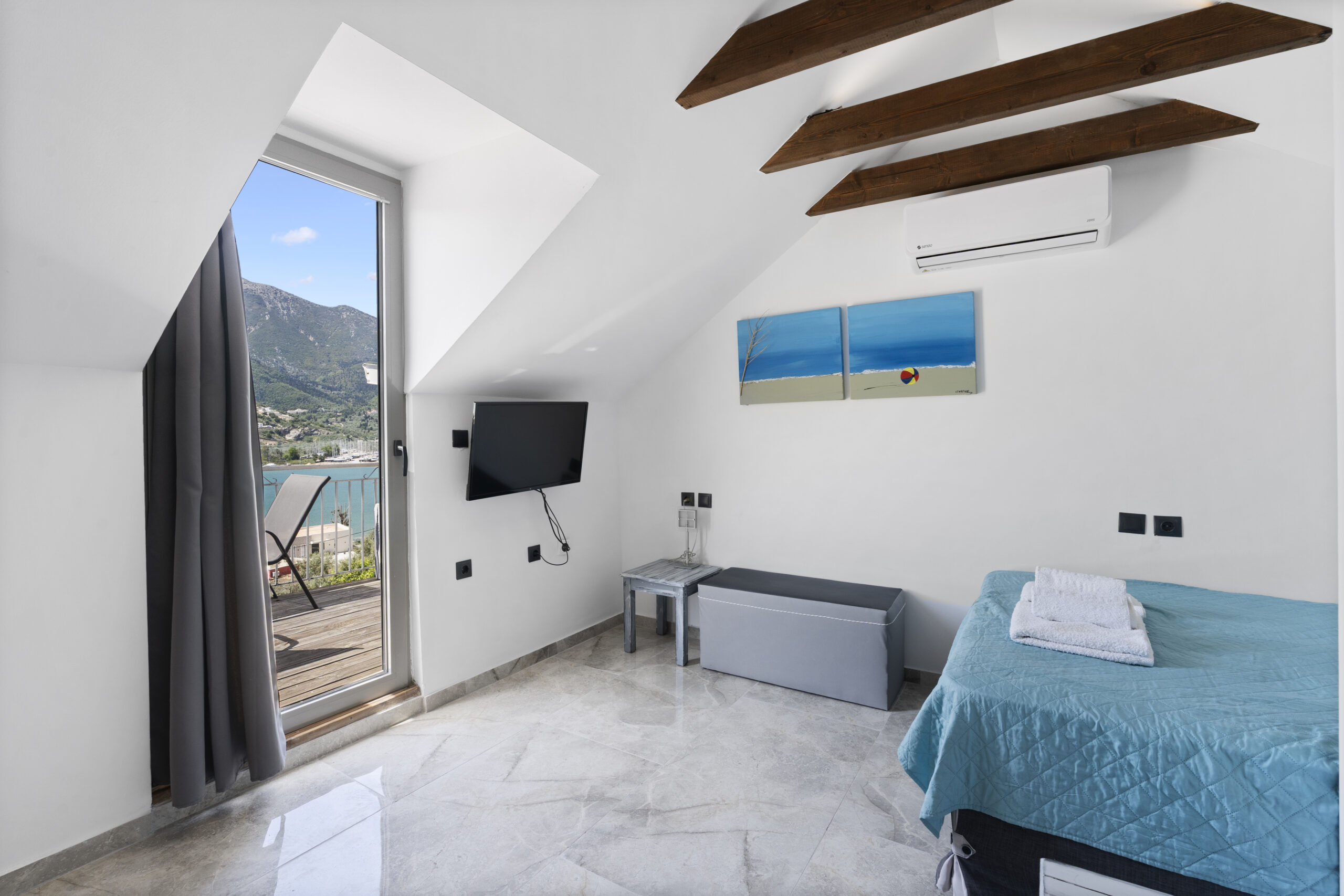 1 סוויטה גדולה בקומה עליונה עם חדר שינה אחד, סלון, 78 מ"ר עם מרפסת של 14 מ"ר הפונה למפרץ נידרי., מצוידת ב: