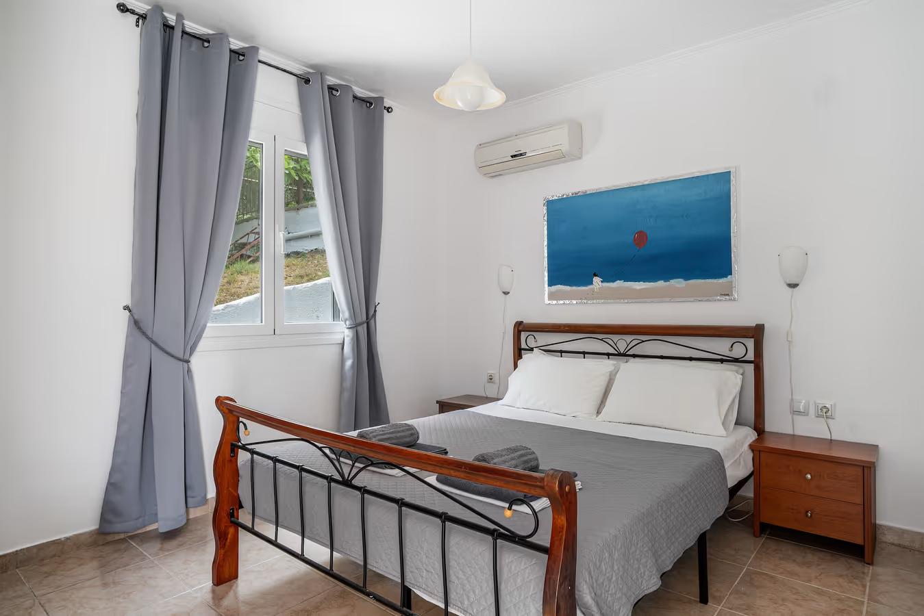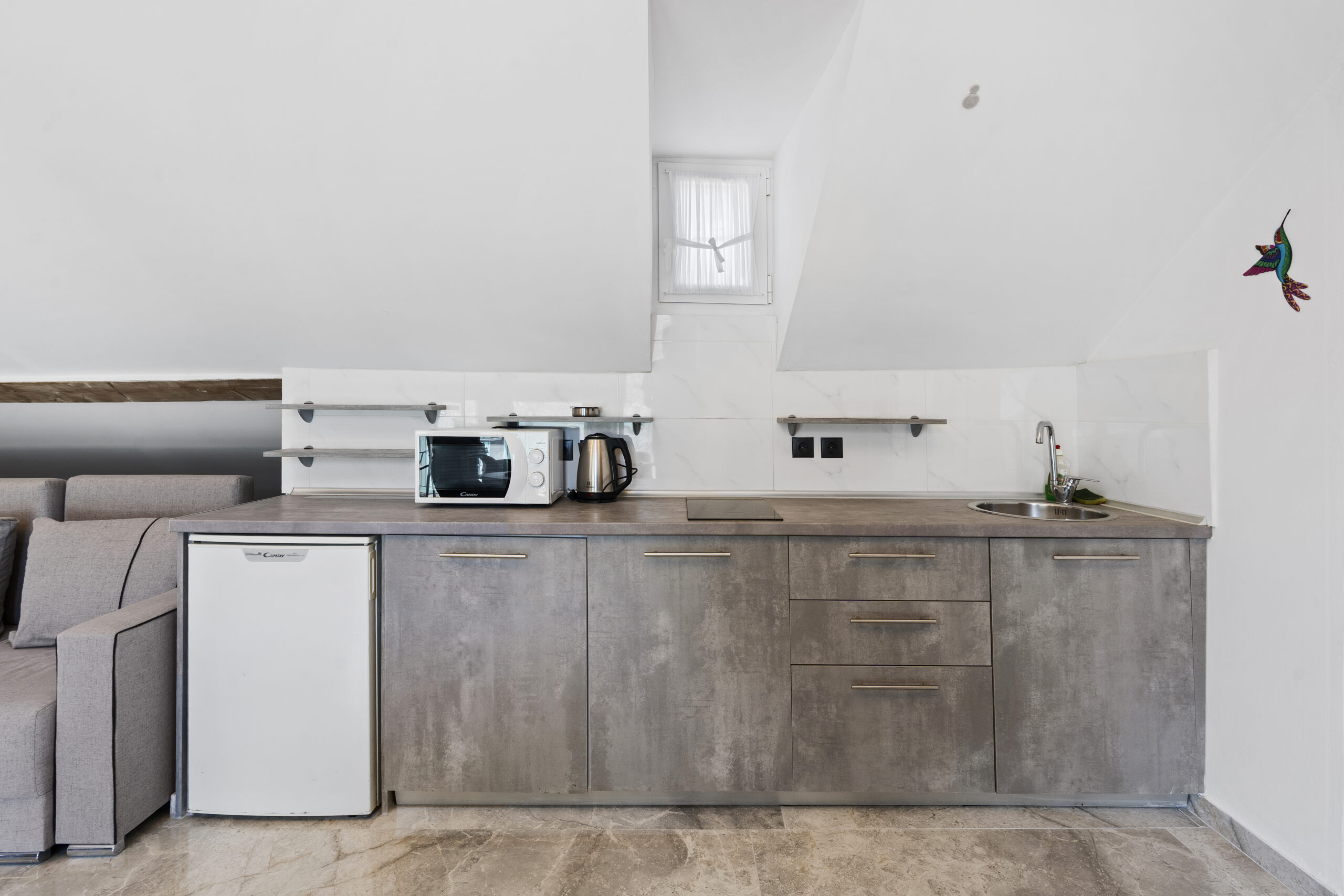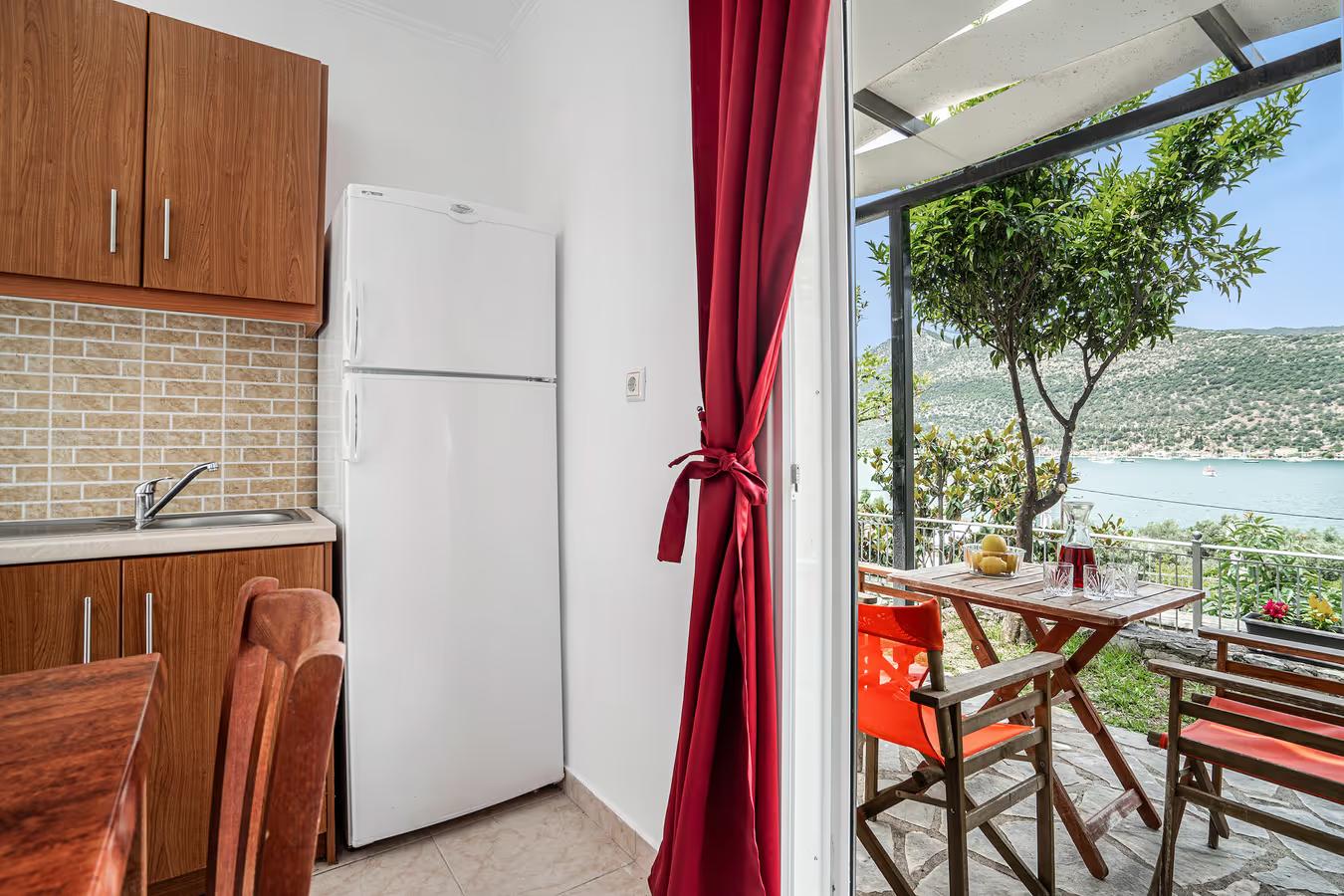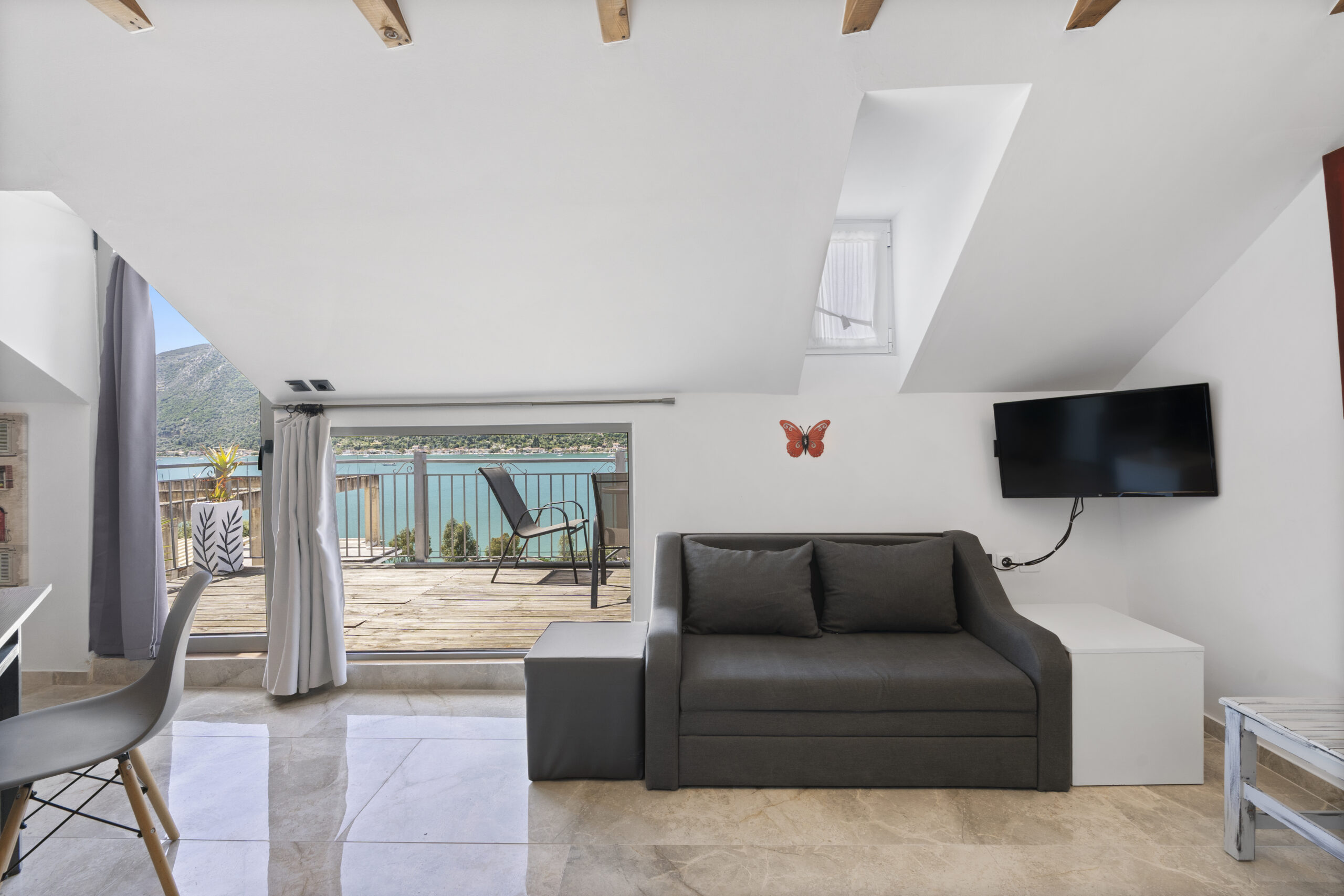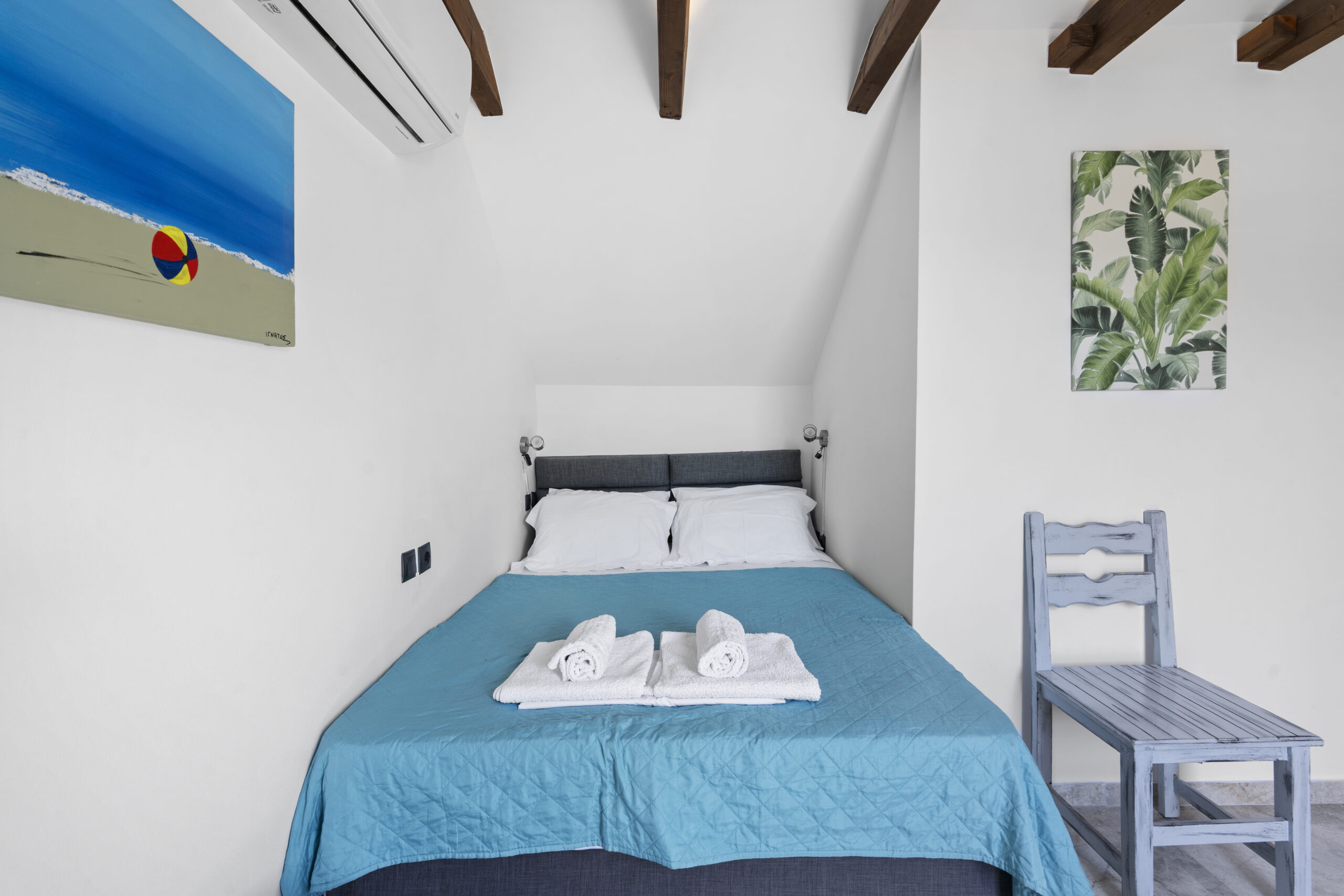1 סוויטה גדולה בקומה עליונה עם חדר שינה אחד, סלון, 78 מ"ר עם מרפסת של 14 מ"ר הפונה למפרץ נידרי., מצוידת ב: