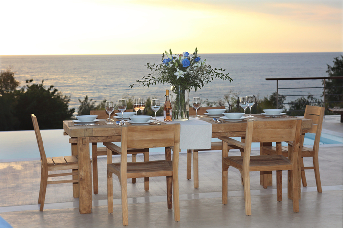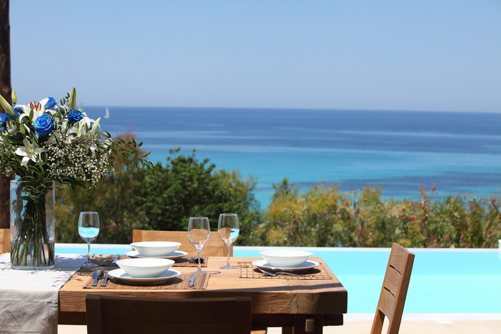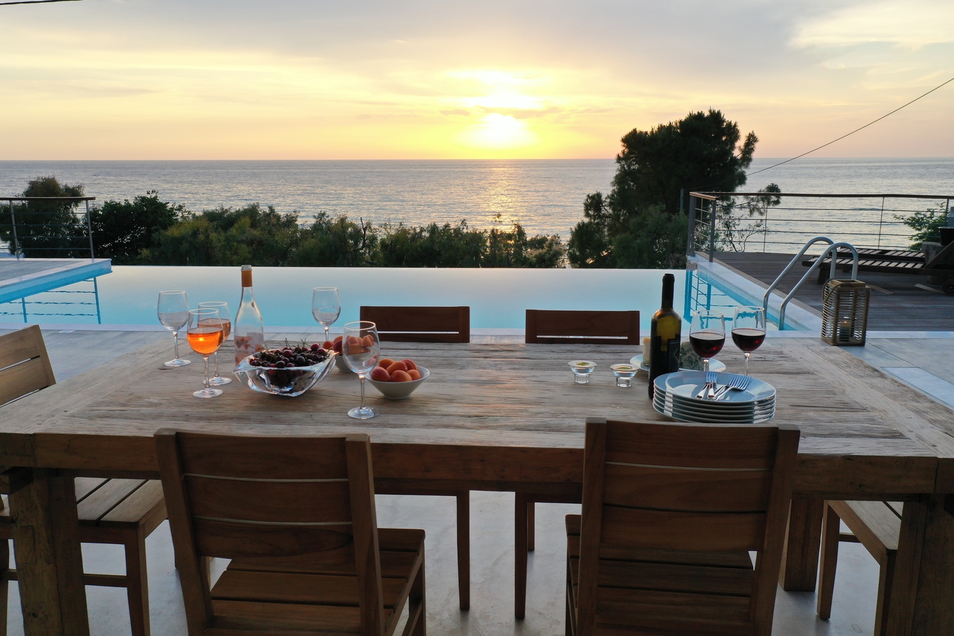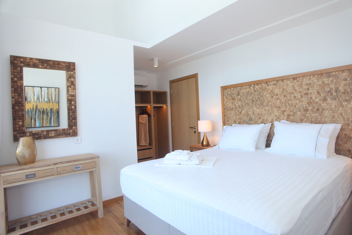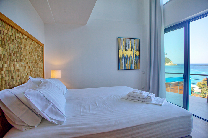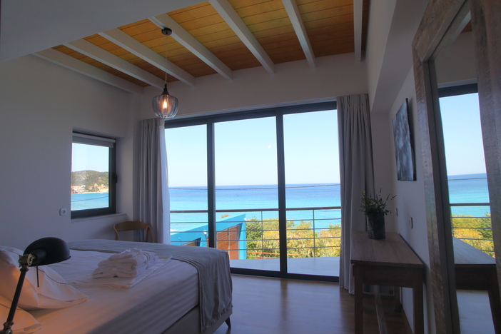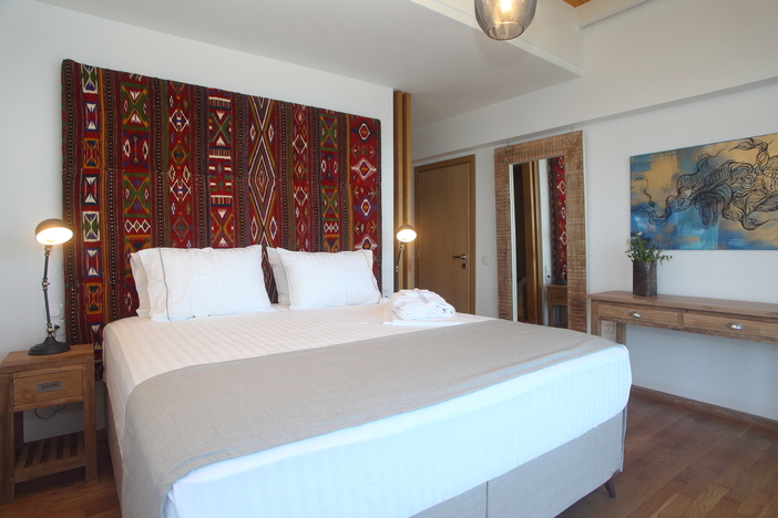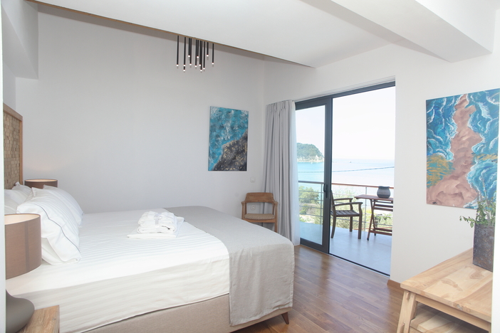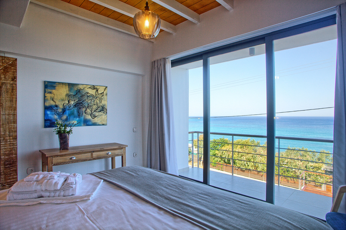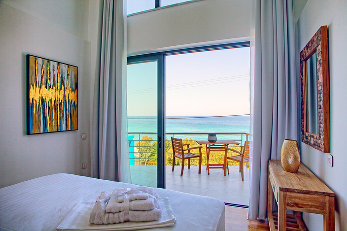 מיקומי המיטות ופריסה של החדר תוכננו כדי לצפות בנופים של הים התיכון והשקיעות היפות שלו מכל מקום בו אתם נמצאים. מרפסות גדולות פונות ל קו החוף המואר מהכפר אגיוס ניקיטאס .