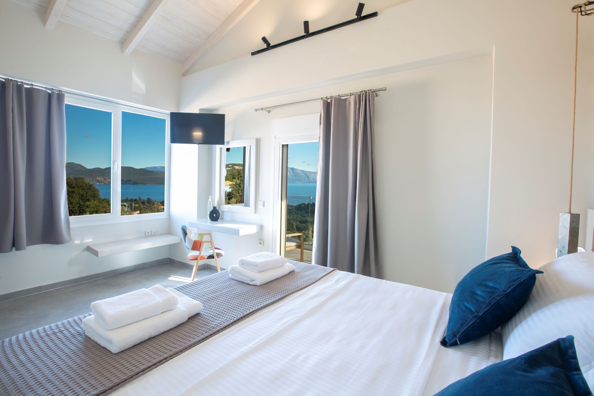 חדר שינה 1: מיטת קינג סייז, טלוויזיה, מרפסת עם נוף לים