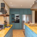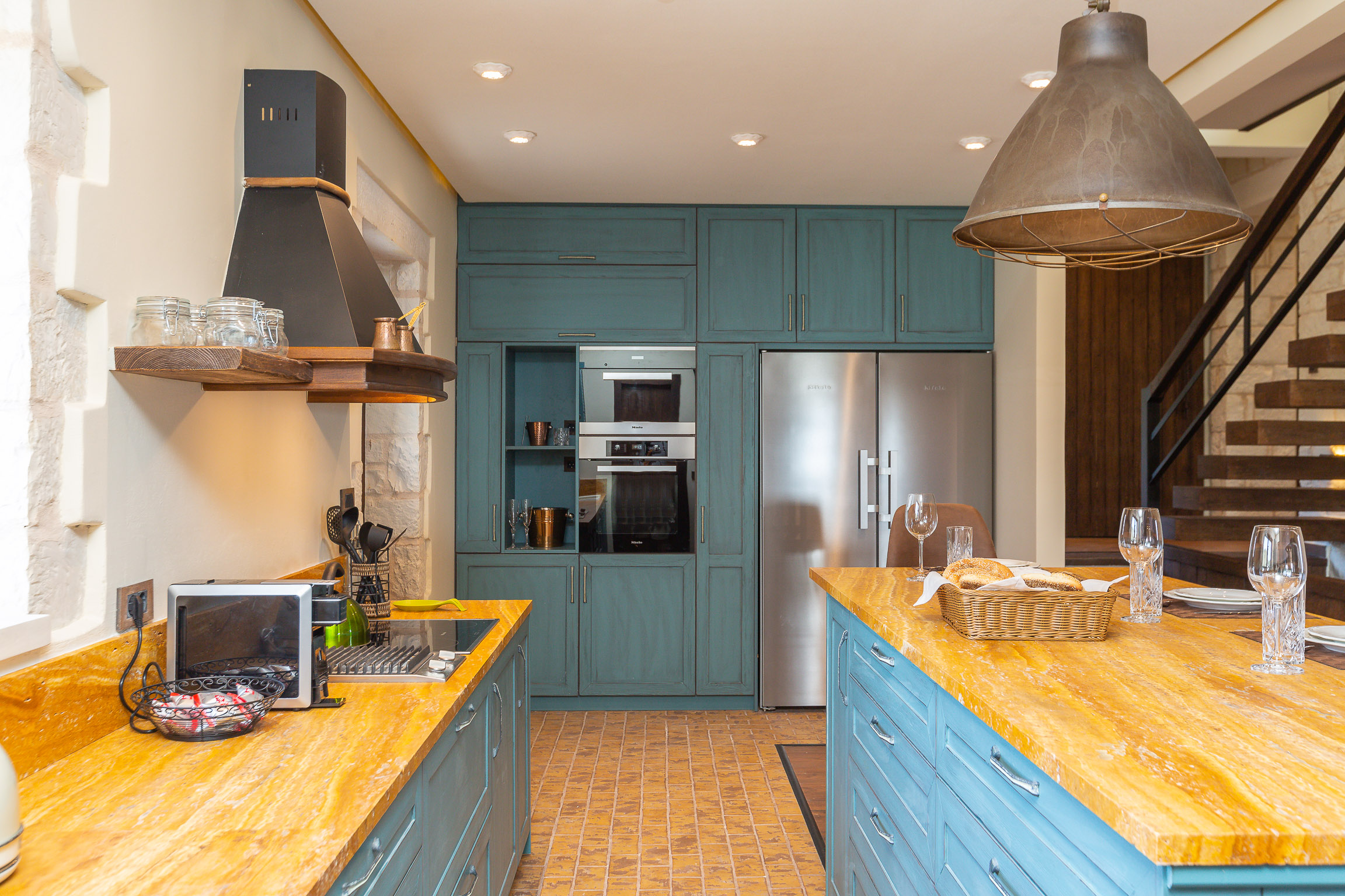 המטבח המאובזר במלואו עם דלפק האי ושרפרפים גבוהים כולל מכשירי Miele מובנים וגישה ישירה לכניסה האחורית של הוילה.