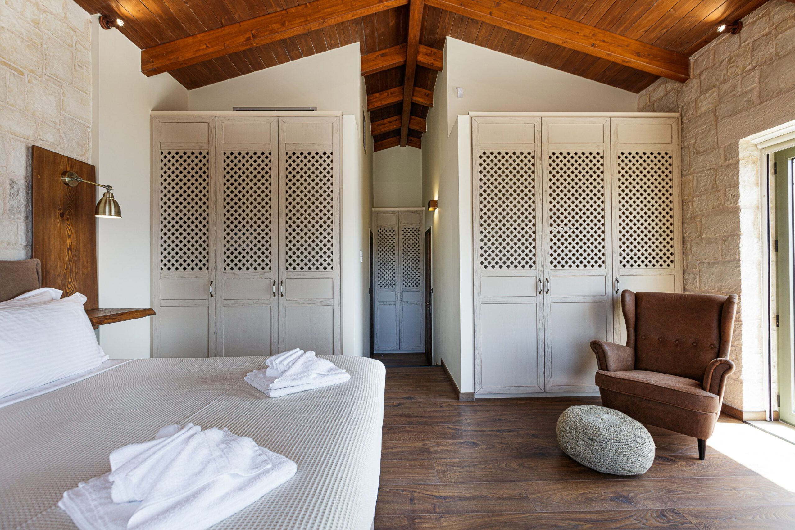 -מיטת קינג סייז (1,80 x 2,00), טלוויזיה בגודל 40 אינץ', חדר רחצה צמוד עם אמבטיה עם עיסוי , גישה ישירה למרפסת עם אזור ישיבה חיצוני גדול עם ספה מתחת לפרגולה.