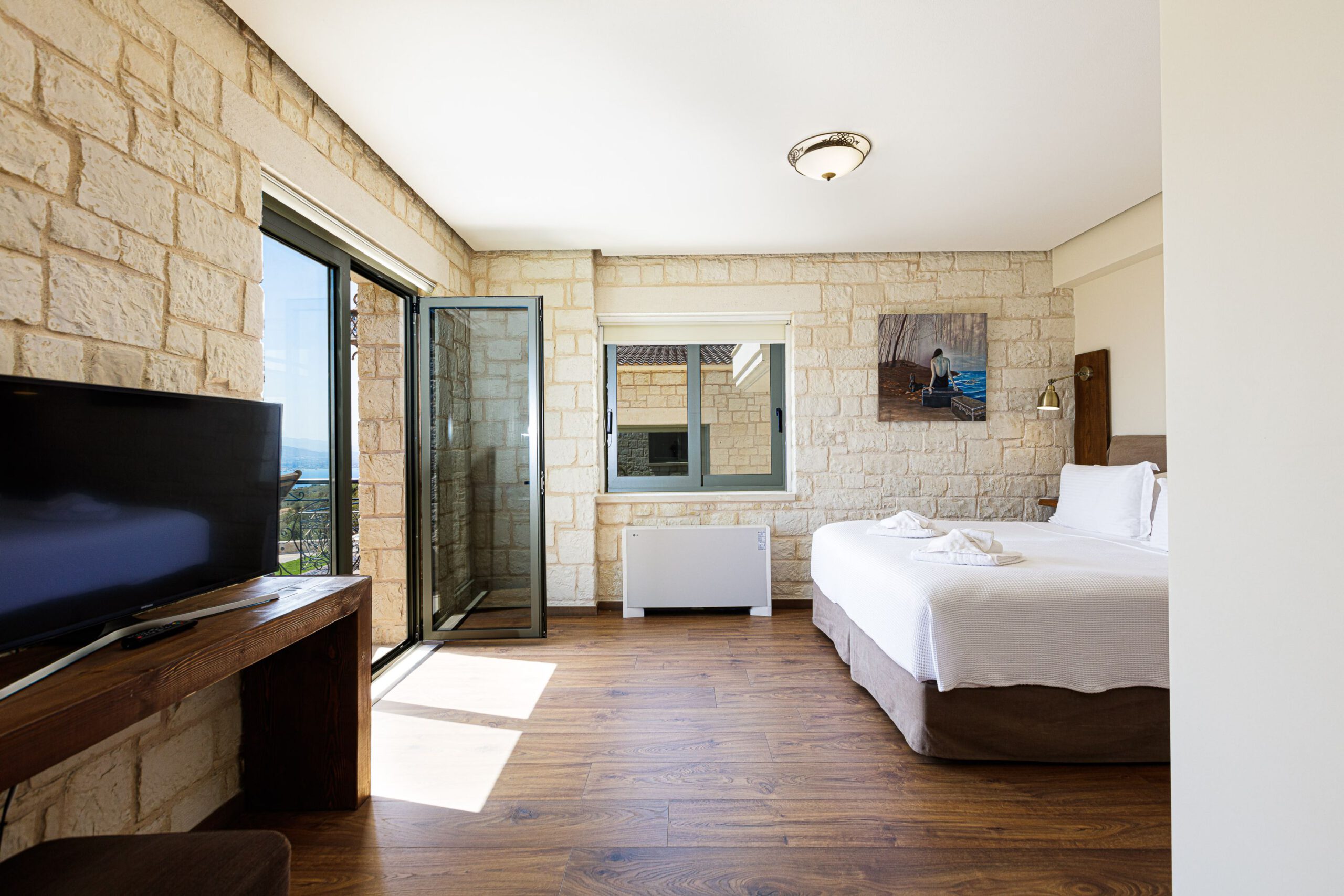 -מיטת קינג סייז (1,80 x 2,00), טלוויזיית HD בגודל 40 אינץ', גישה למרפסת עם ריהוט פטיו ונוף יפהפה לים, חדר רחצה צמוד עם אמבטיה ותא.