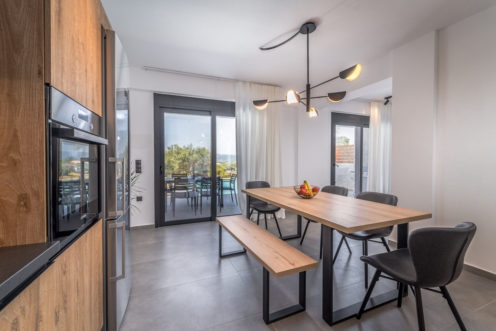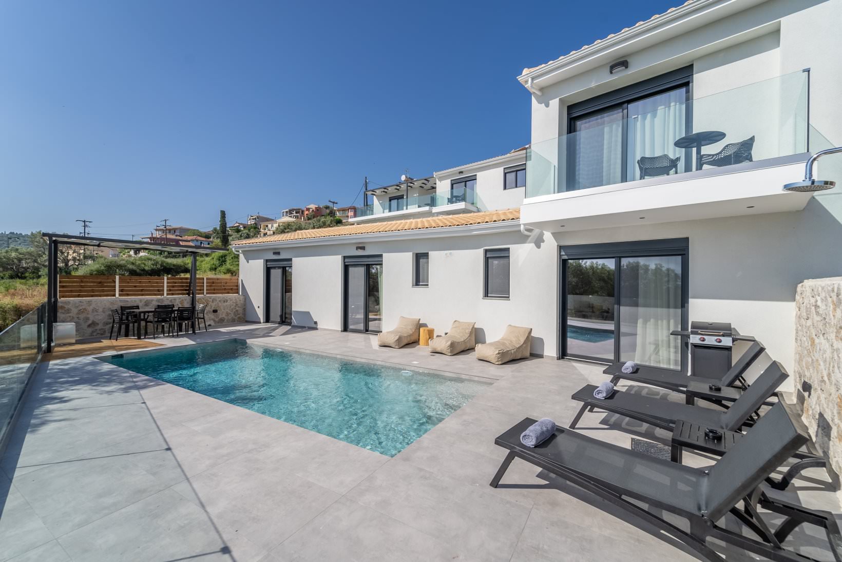 איזור חיצוני בריכה ,כסאות נוח ופופים ,-BBQ ,פינת אוכל חיצונית מוצלת על ידי פרגולה גדולה.